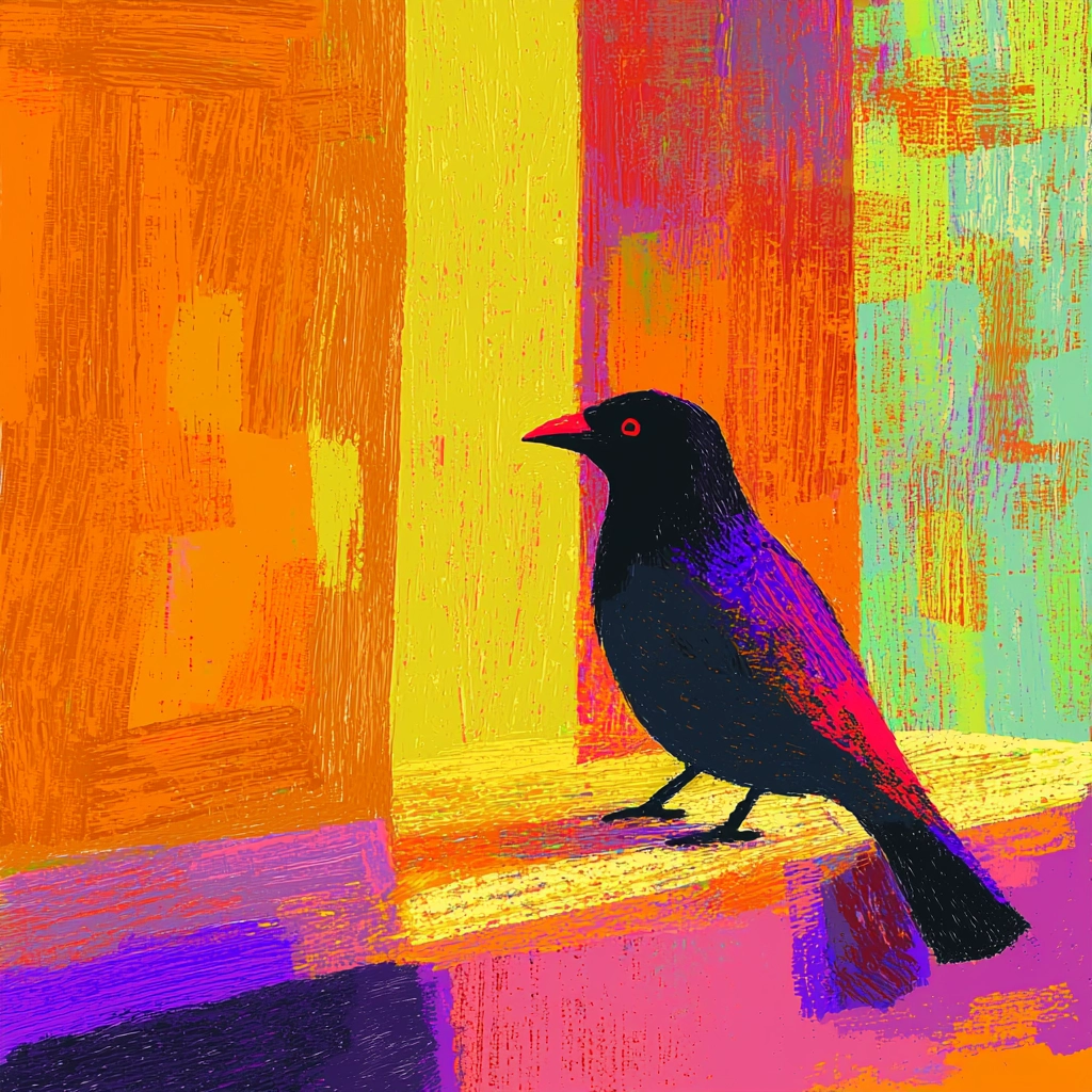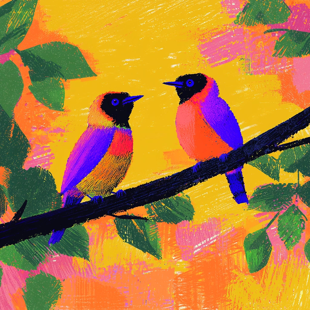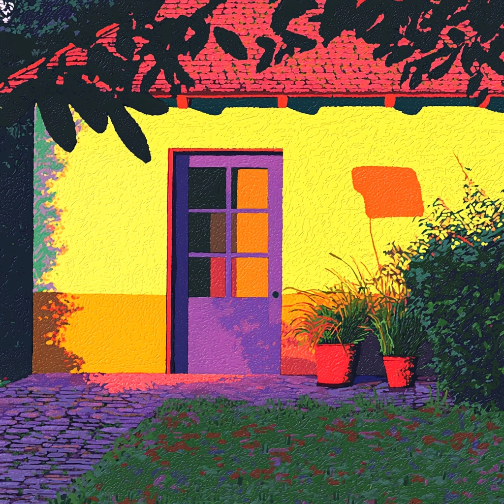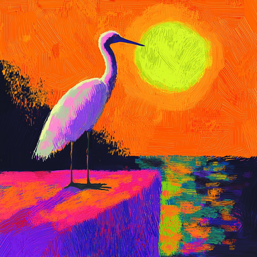 The composition exhibits vibrant neon lighting paired with high contrast elements. Colors are bold and expressive, creating dynamic scenes. Brushstrokes add textured layers, enhancing depth and visual interest.