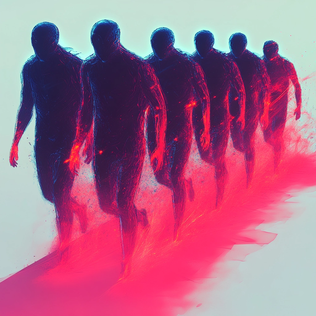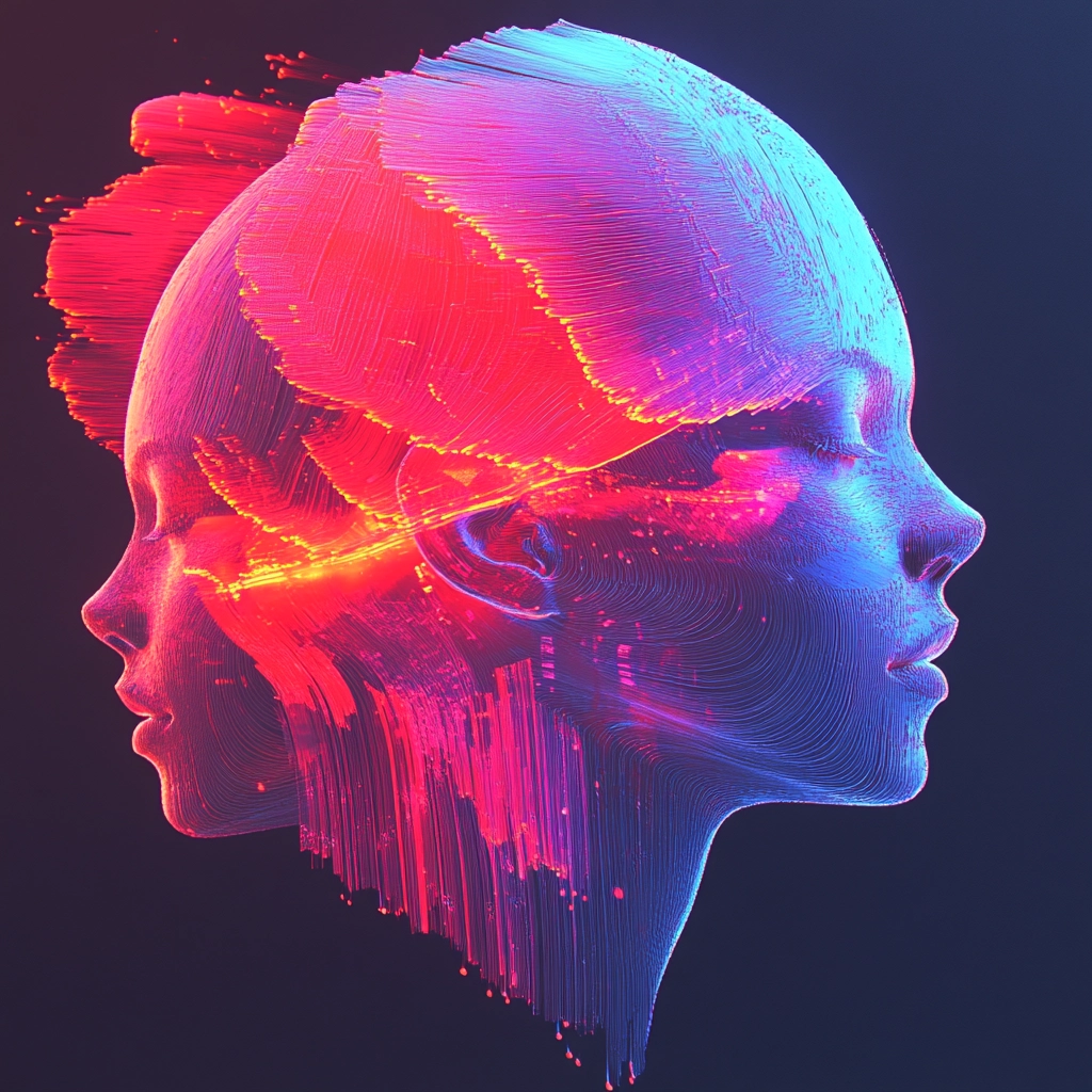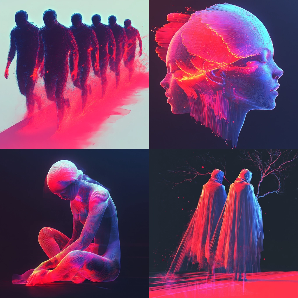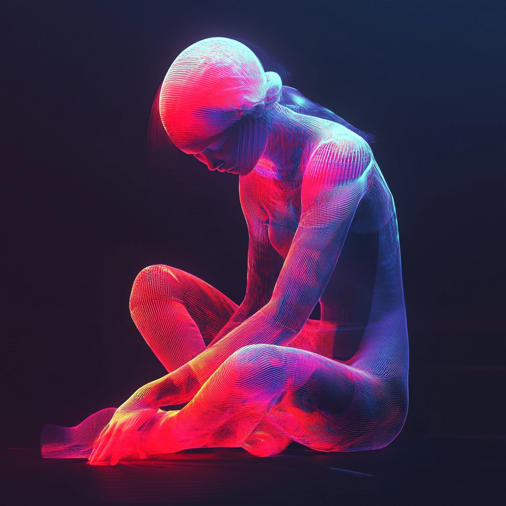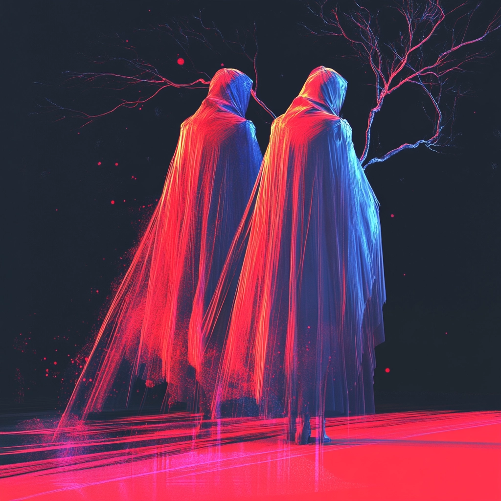 Intense lighting effects emphasize ethereal forms, with vivid red and blue hues creating strong contrasts. The use of light and color creates depth and layered textures, enhancing the three-dimensional quality. The play of neon colors and shadows provides a distinct spatial arrangement.