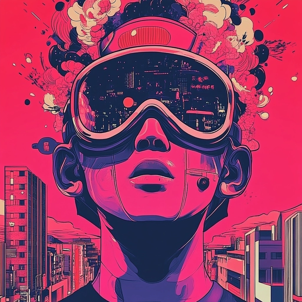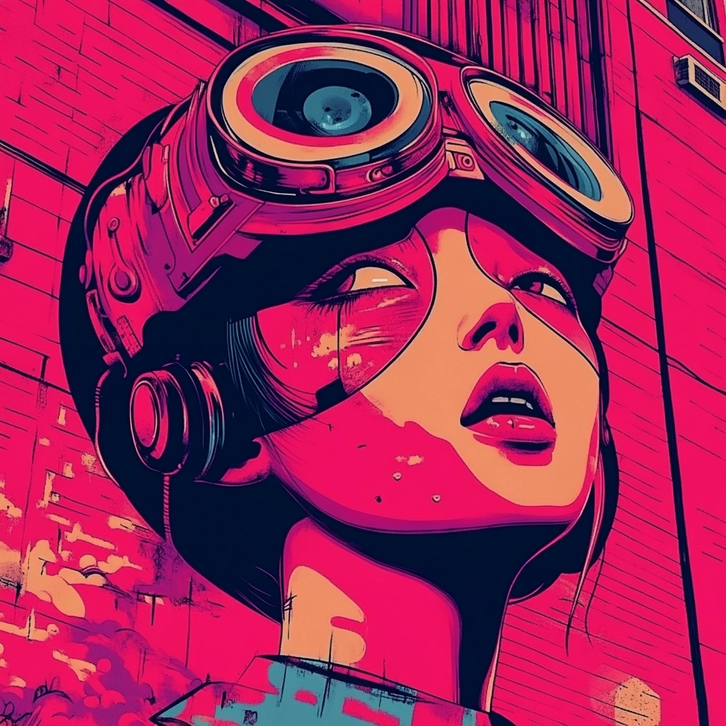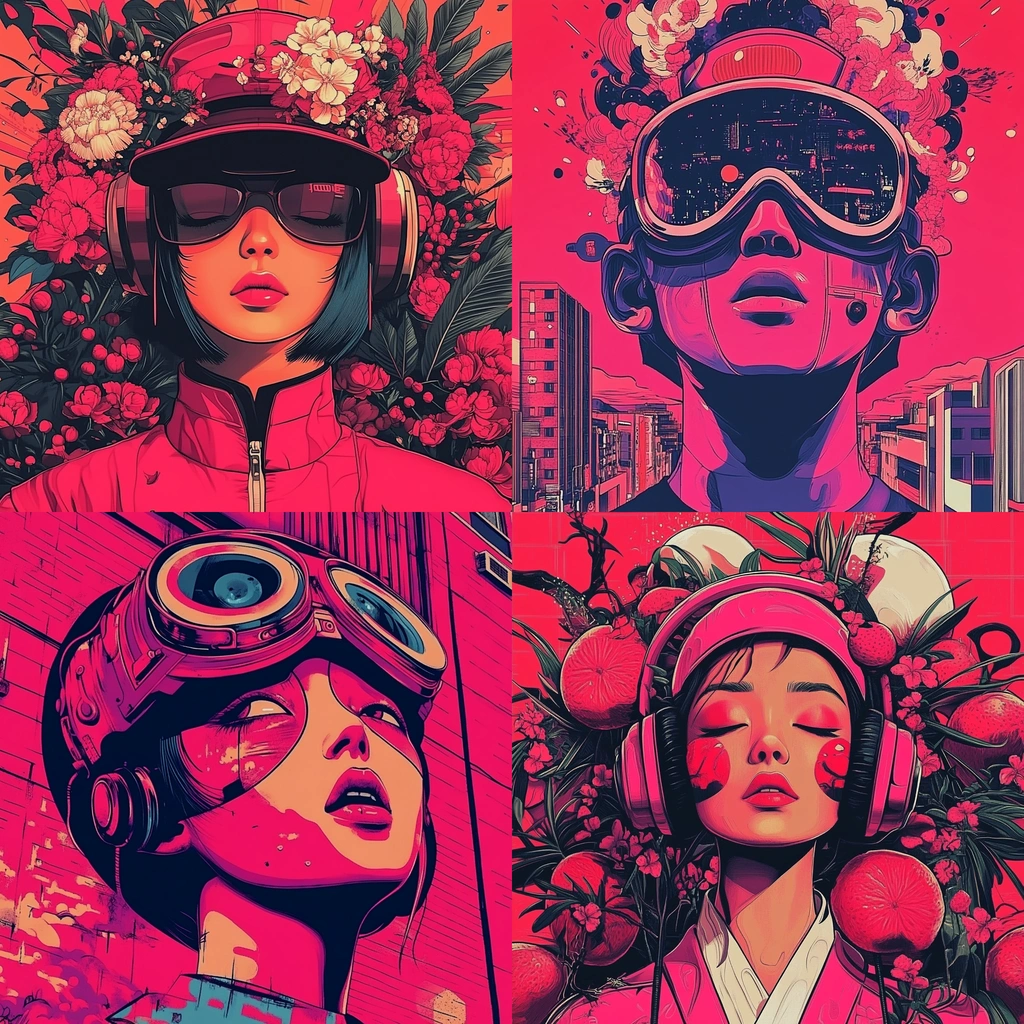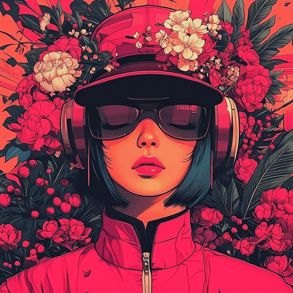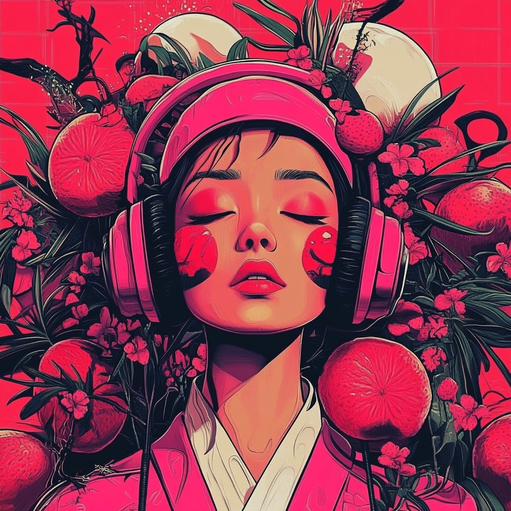 Dynamic neon lighting enhances the sharp contrasts between vibrant reds and pinks against subdued greens. Detailed textures emphasize organic and geometric forms, giving depth and balancing visual intensity.
