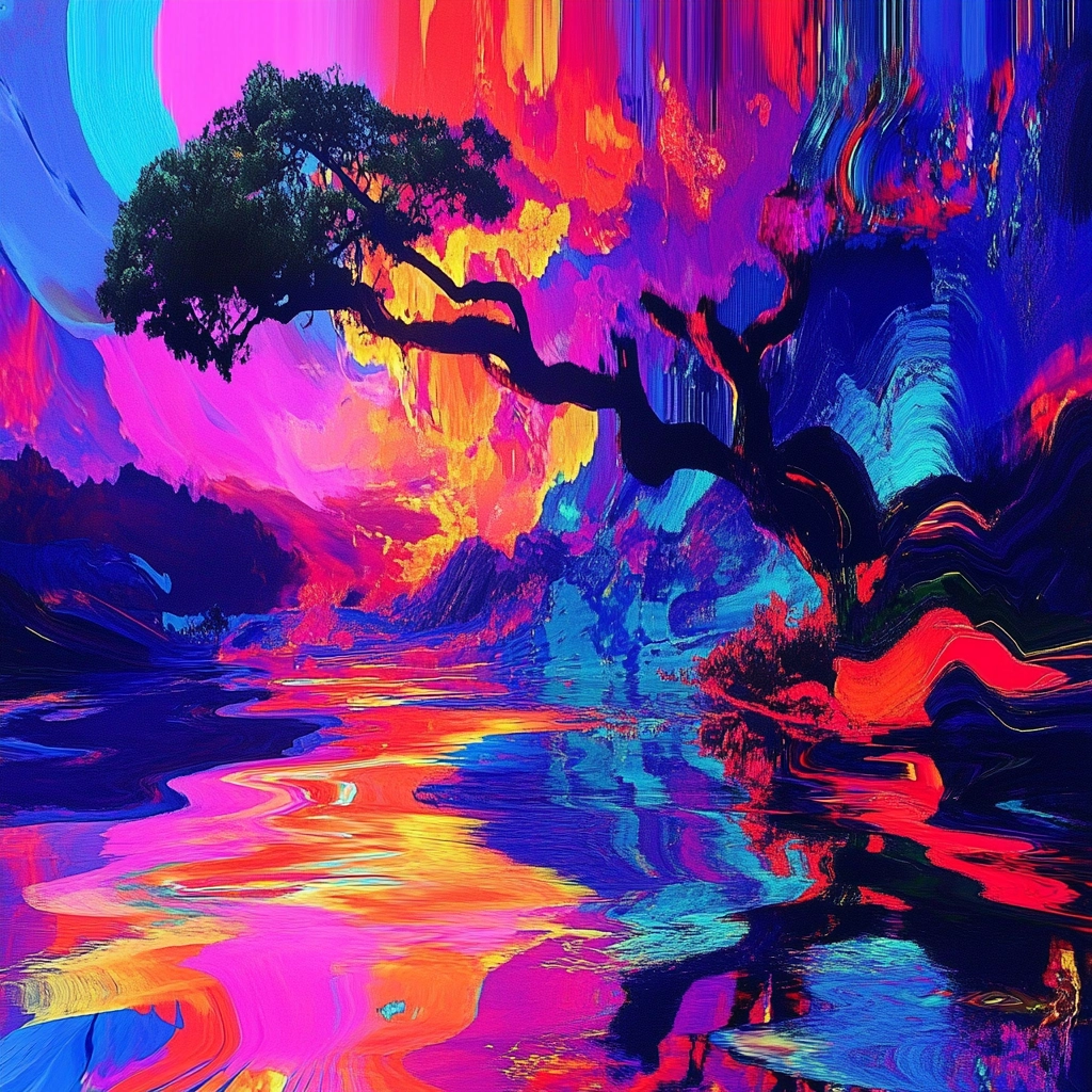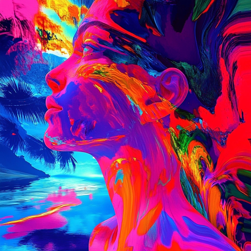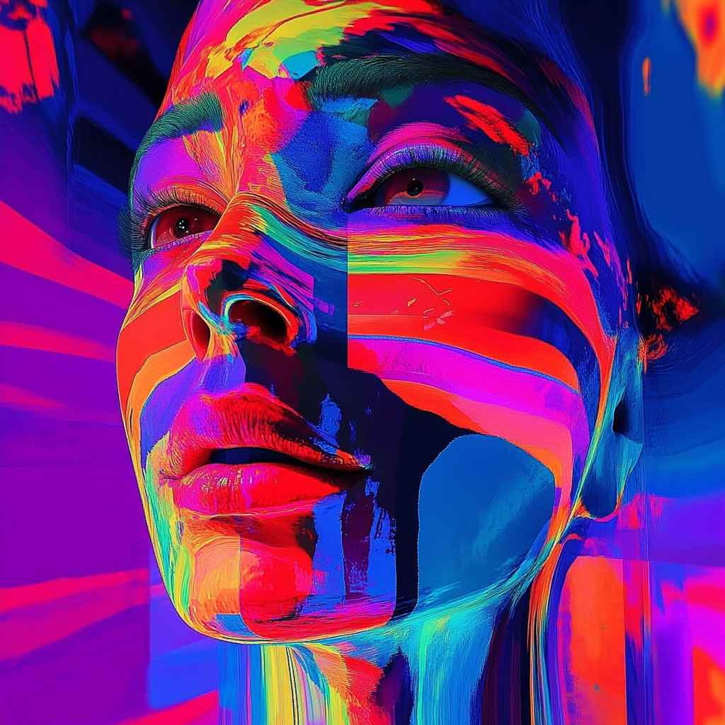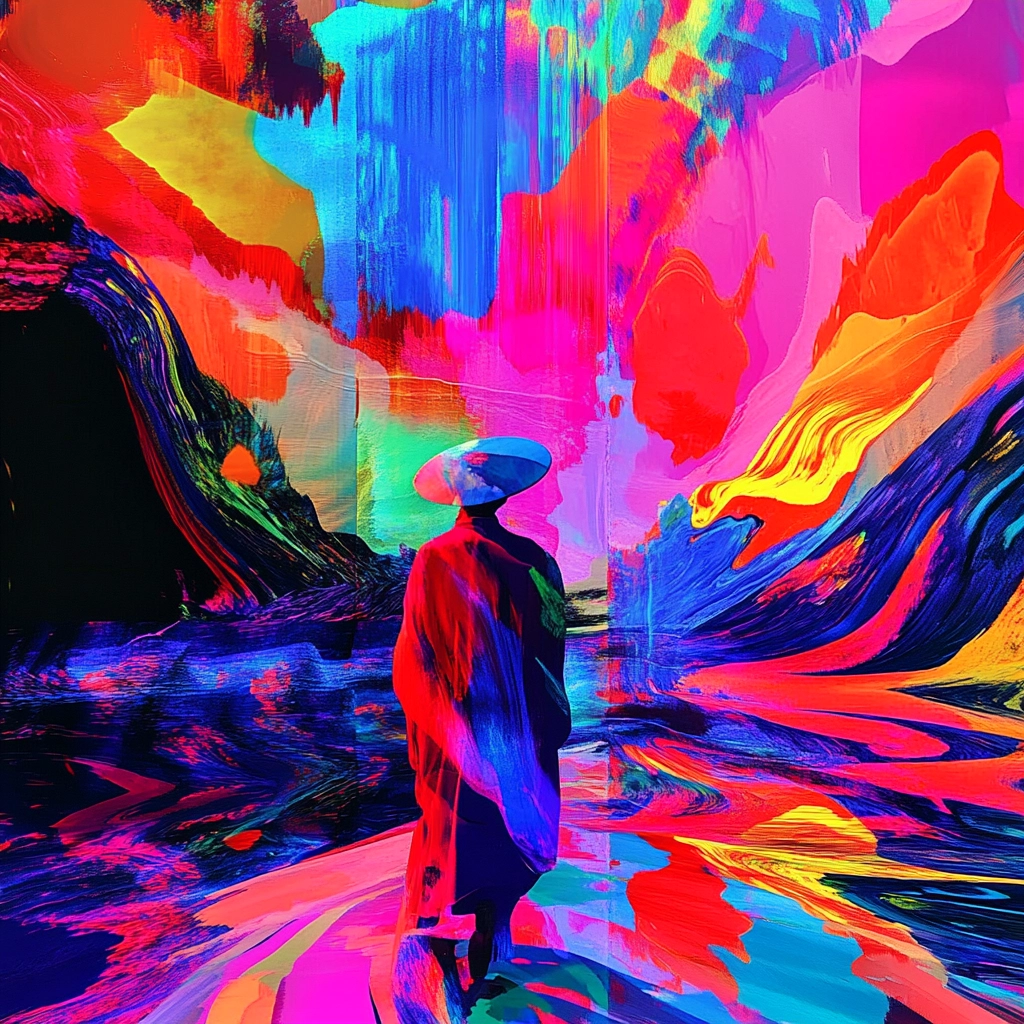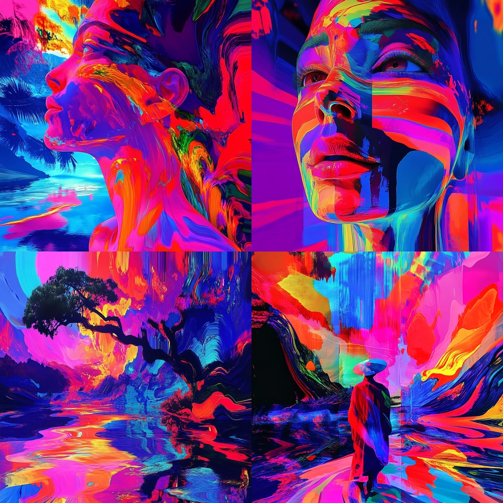 Bright neon hues dominate swirling dynamic compositions.