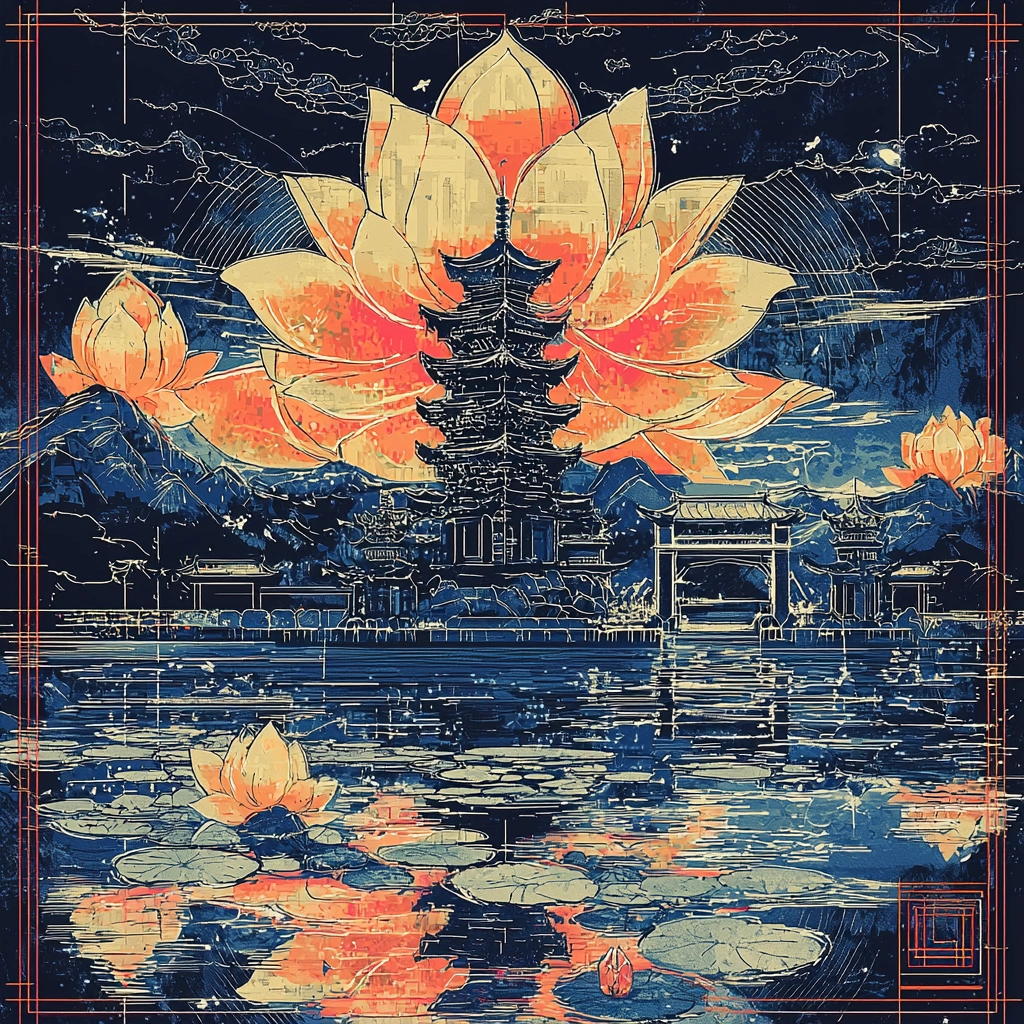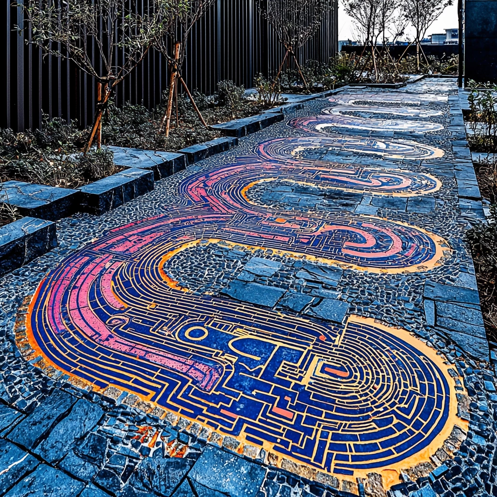 Vibrant hues and intricate patterns create a dynamic spatial composition.
