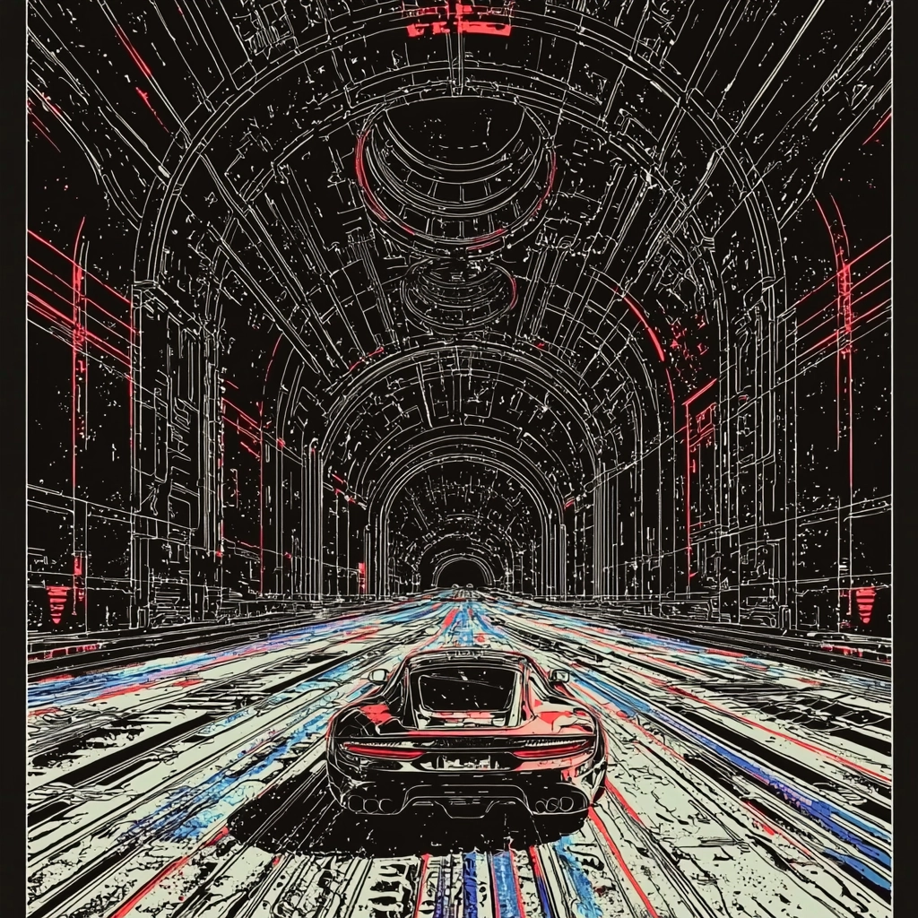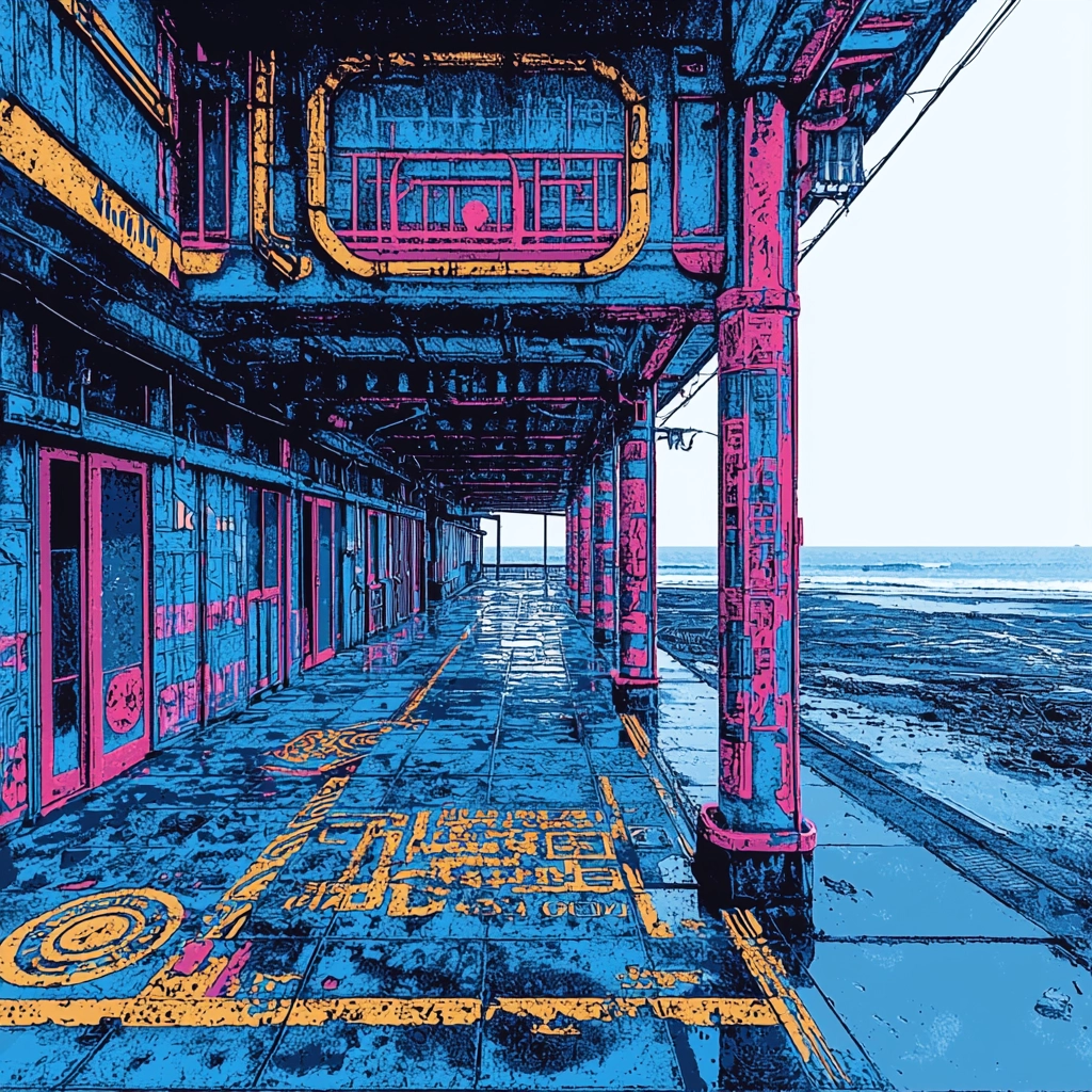 Intense and vivid lighting enhances sharp contrasts between cool blues and warm reds, projecting a surrealistic spatial illusion with precise geometric textures. The interplay of lines and forms sharpens the visual intrigue and depth.