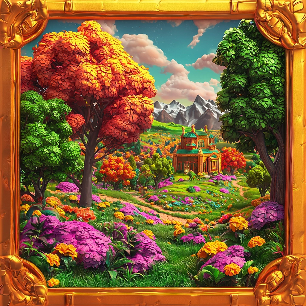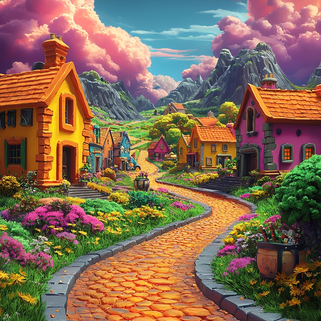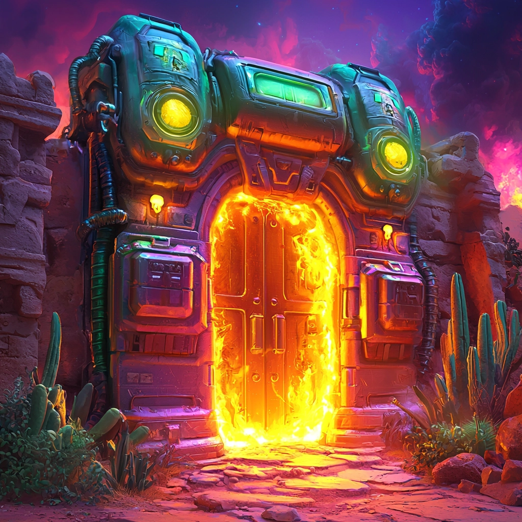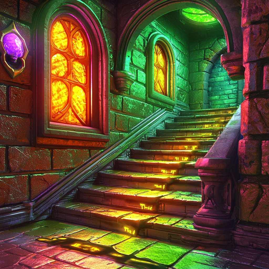 The lighting features bright neon illumination that defines architectural edges with a vivid glow, establishing an intense spatial dynamic. Texture expression is rich, with articulate detailing that enhances the vivid layering of colors.