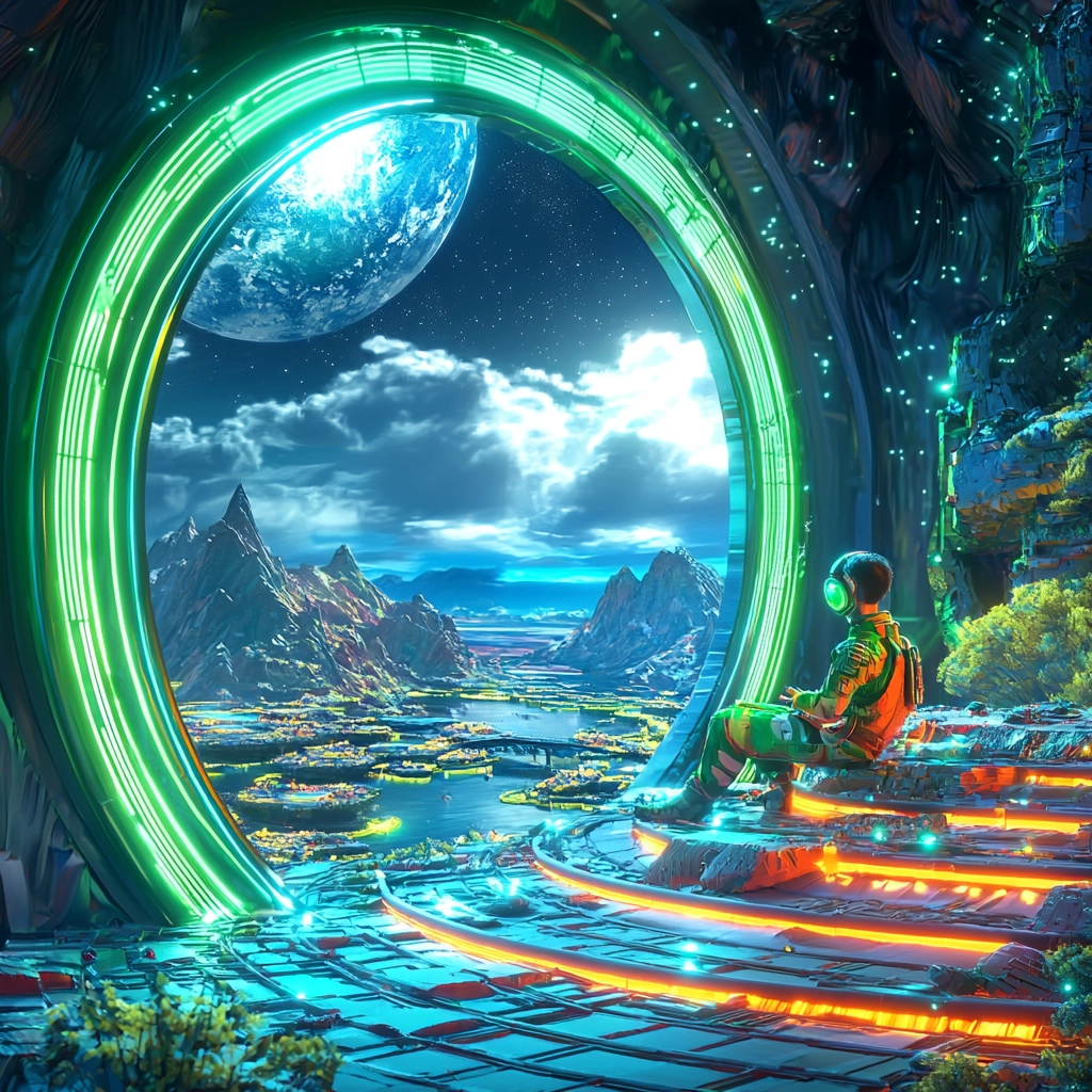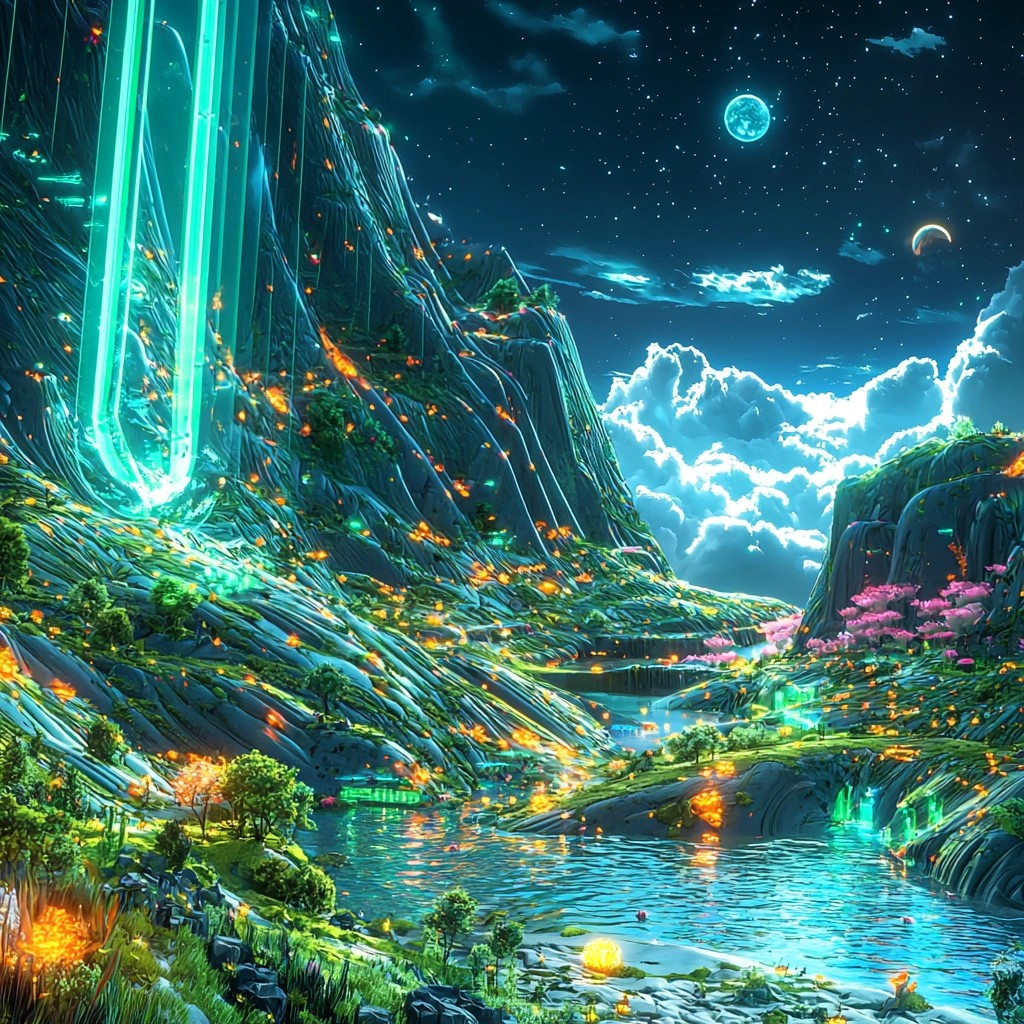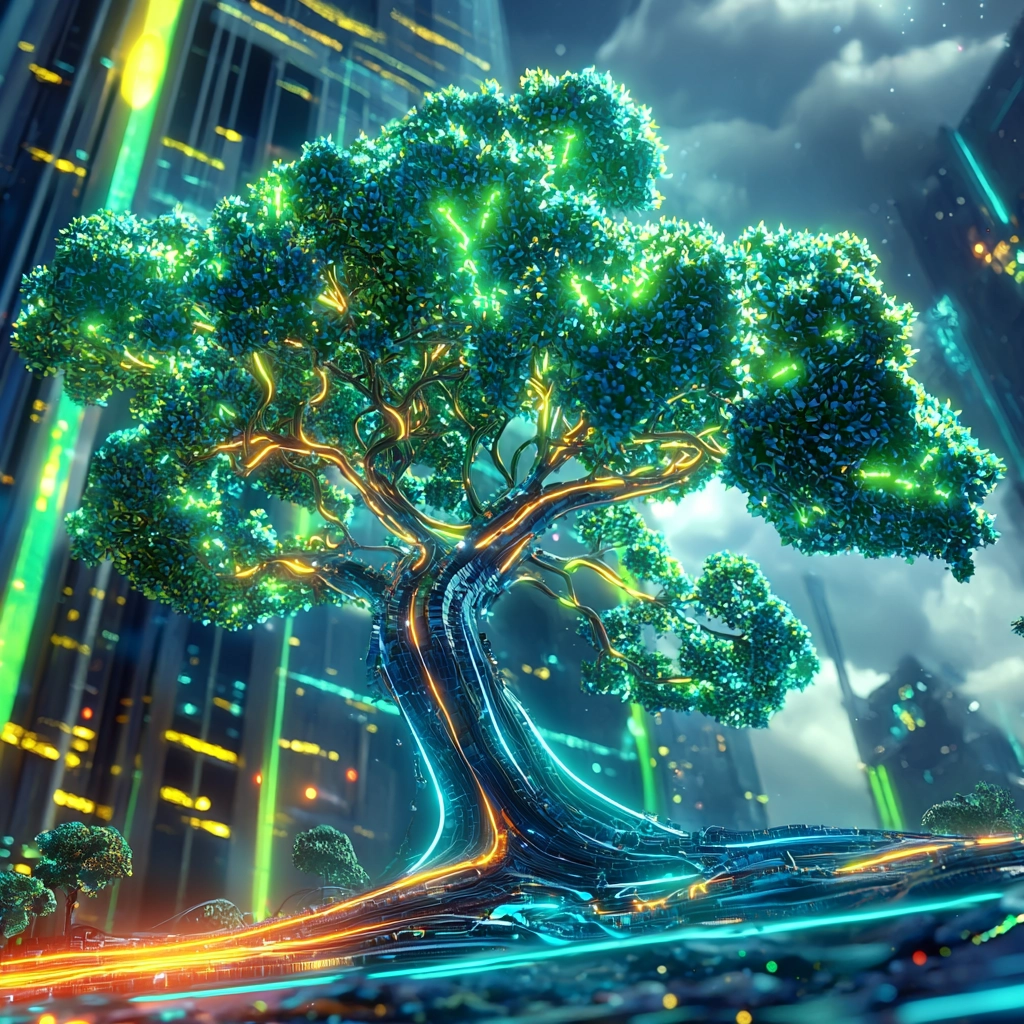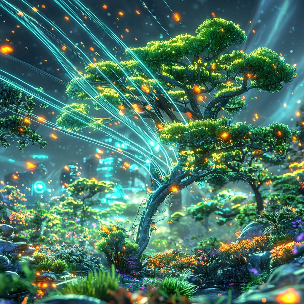 Intense neon lighting effects highlight the intricacy of nature and artificial constructs, with colors blending dynamically against a dark background. The use of clean lines and fluid luminescence creates a sense of expansive depth and vibrancy.