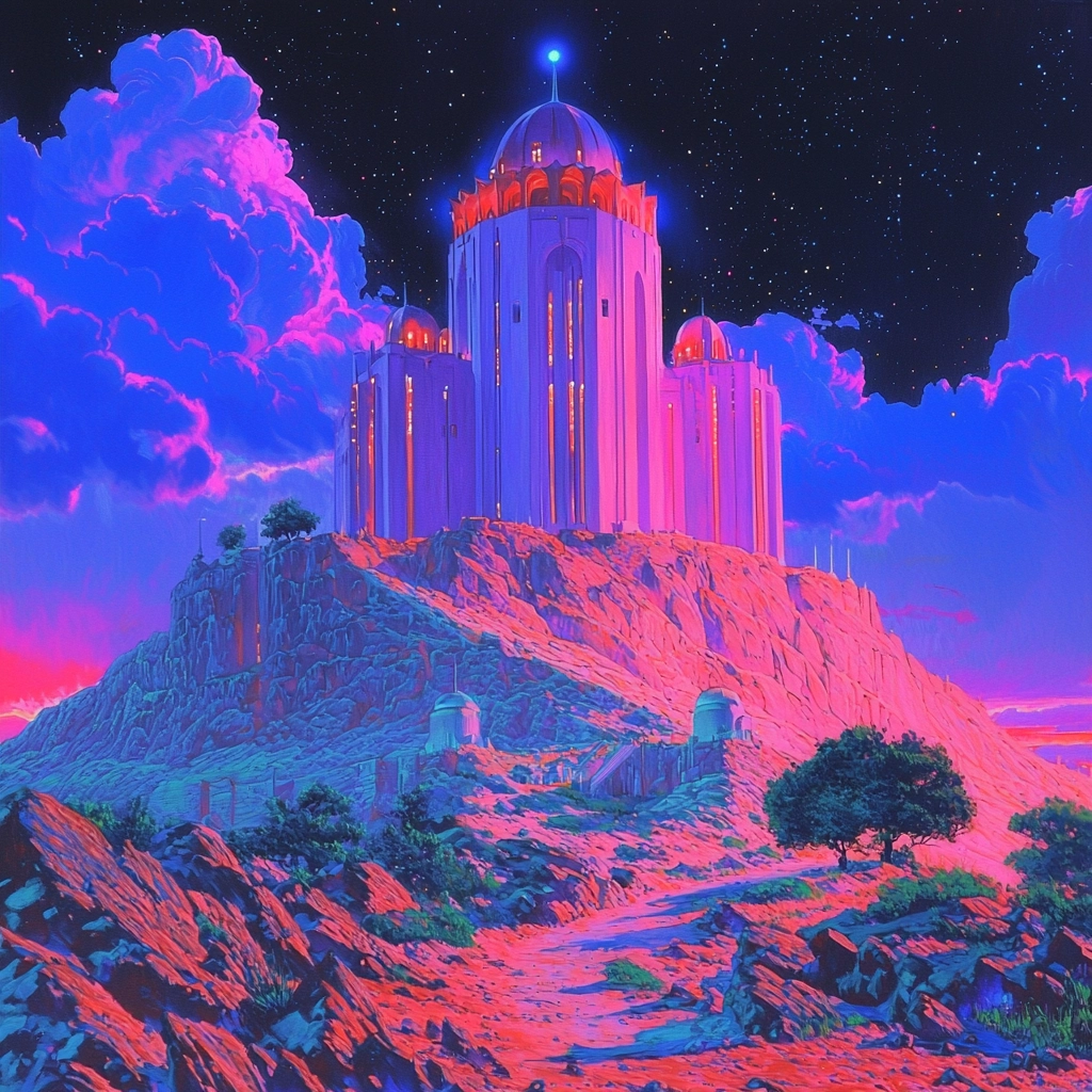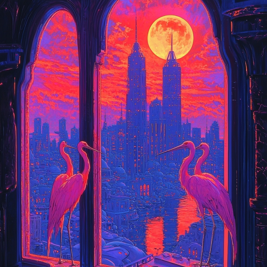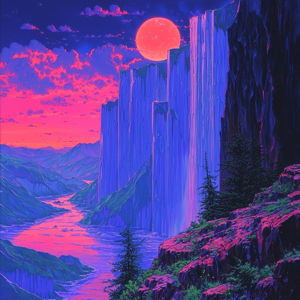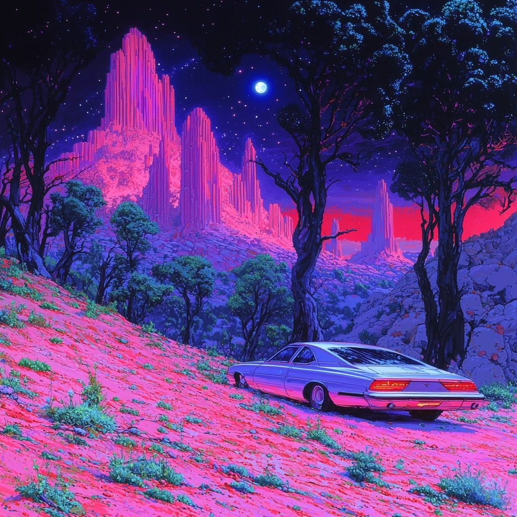 Vibrant neon tones illuminate a surreal nighttime environment.