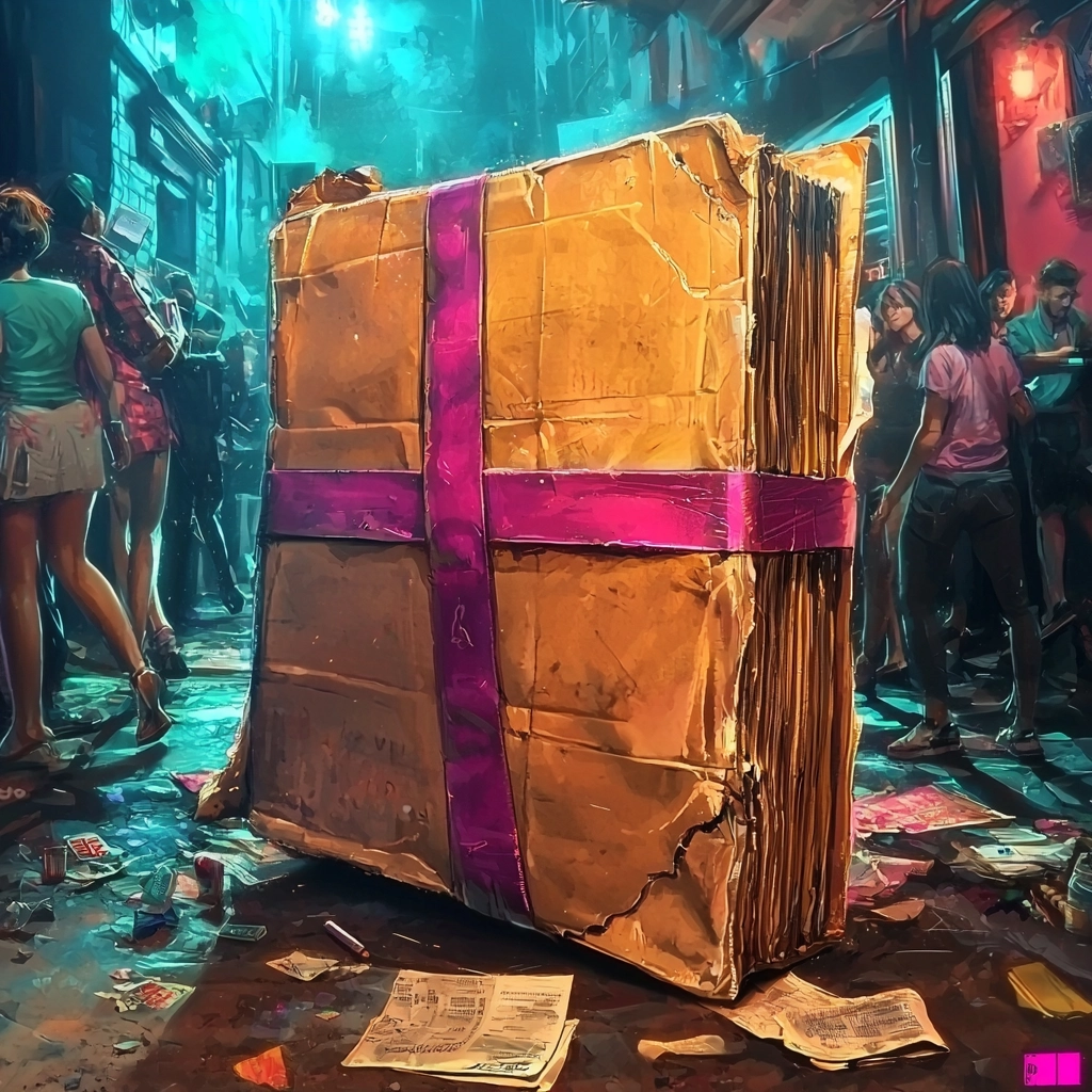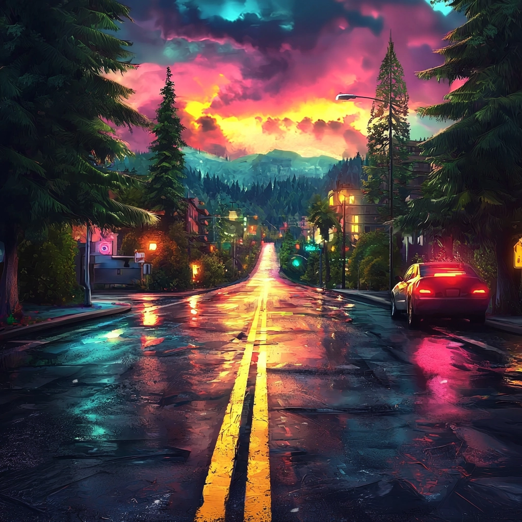 The lighting creates stark contrasts, with neon tones enhancing depth and spatial vibrancy. Color is vivid and dynamic, weaving through compositions with fluid transitions, while textures provide tactile realism against highly saturated hues.