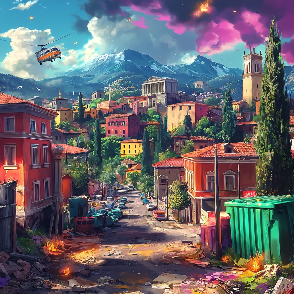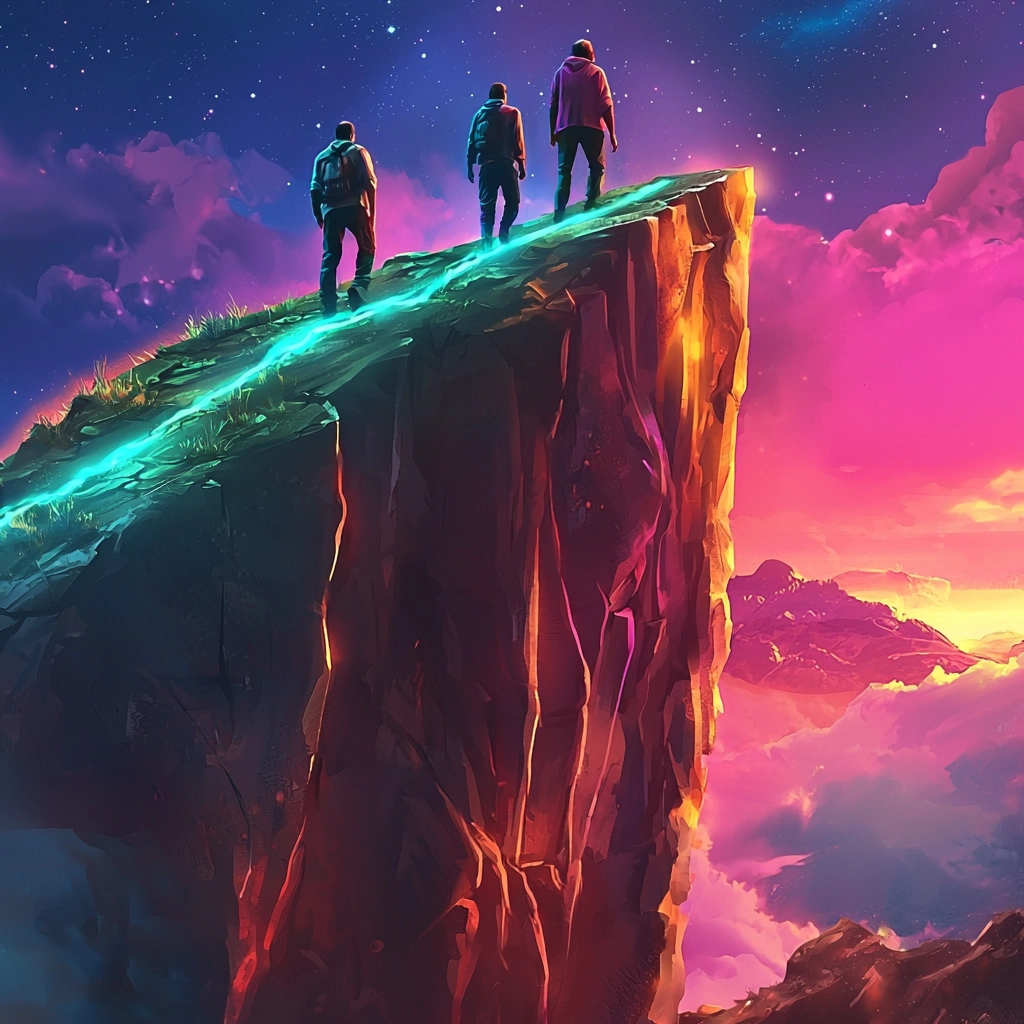 High contrast neon colours illuminate vivid scenes within diverse environments, emphasizing rich palettes.