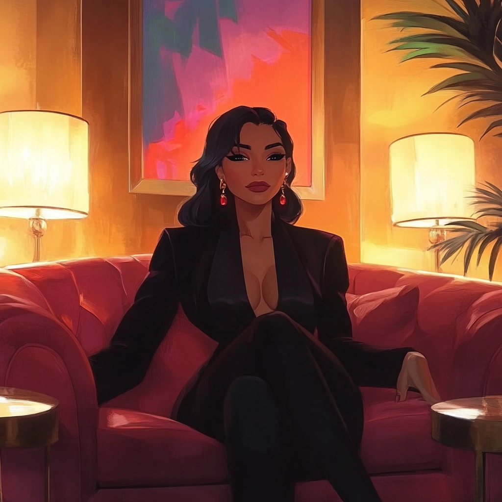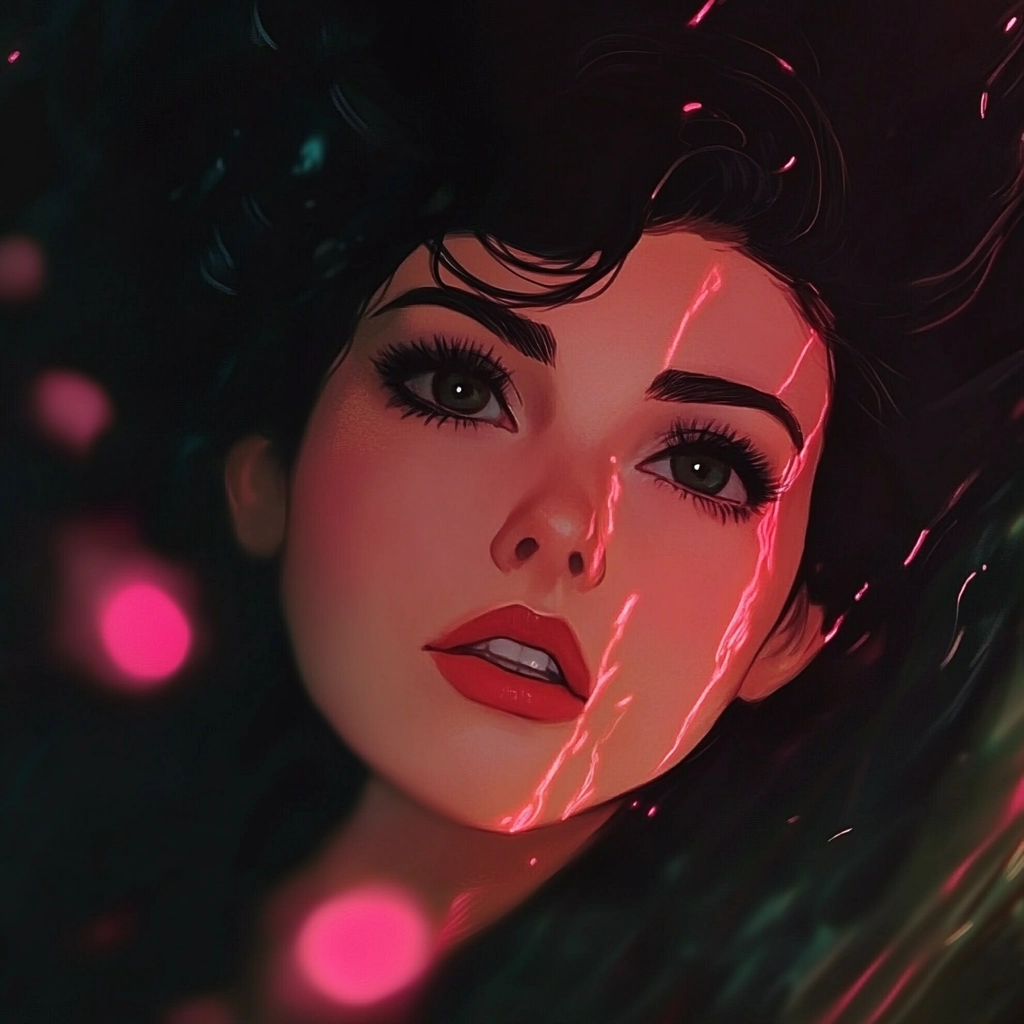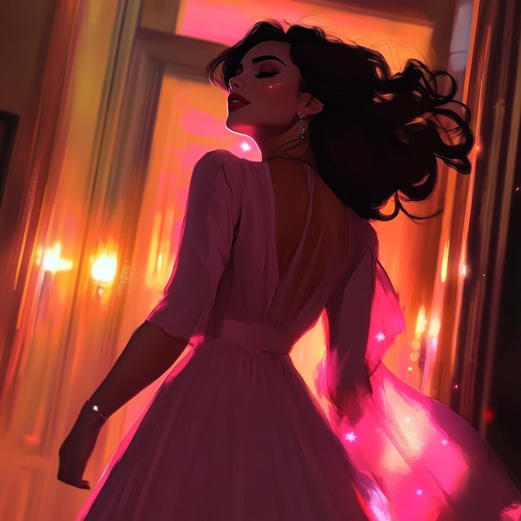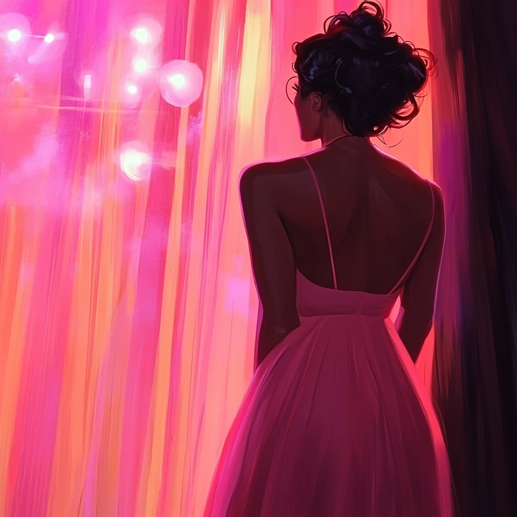 The lighting effects create dramatic contrasts, casting vibrant neon colors that illuminate the scenes. The pink and yellow hues dominate, enriching the spatial sense with depth and texture. Brush strokes and shading techniques add to realism and vibrancy.