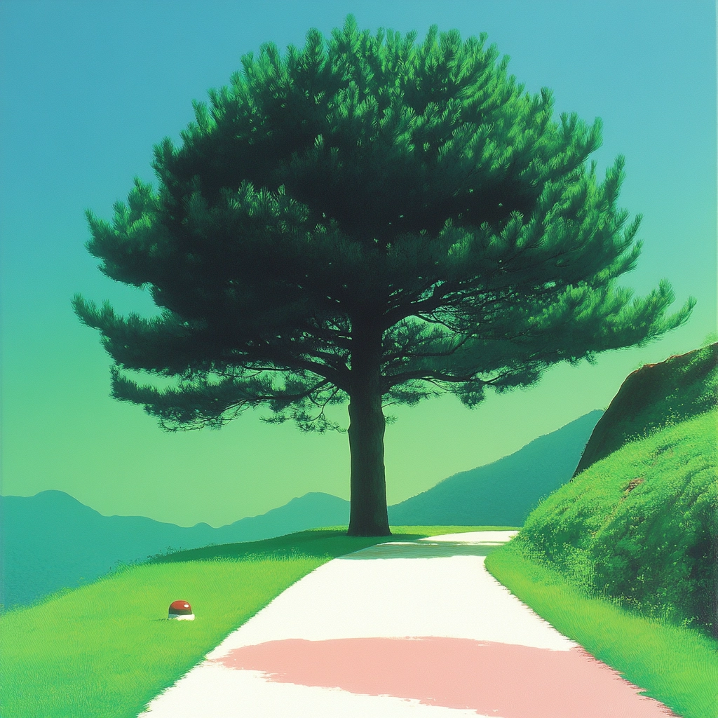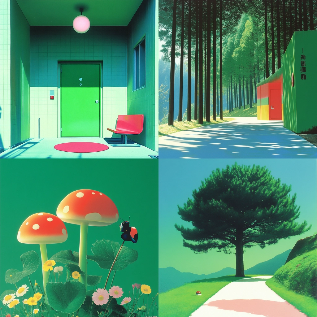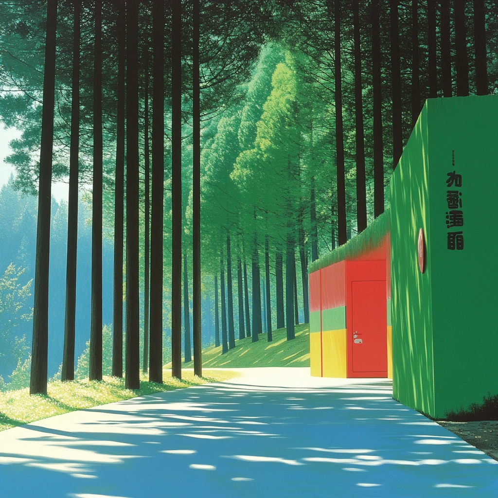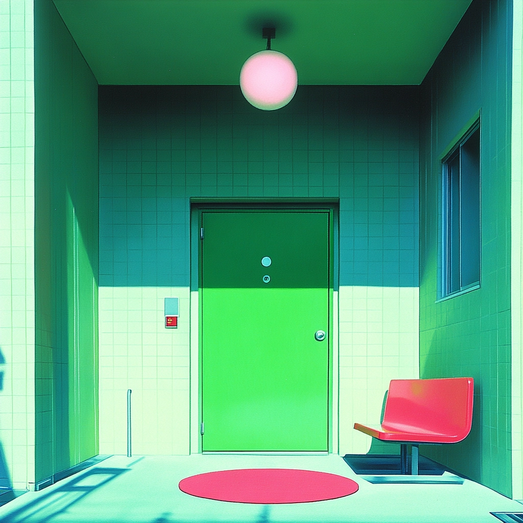 Lighting contrasts highlight vivid colors, giving a three-dimensional feel to flat surfaces. The uniform texture and bold hues enhance sharp edges and defined spaces, while the color saturation contributes to a surreal visual clarity.