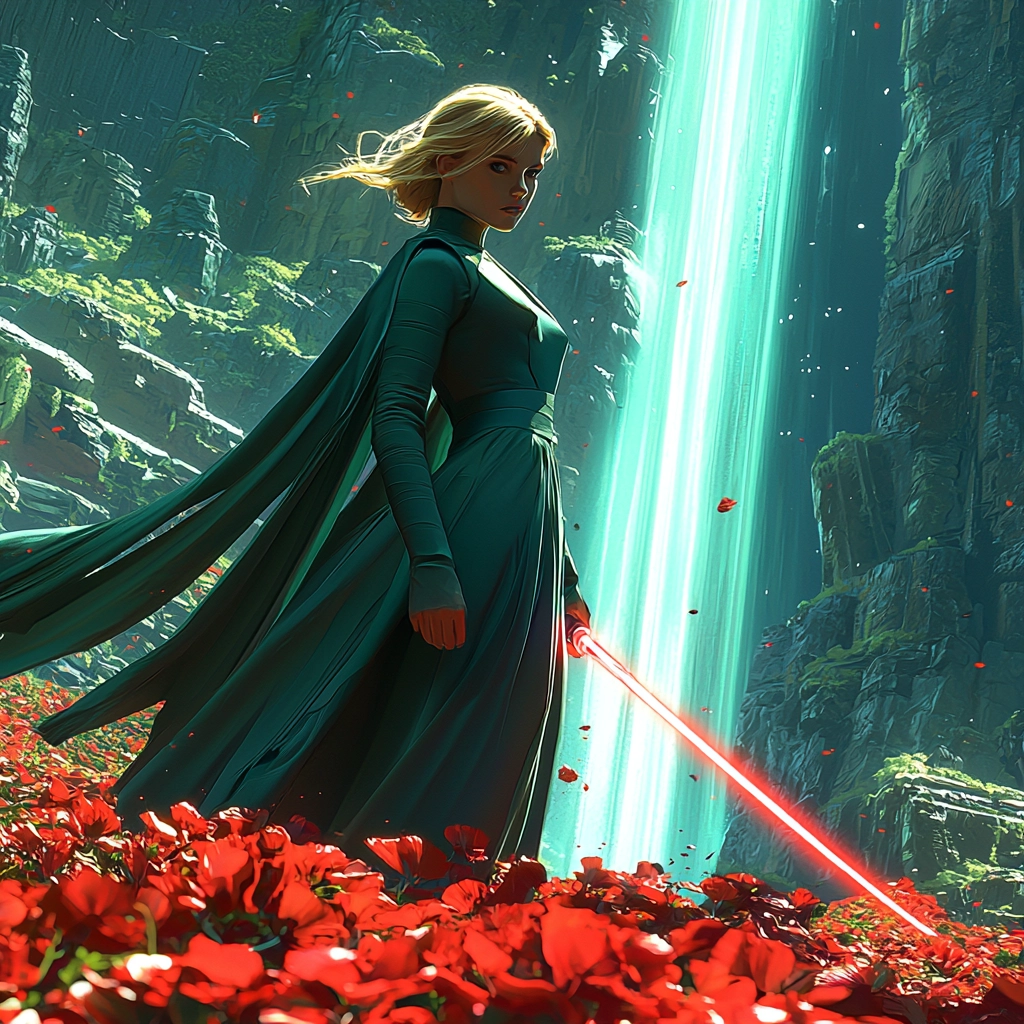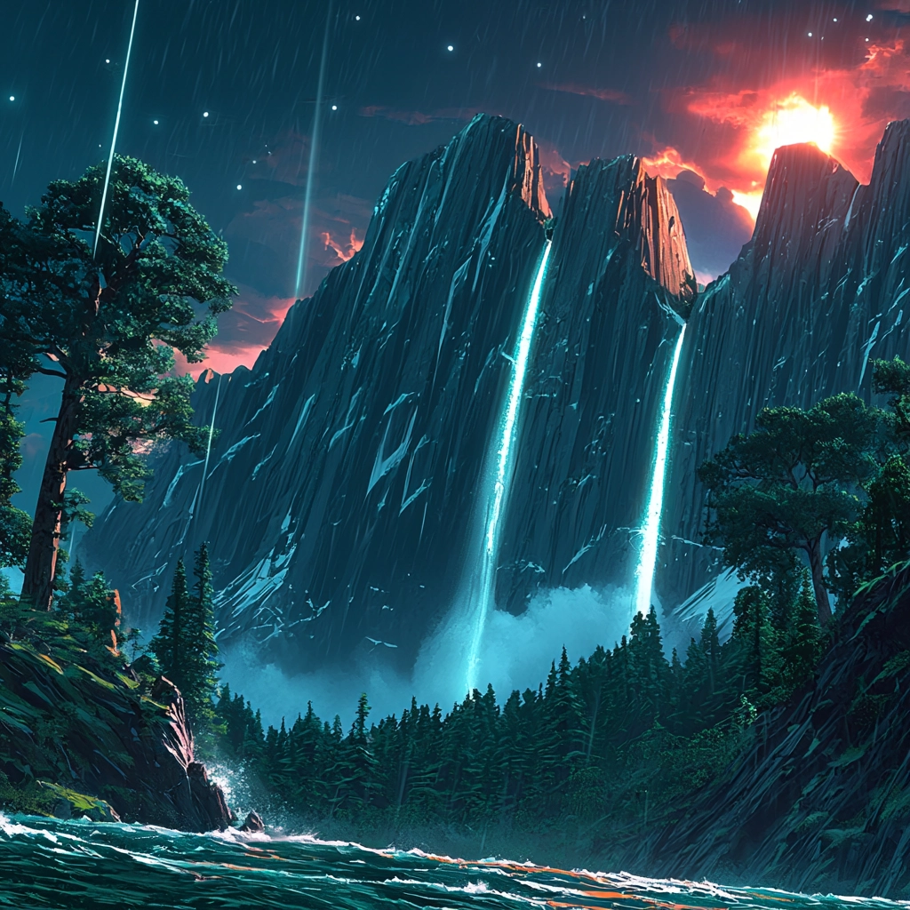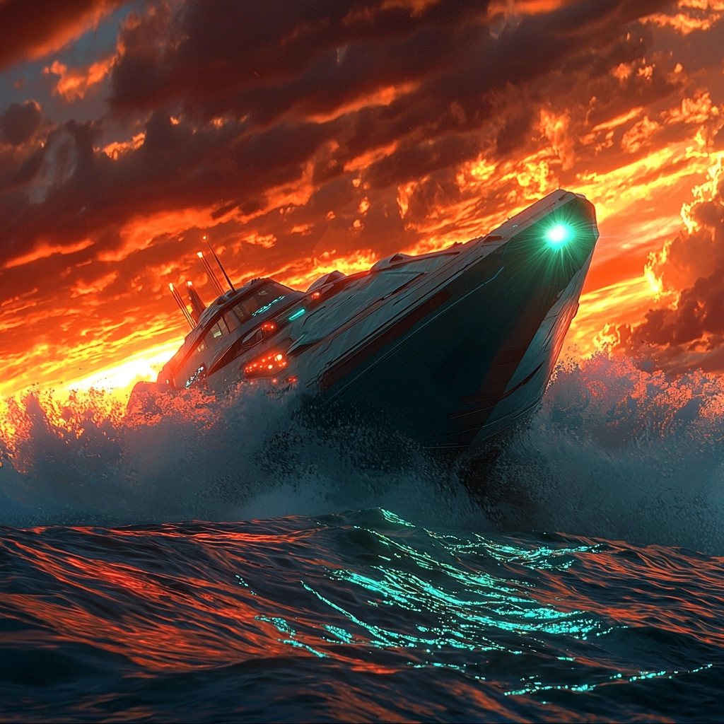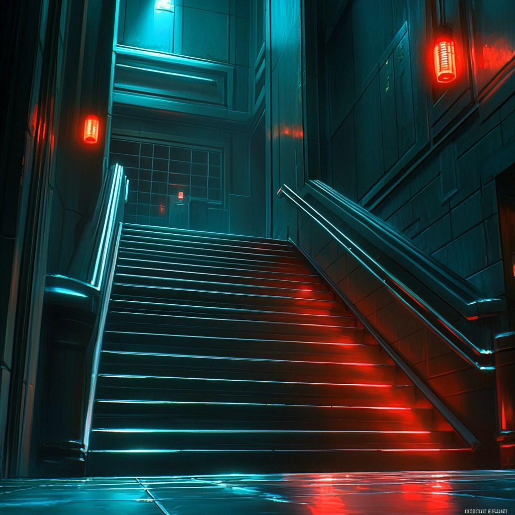 The lighting is sharp and intense, with a strong focus on contrast between bright neon highlights and deep shadows. Colors are bold and saturated, creating a rich visual experience. The textures are smooth, enhancing the sense of depth and clarity.