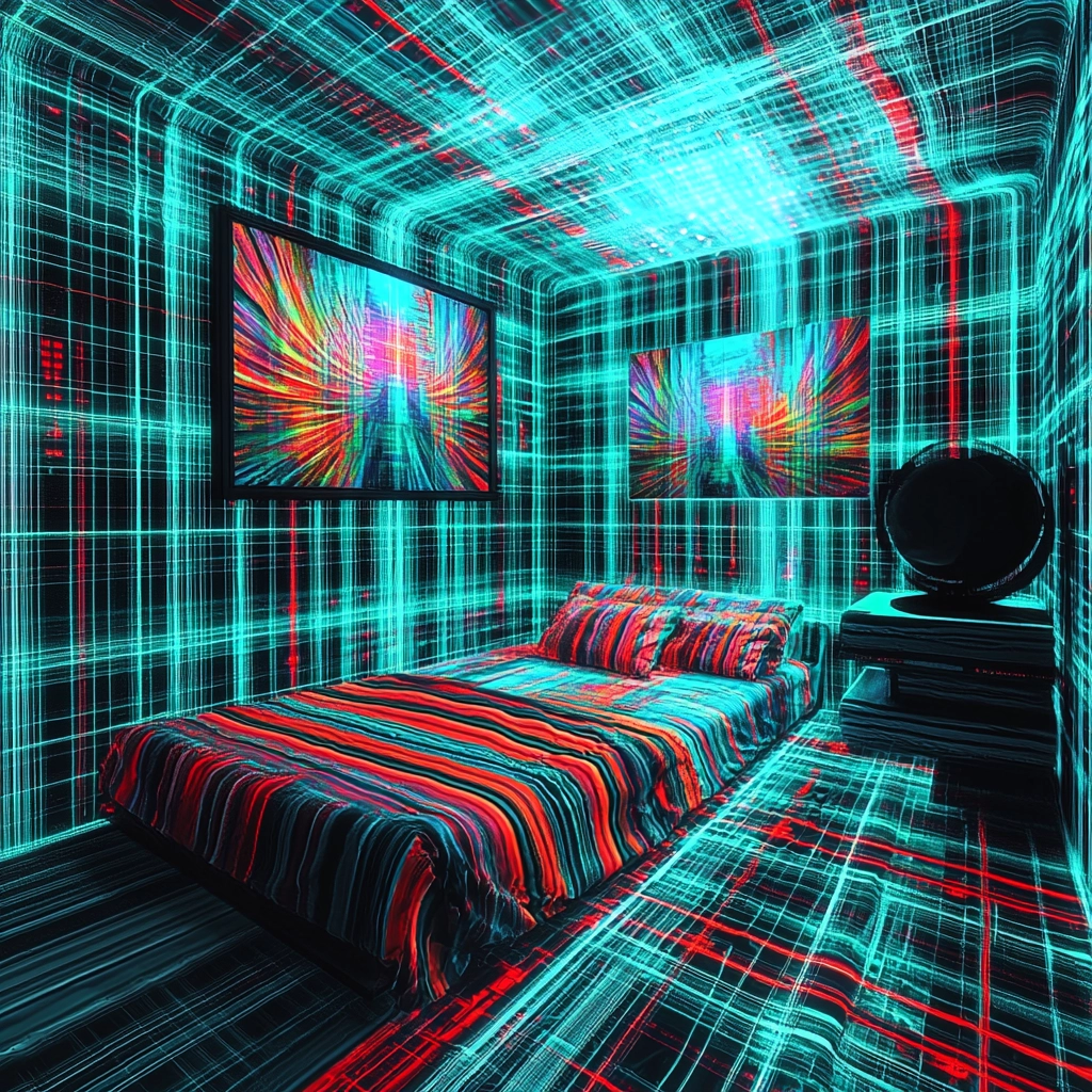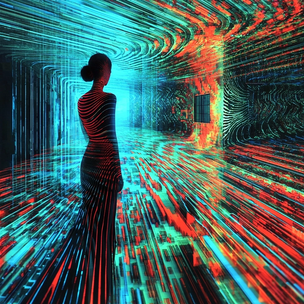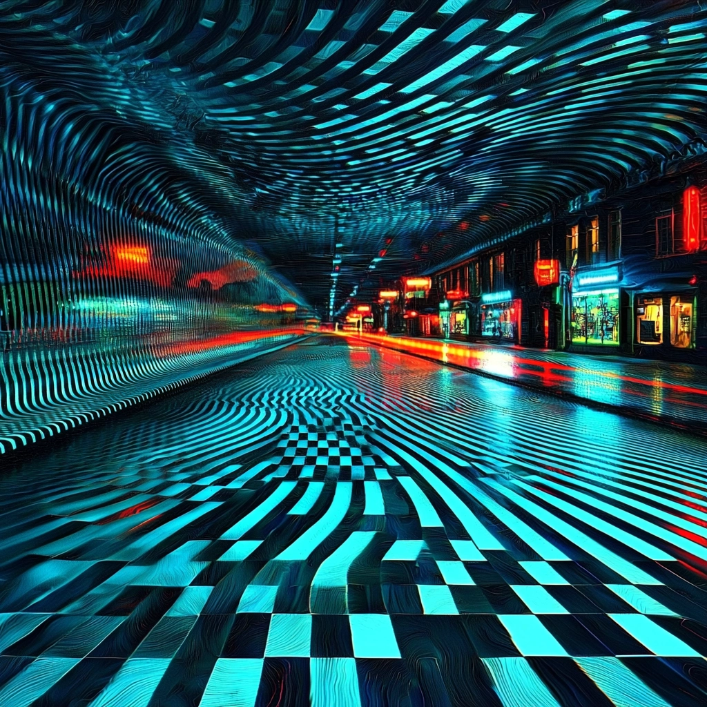Strong neon lighting creates high contrast with vividly saturated blue and red hues. The sense of depth is amplified by linear perspective and rhythmic patterns, giving a spatially immersive, almost pulsating, texture feel.