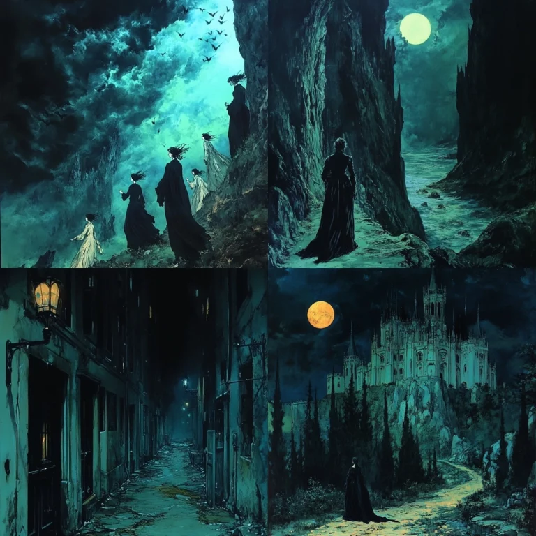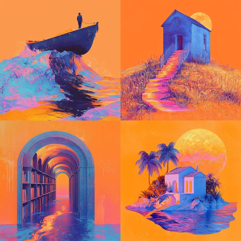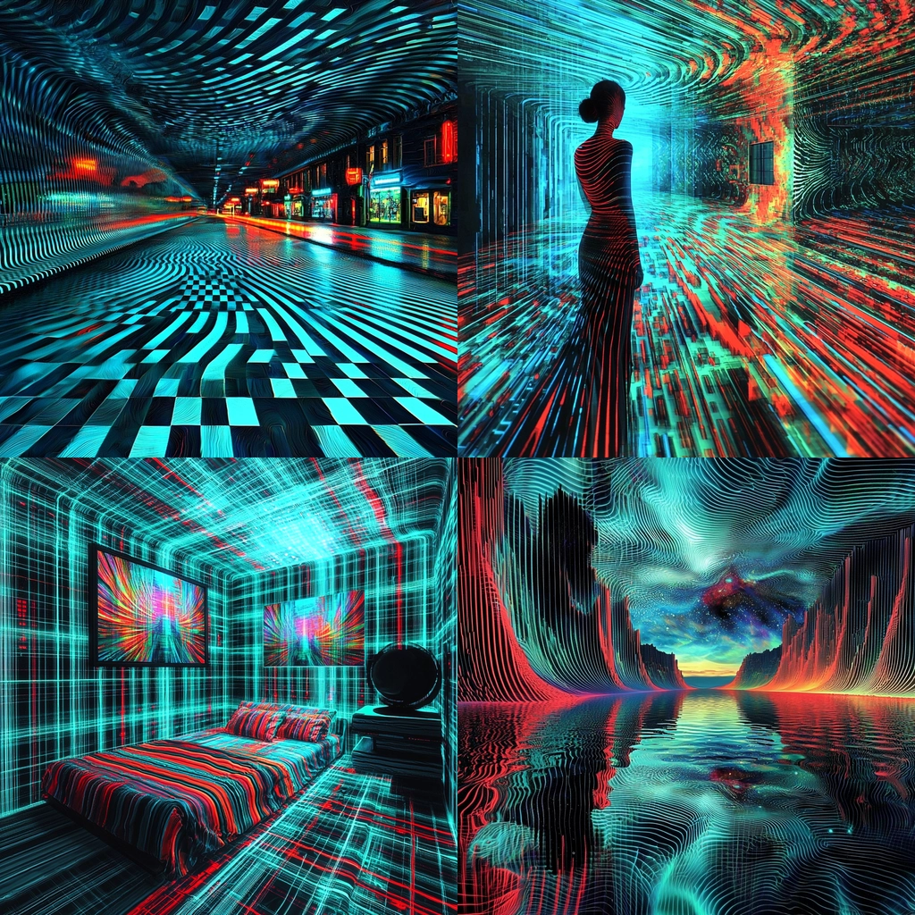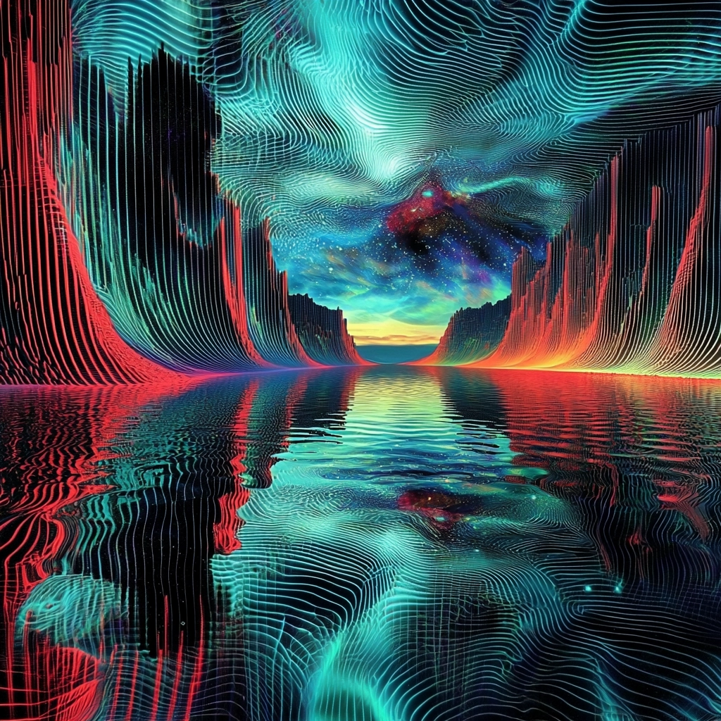 Strong neon lighting creates high contrast with vividly saturated blue and red hues. The sense of depth is amplified by linear perspective and rhythmic patterns, giving a spatially immersive, almost pulsating, texture feel.