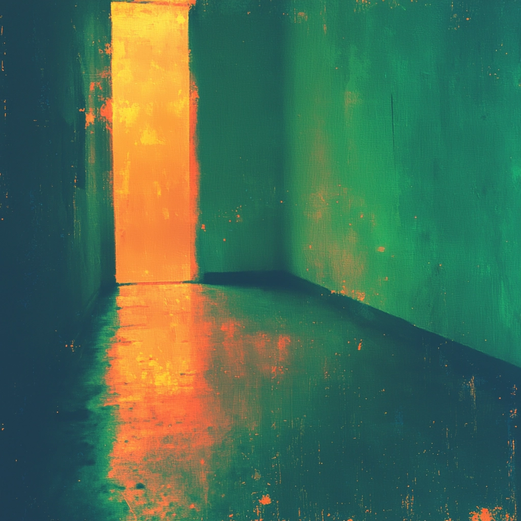 Intense lighting contrasts highlight surfaces with a glowing effect, large spatial depth due to both illuminated and shadowed areas, and a textured layer that enhances the visual density.