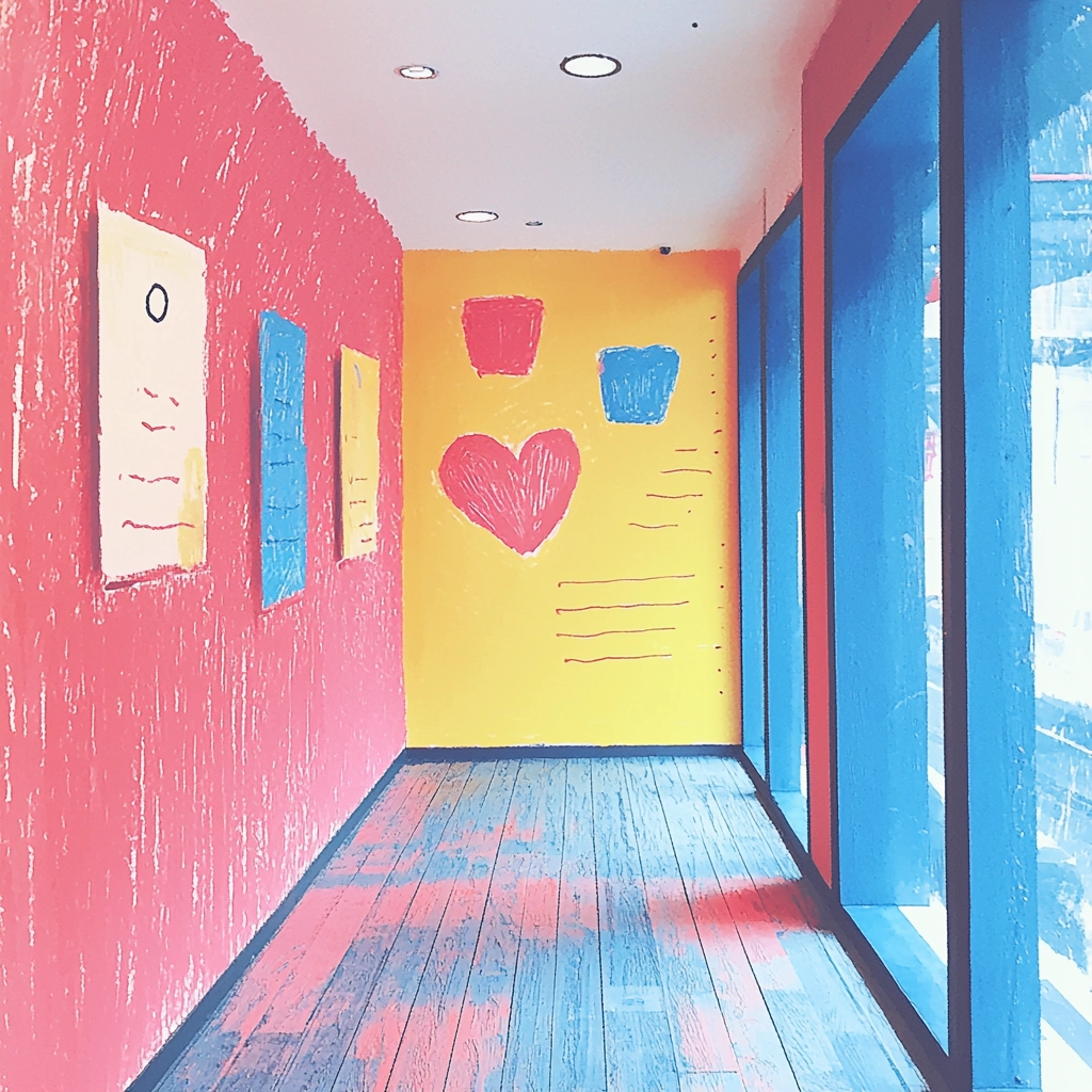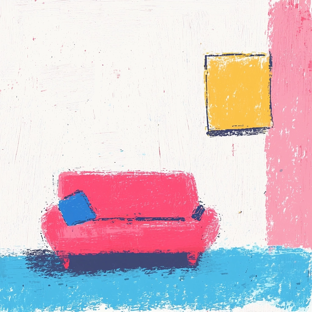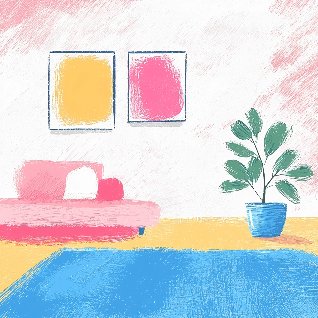 Soft diffused lighting highlights the vibrant contrast of pastels against muted textures, creating depth and playful spatial orientation through the use of geometric shapes and color blocking.