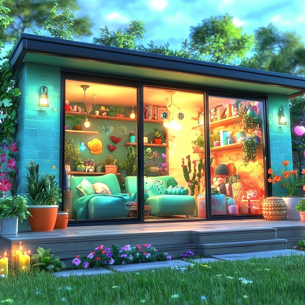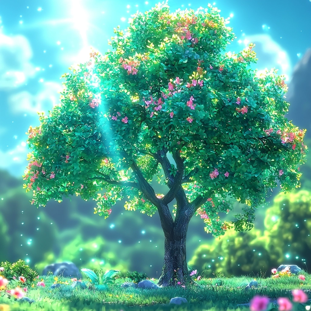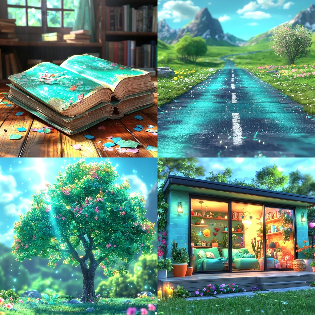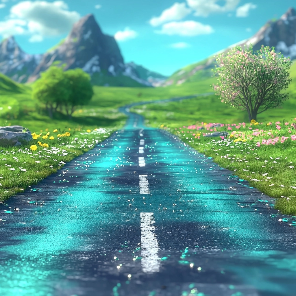 The work uses vibrant and harmoniously blended colors, enhanced by a soft yet vivid lighting that emphasizes depth and gives a sense of open space. The texture appears smooth and polished, creating an inviting and lively presence.