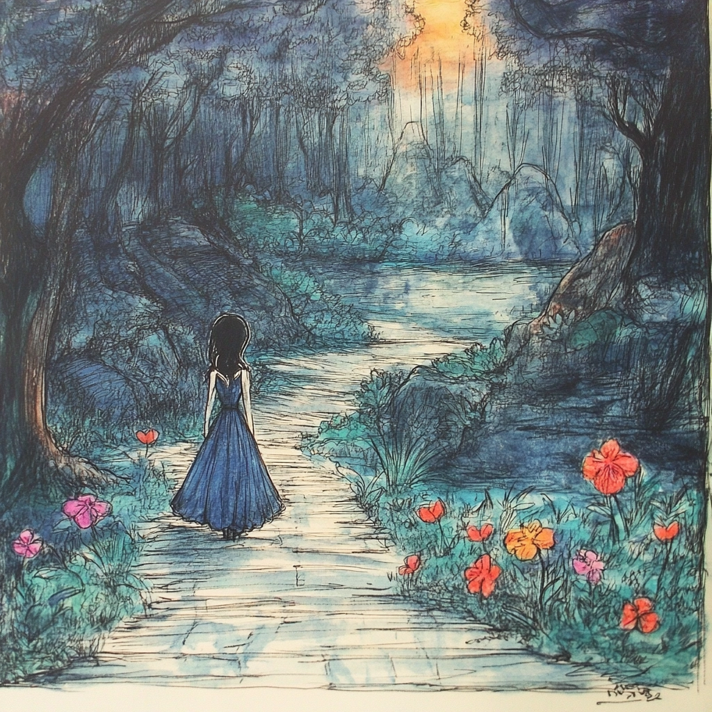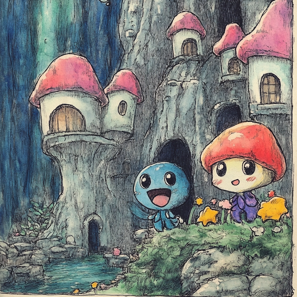 A vivid and sketched style with playful hues forming a fantasy landscape.