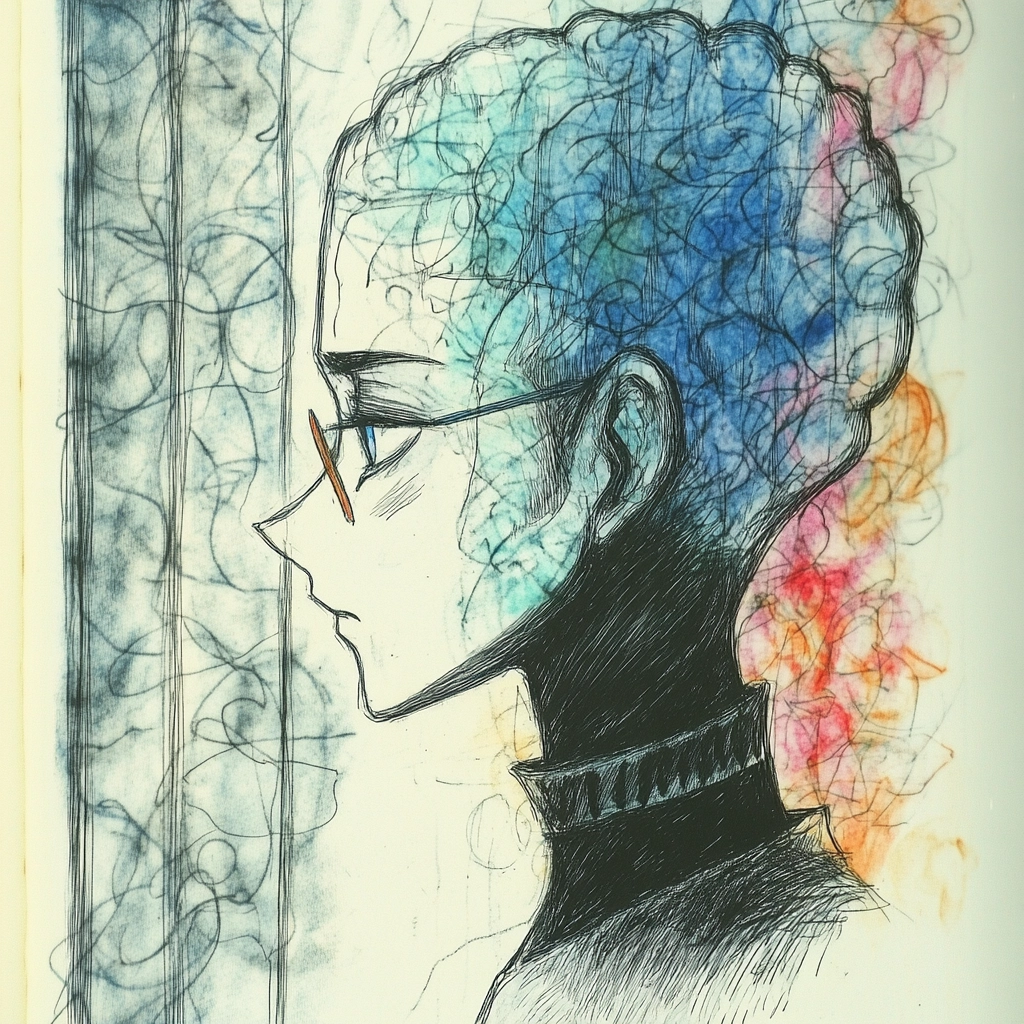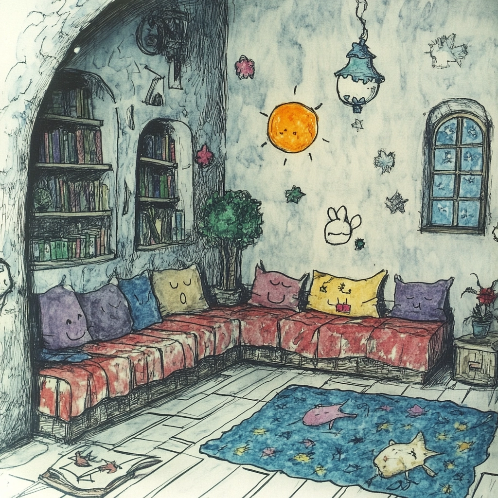 The style features soft pastel colors with intricate sketch lines that create a sense of depth and dimension. Light plays subtly across the surfaces, enhancing textures and giving an impression of whimsy and imagination.