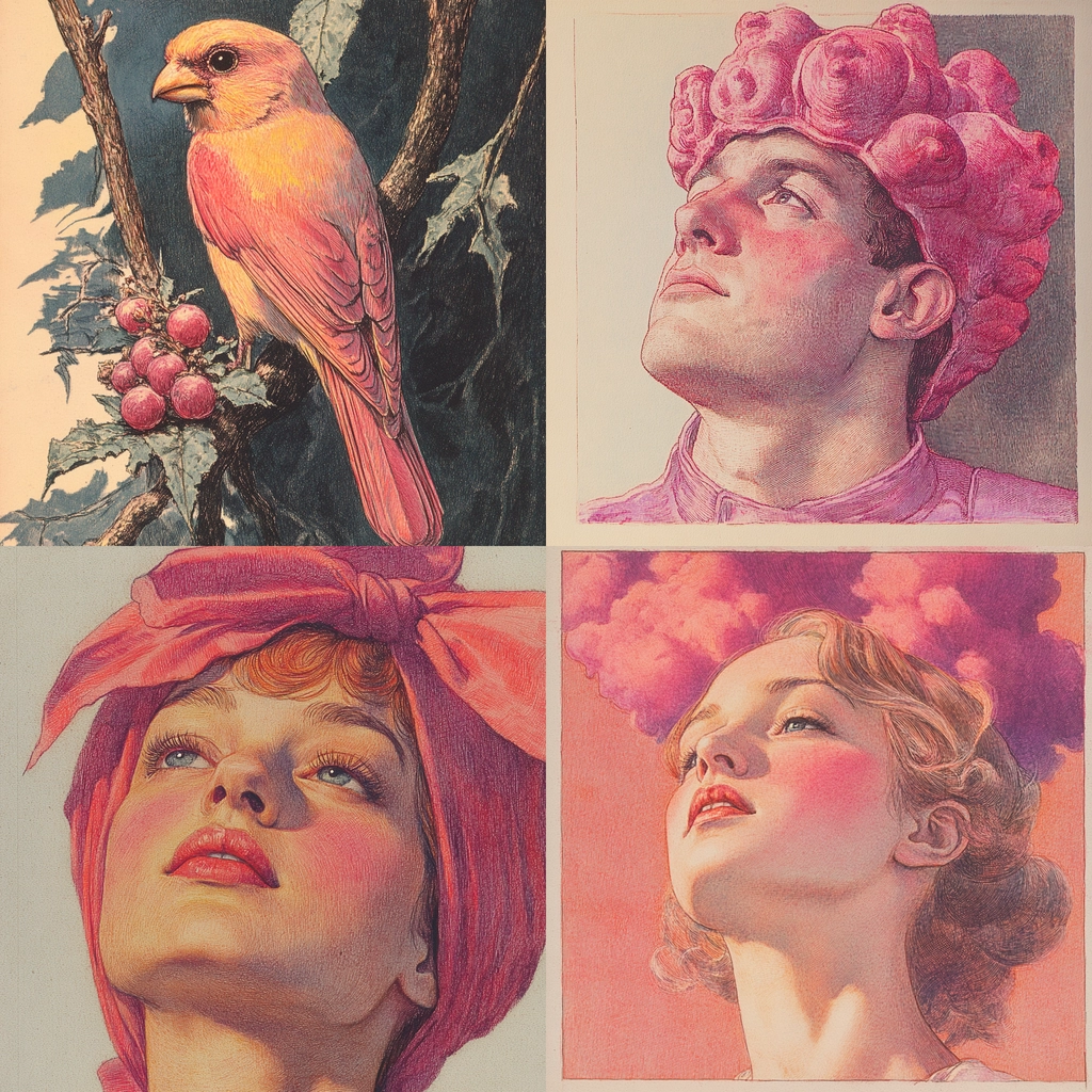 The vivid use of strong lighting enhances the depth, while the meticulous detailing in textures brings a tactile feel. The spatial arrangement provides a layered depth, with smooth gradations complementing the bold hues.
