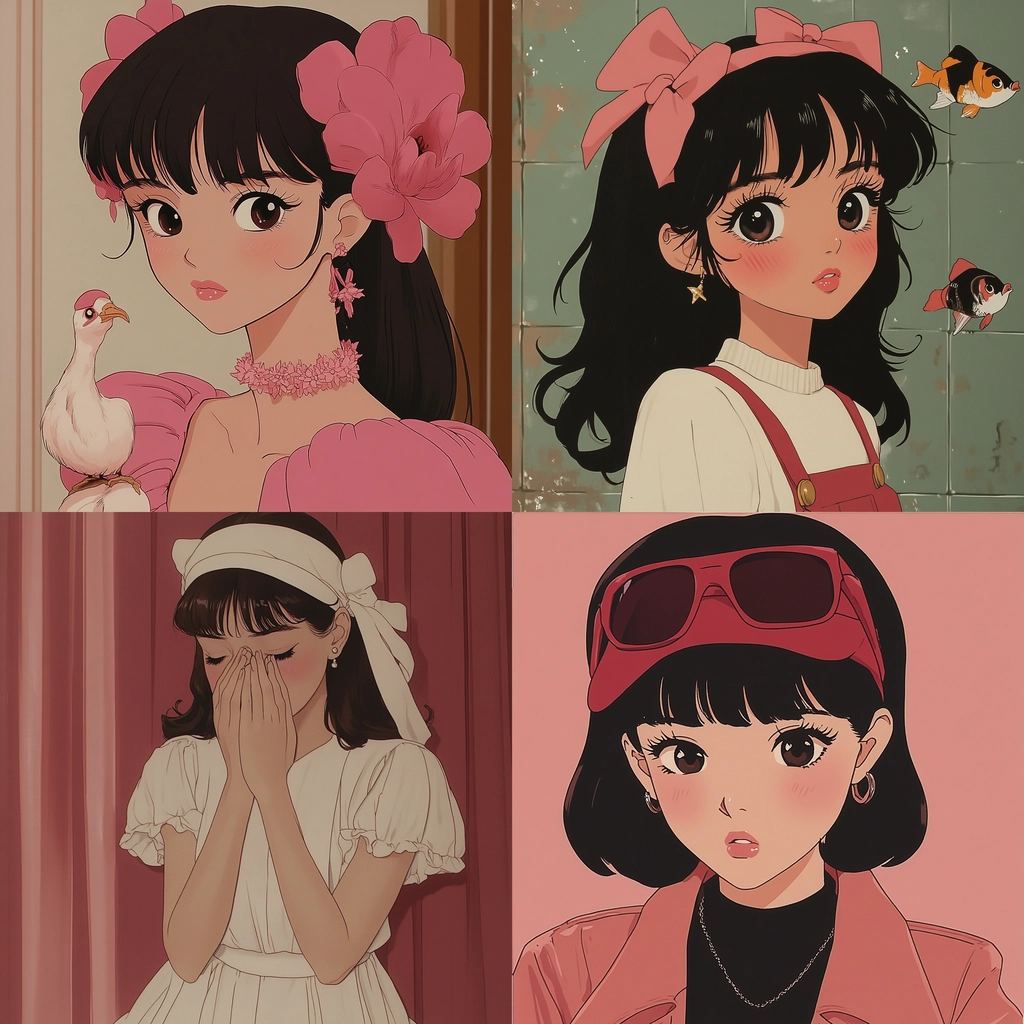 The images feature a vivid color palette with a focus on pastel pink and red tones enhanced by subtle white accents, creating a playful yet elegant composition.