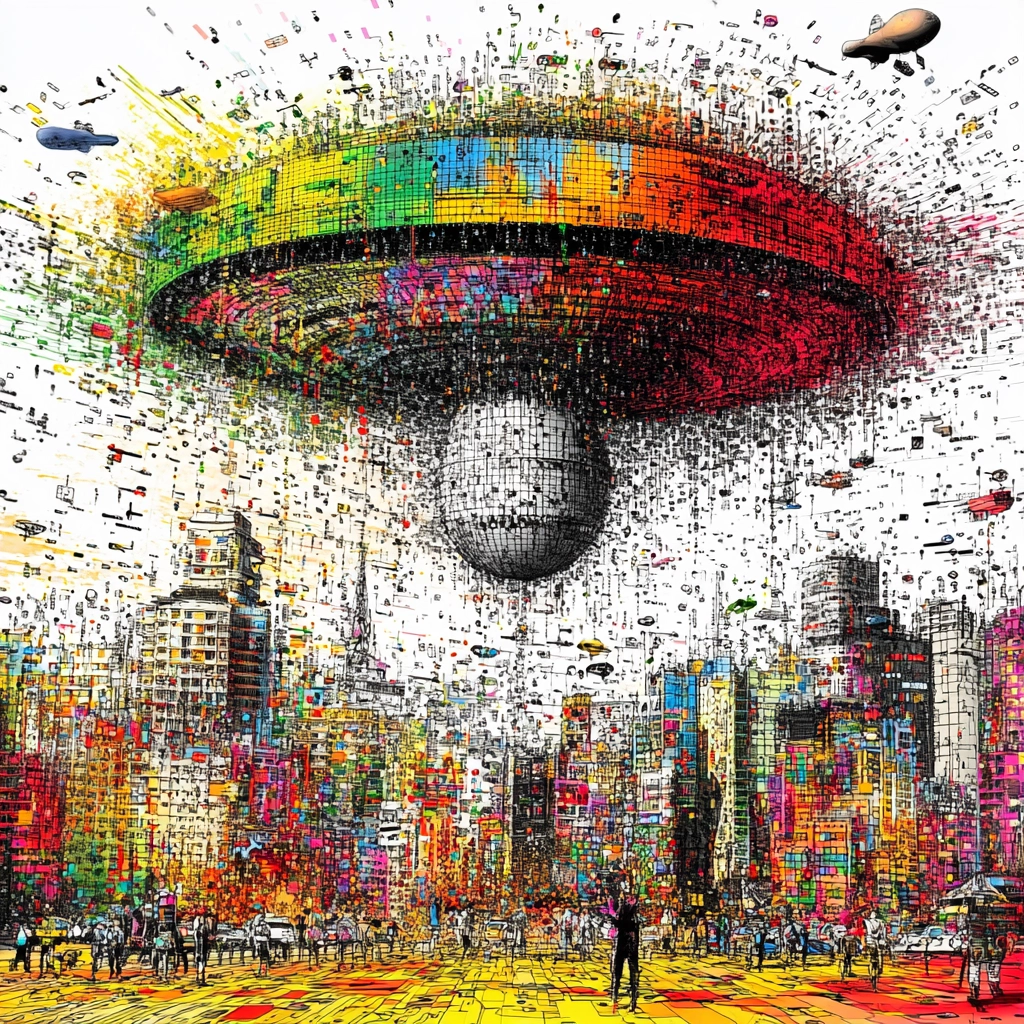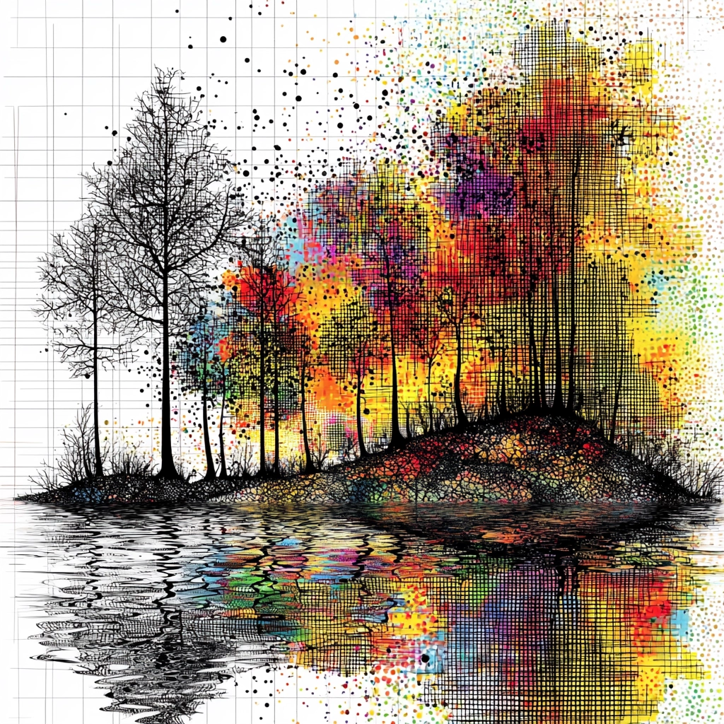 Bold, pixel-like patterns create dynamic, colorful scapes.