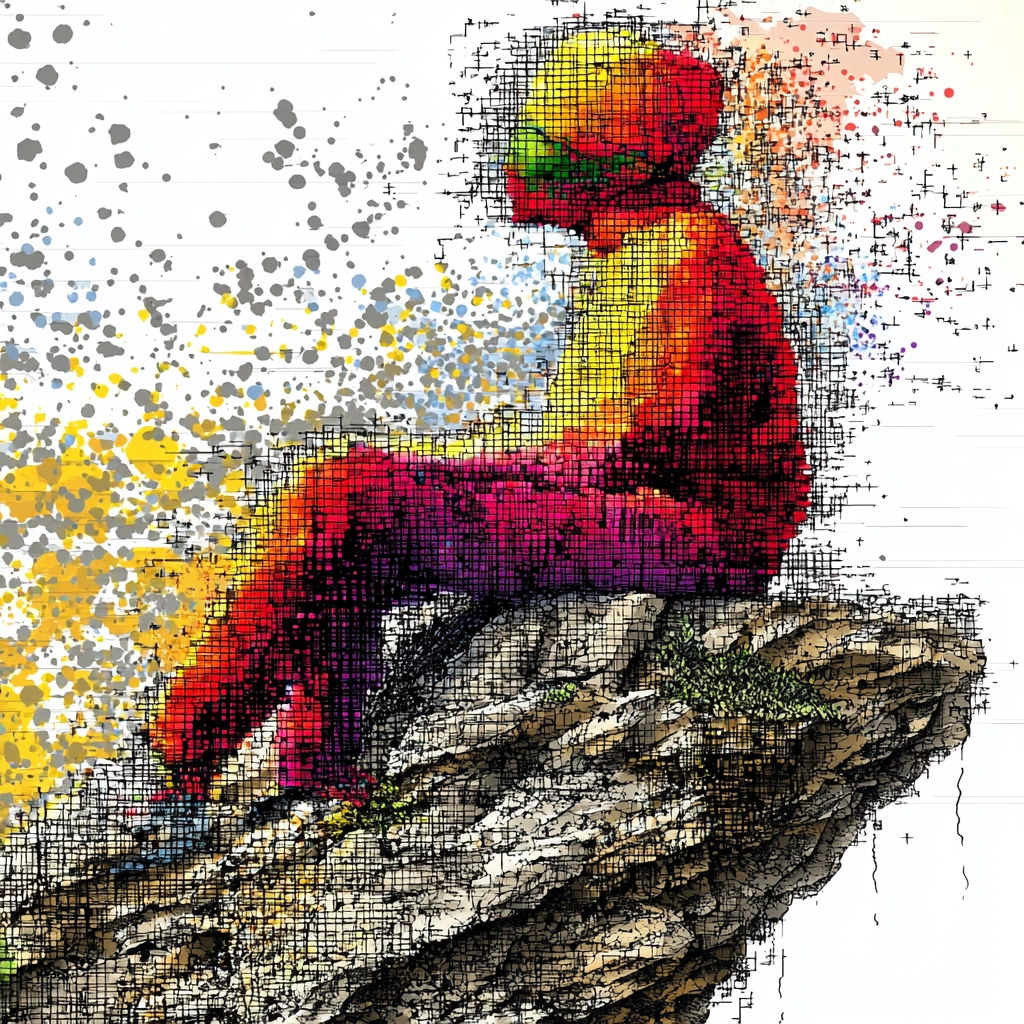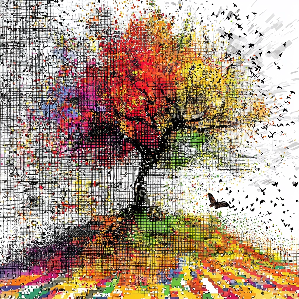 The use of strong colors interspersed with black lines creates a contrast that highlights the composition's dynamism. The pixelated portrayal blends structured grid-like formats with organic shapes, generating diverse textures and intricate spatial interplay.