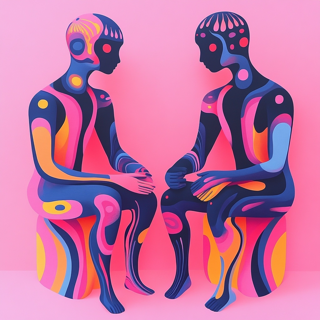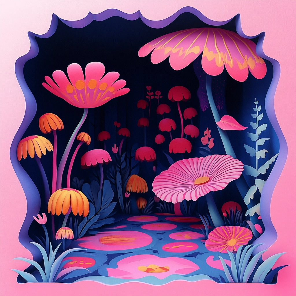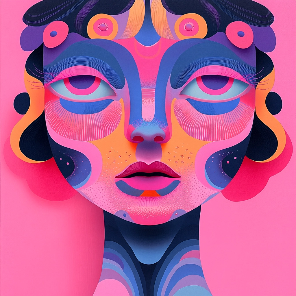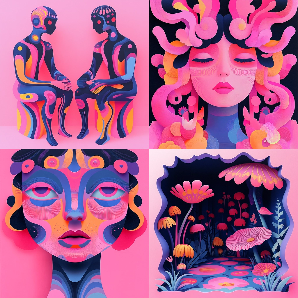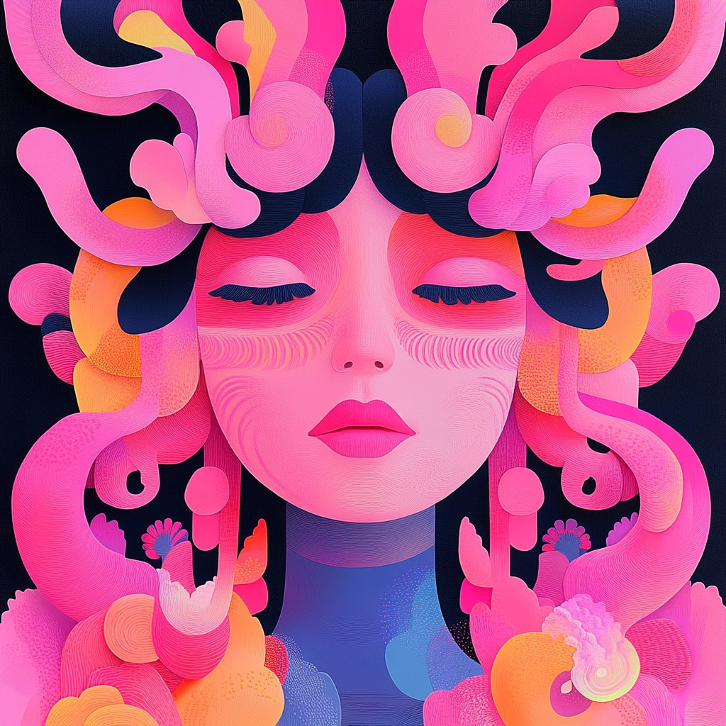 Lighting effects emphasize the vivid contrast between pinks and purples, enhancing the perception of depth. Gradients smoothly transition to create round and flowing forms, offering a textured illusion with fluid, organic shapes against bold color backgrounds.