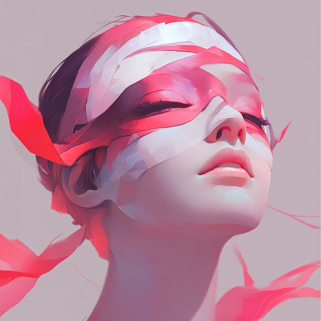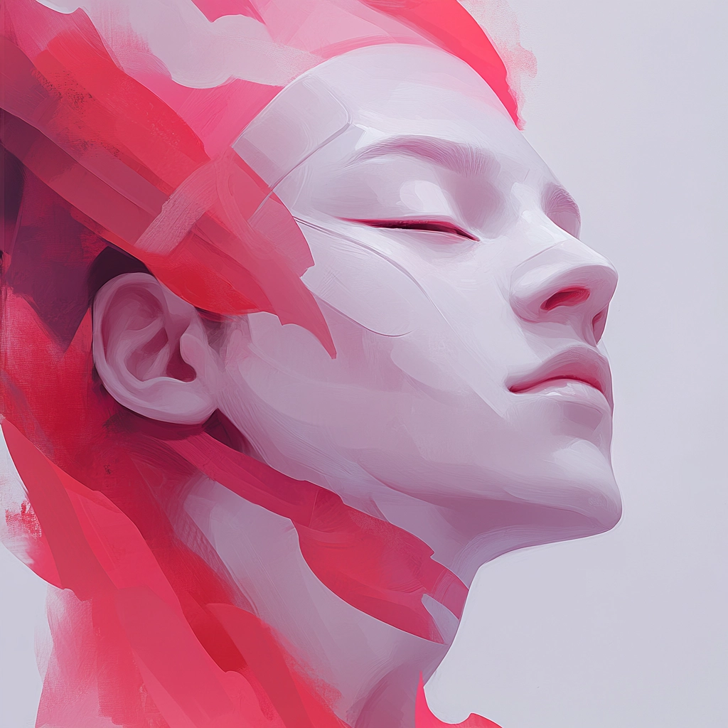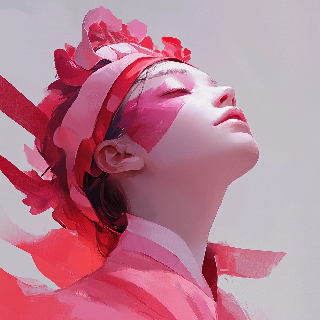 Vibrant red and pink brushstrokes dominate a soft white backdrop, creating a striking visual contrast.