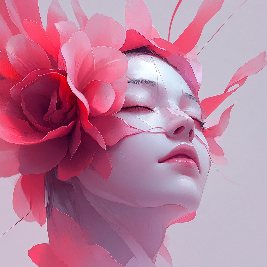 The use of bold red and pink hues against a light background draws the viewer鈥檚 attention to the flowing, dynamic brushstrokes. The interplay of light and shadow enhances depth, while the textures appear smooth and fluid, evoking a sense of motion.
