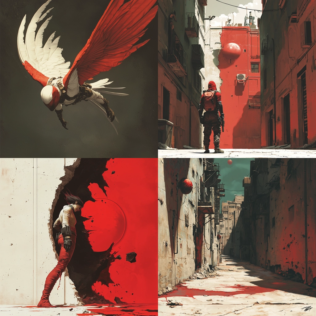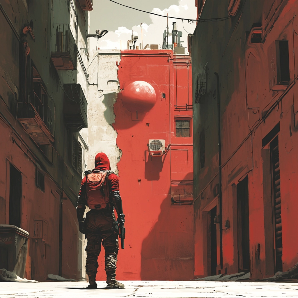 Dominant use of vivid red juxtaposed with dramatic shadow.