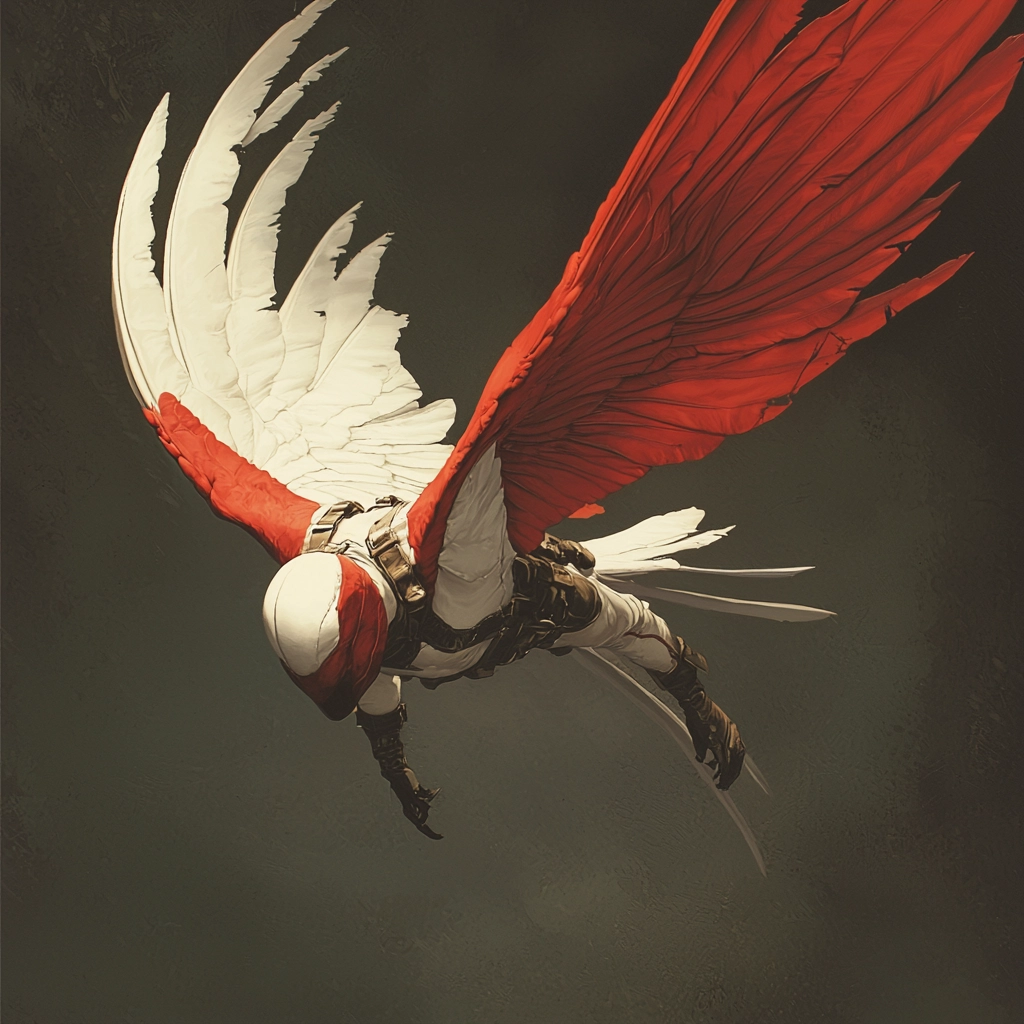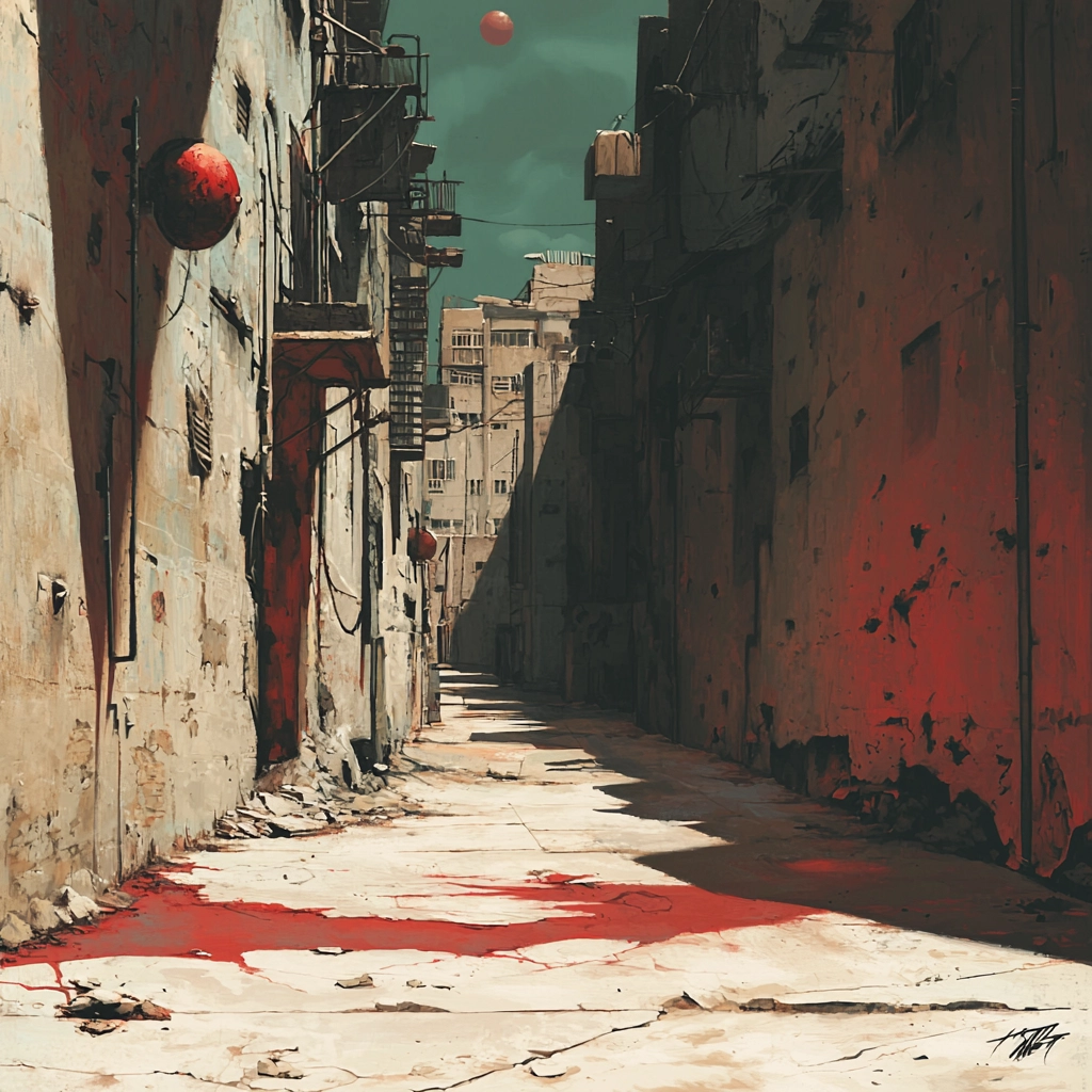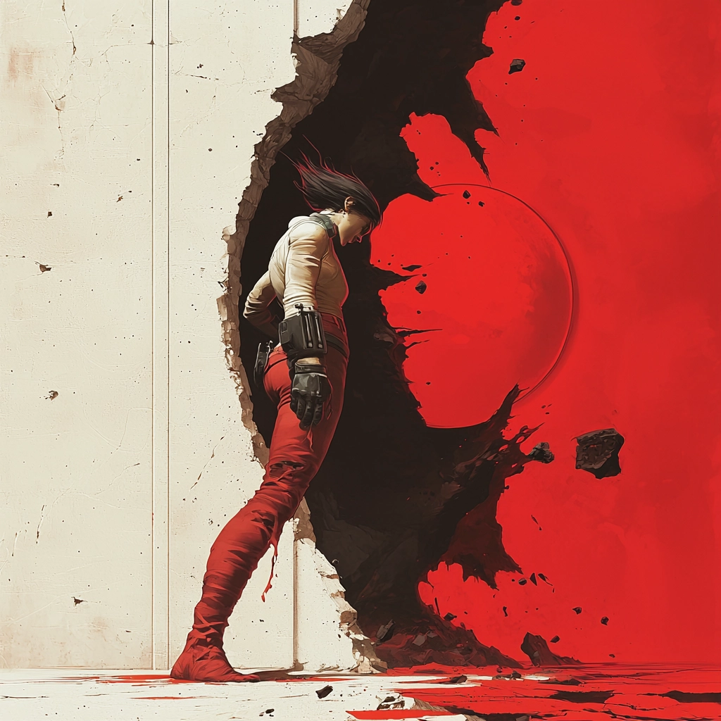 This style features intense contrasts created through bold red elements against deep black shadows, heightening depth perception. The use of sharp lines and flat areas of color enhances the visual impact and spatial organization, while textured surfaces create a tactile sense within the composition.