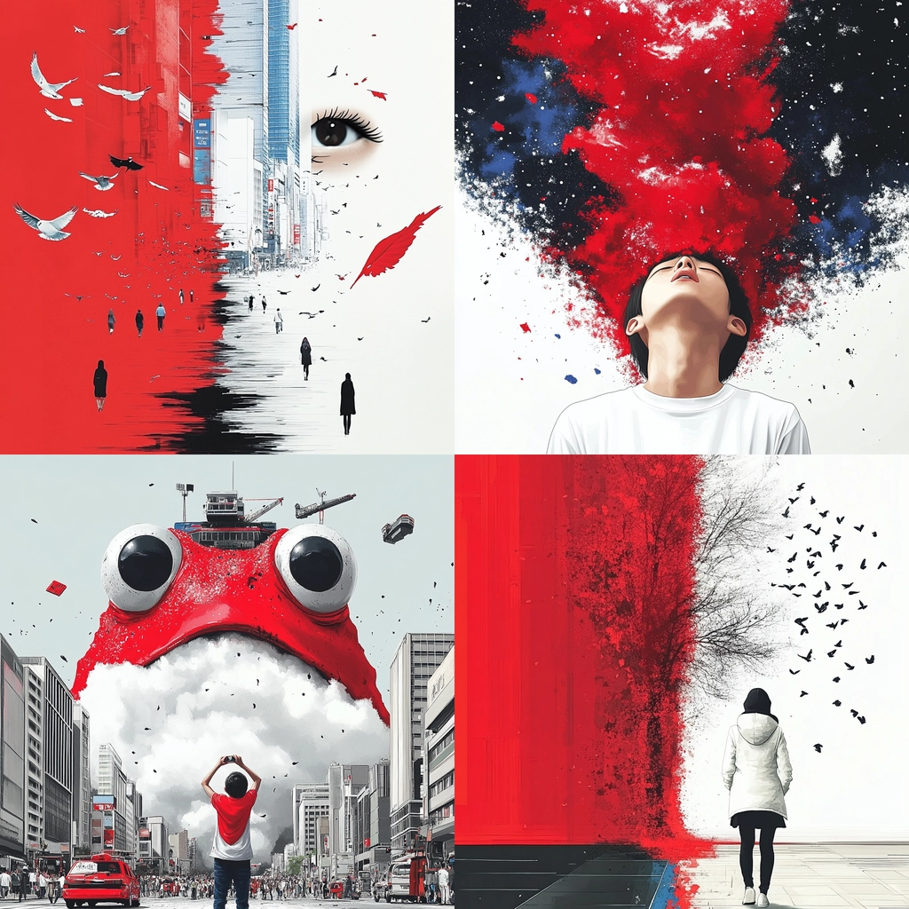Lighting effects highlight bold contrasts between the vibrant red and muted backgrounds. Color characteristics reflect urban themes with strong dominance of red across scenes. Texture ranges from smooth gradients to sharp, defined edges, suggesting urban dynamism.