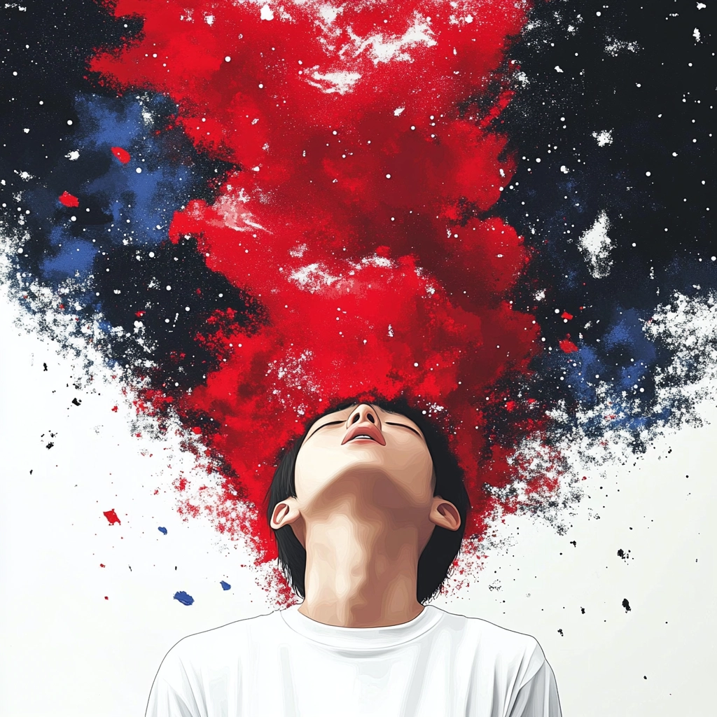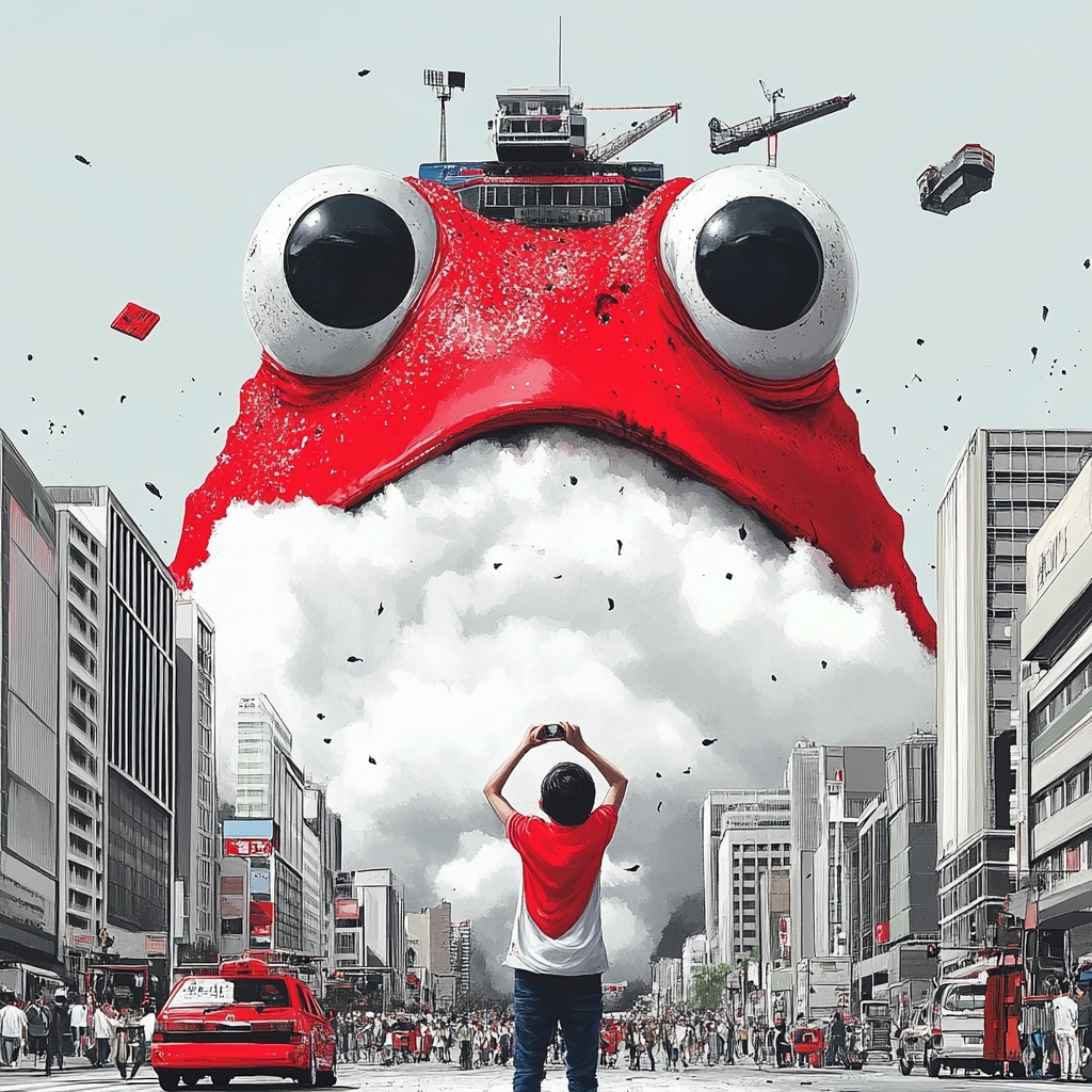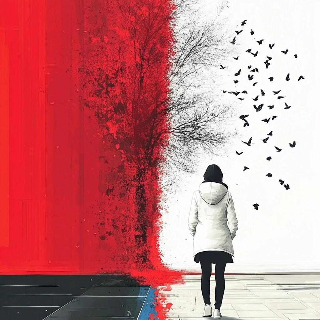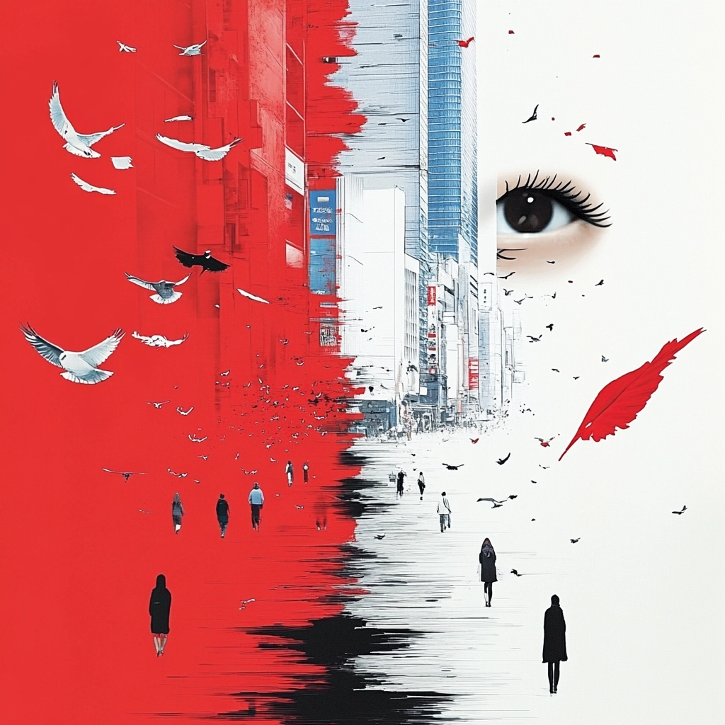 Dynamic interplay of bold colors and urban motifs creates stark contrast and intensity.
