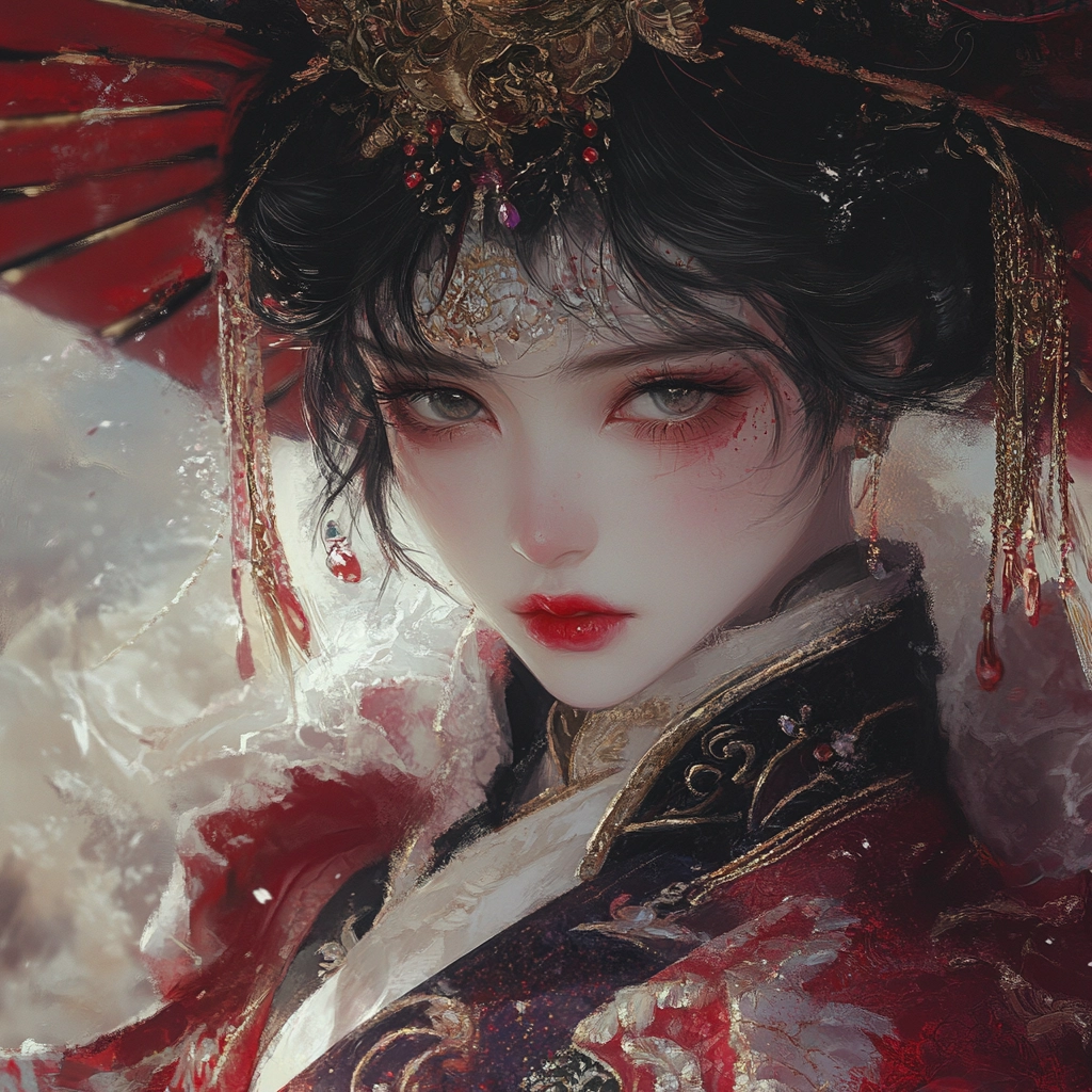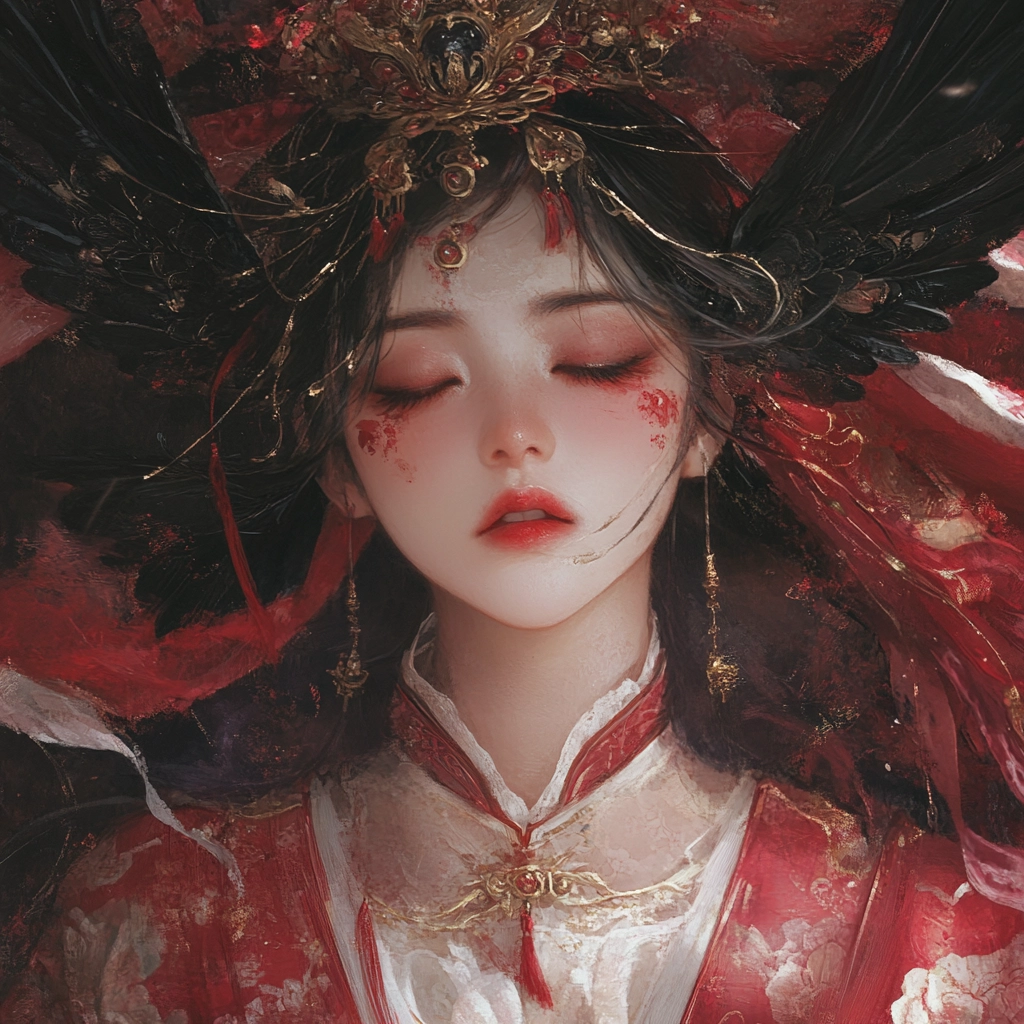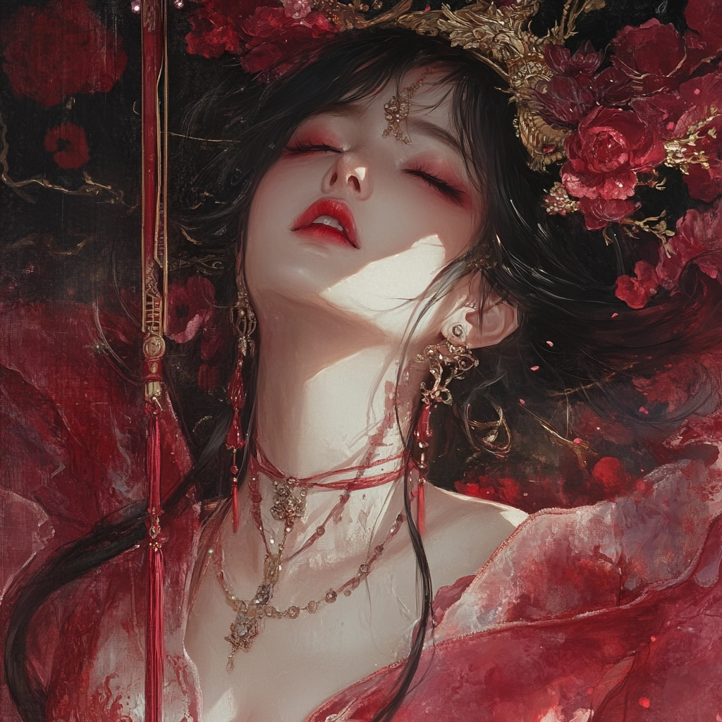 Dramatic contrasts of rich red and dark tones accented with intricate gold details.