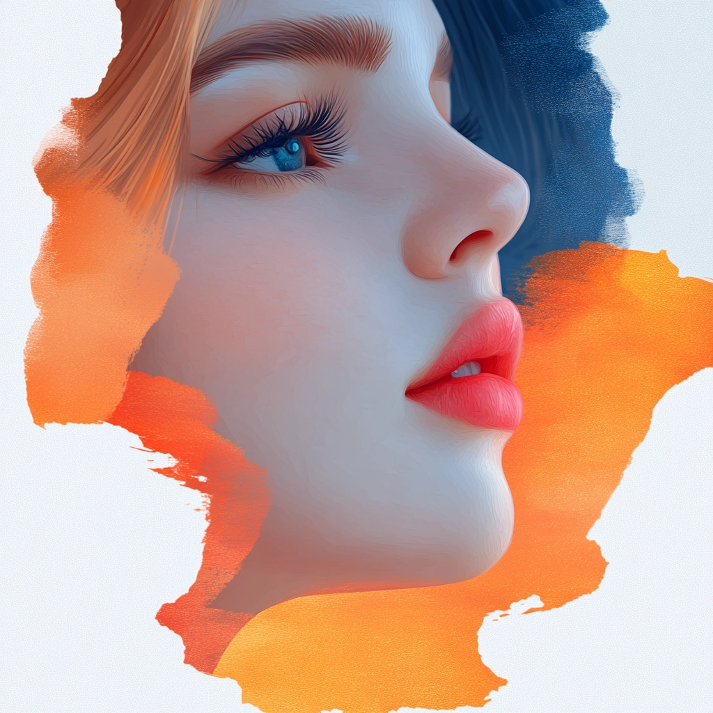 Dynamic composition with contrasting colors combining warm and cool tones, highlighting fluid forms and soft edges.