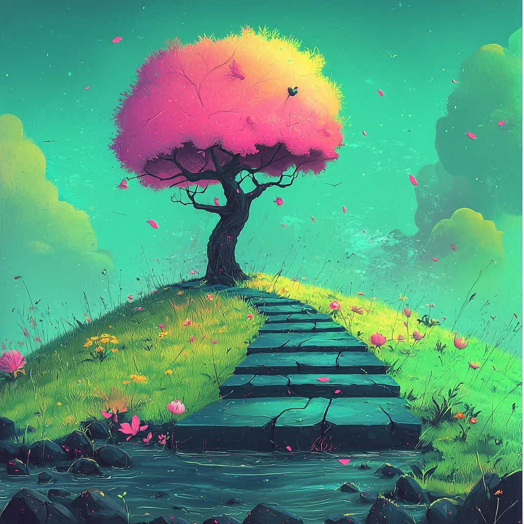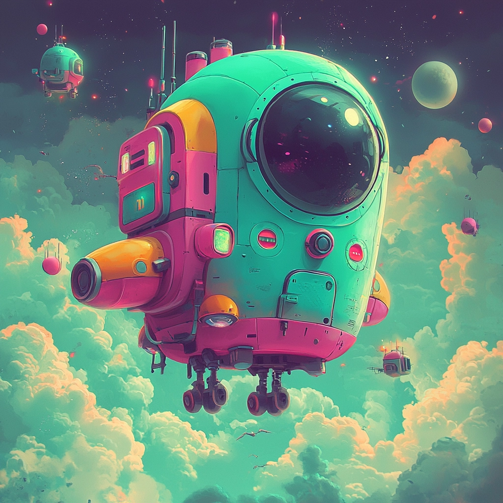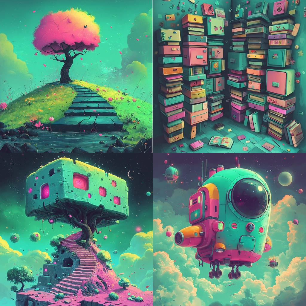 Bright cyan and pink dominate the vivid compositions, creating a surreal yet retro vibe with whimsical lighting and rich textures.