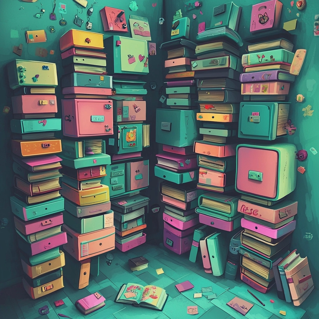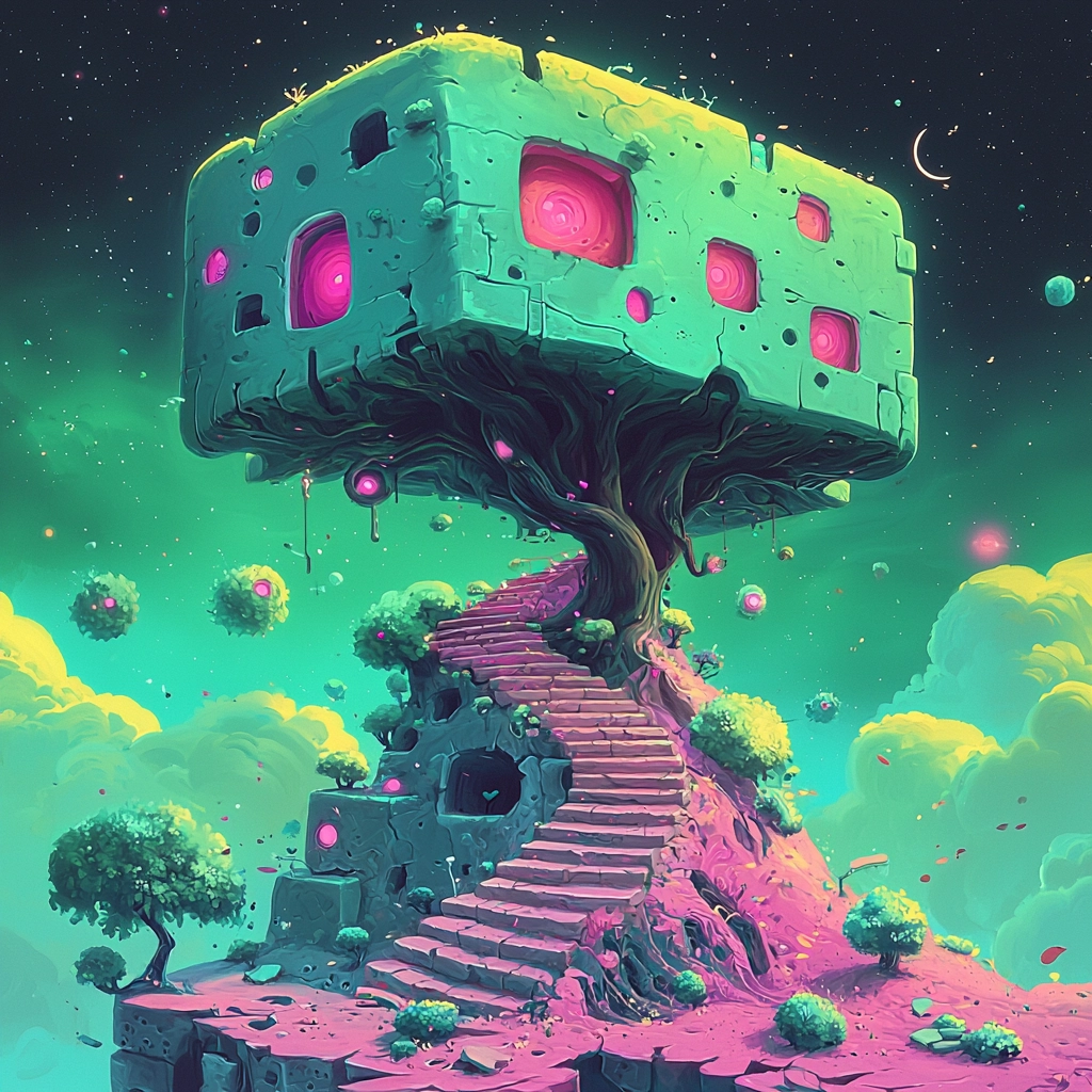 The artwork uses vivid lighting to accentuate rich cyan and pink hues, creating surreal spaces with unusual spatial arrangements. The textures are bold and imaginative, enhancing the playful contrast between colors and forms, while creating a nostalgic yet futuristic atmosphere.