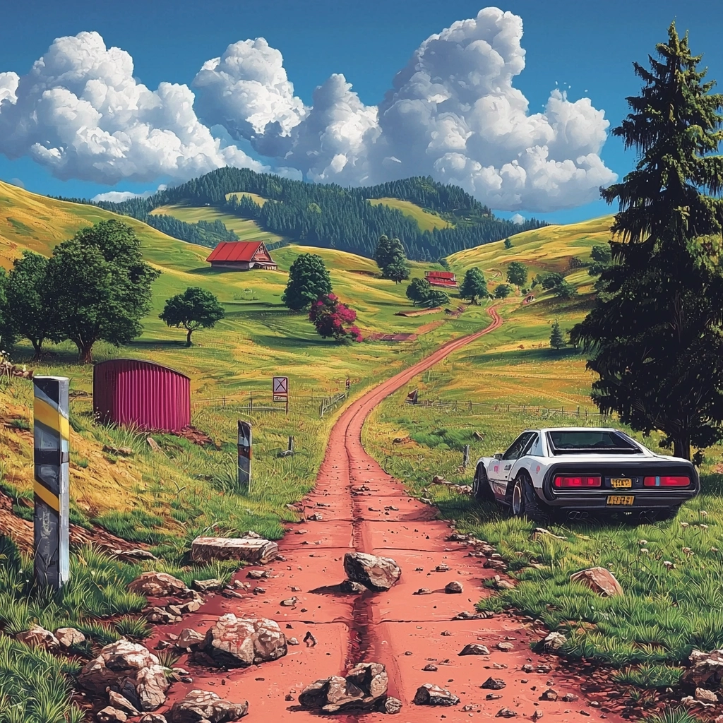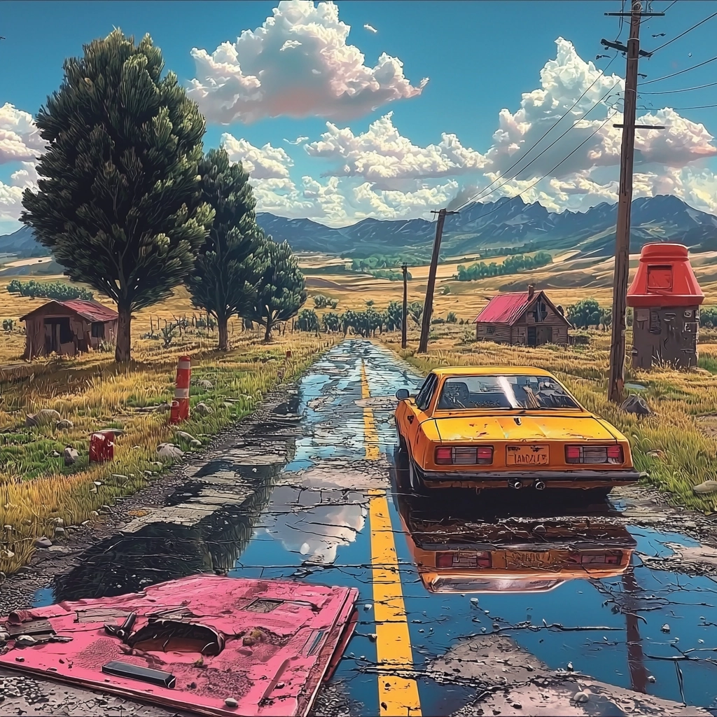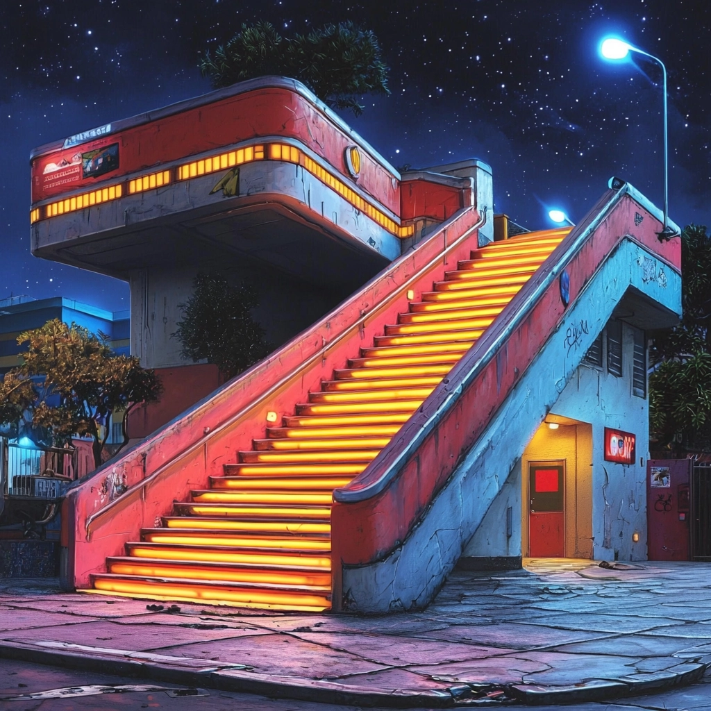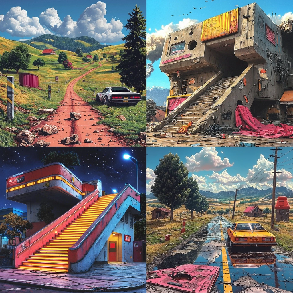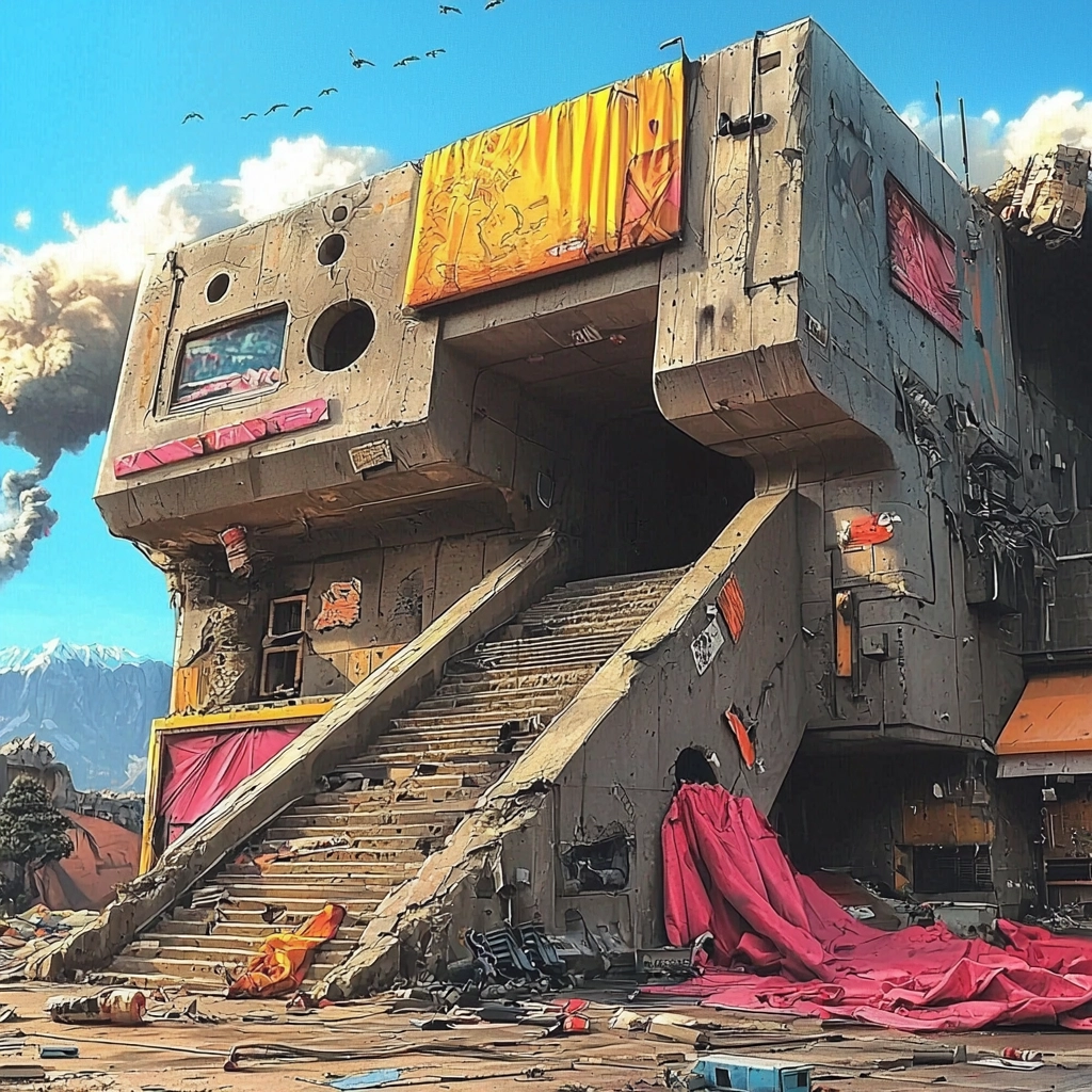 The lighting creates strong shadows enhancing depth, with vibrant colors adding intensity. The spatial arrangement combines vast outdoor expanses with cluttered interiors, while smooth textures contrast with rough natural elements.