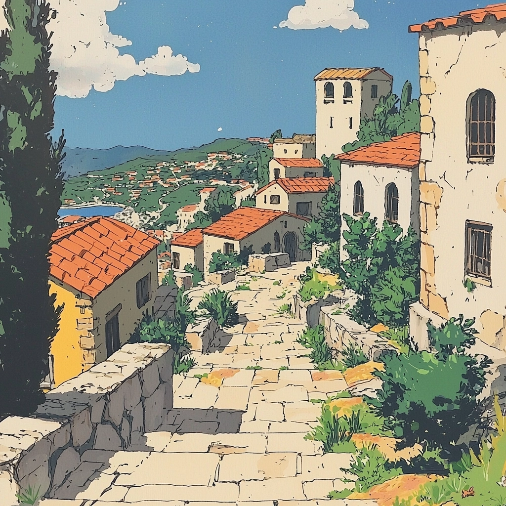 Lighting is clear and evenly distributed with distinct shadowing. Colors are saturated and well-separated, lending sharpness to details. The spatial depth is subtle but effective, enhanced by linear perspectives. Texture remains smooth, with a graphic quality that highlights clarity.