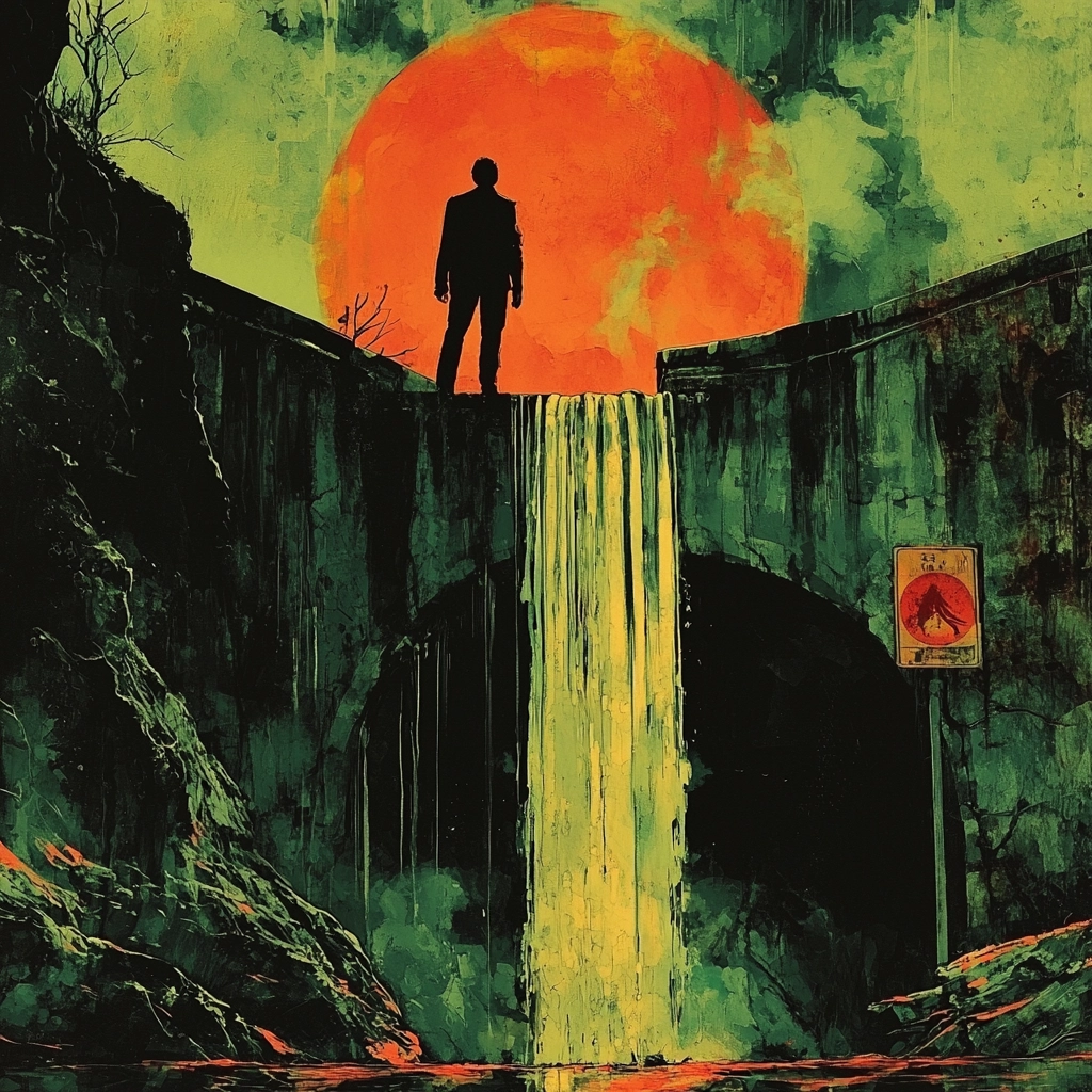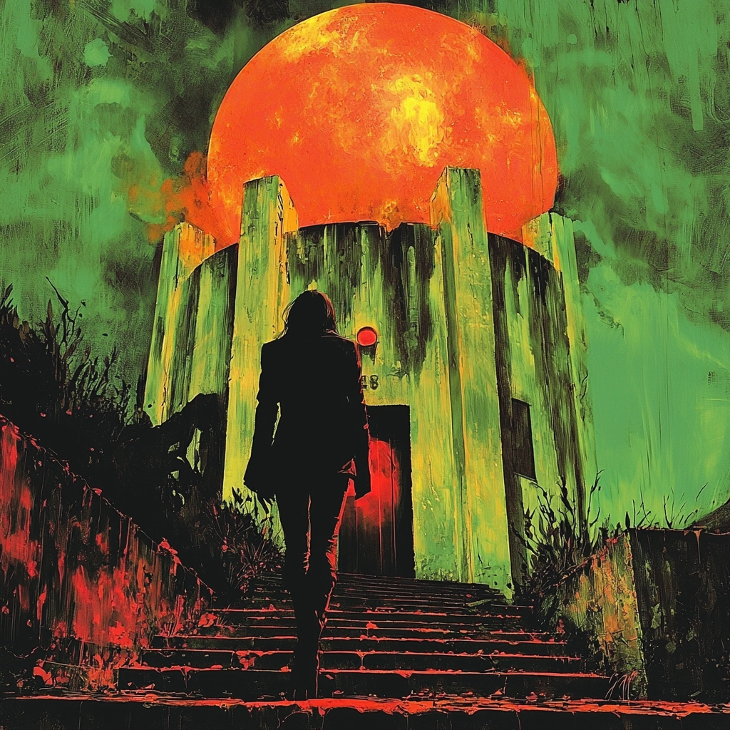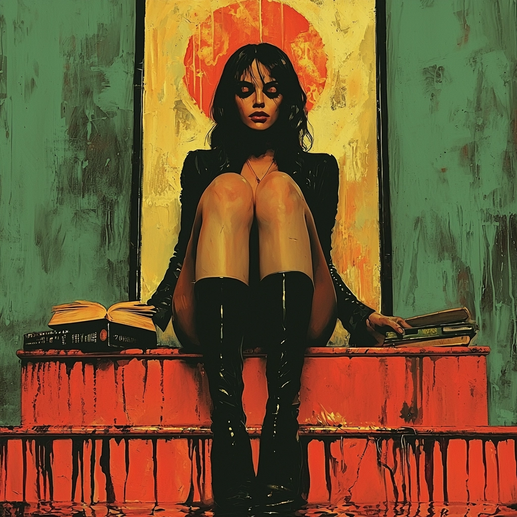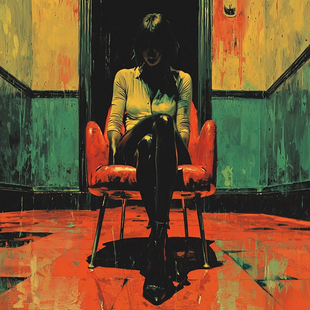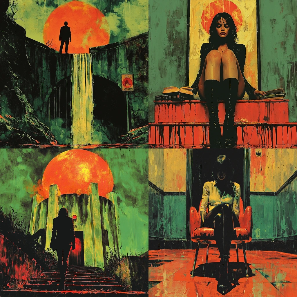 Bright red and orange tones evoke drama, set against dark, shadowy backgrounds that create depth and mystery. The stark contrast enhances the textured appearance of surfaces, lending a layered spatial quality.