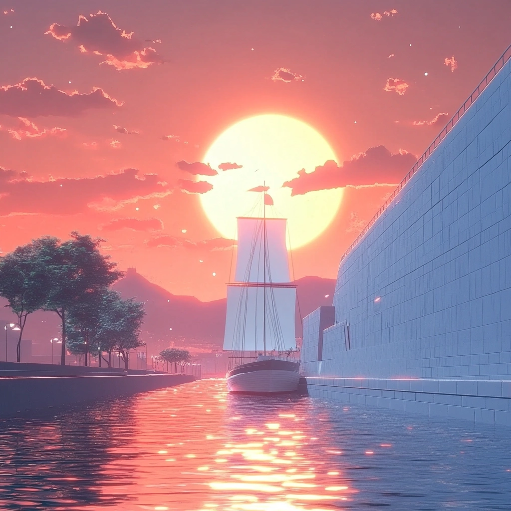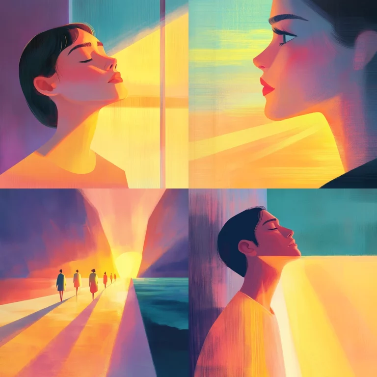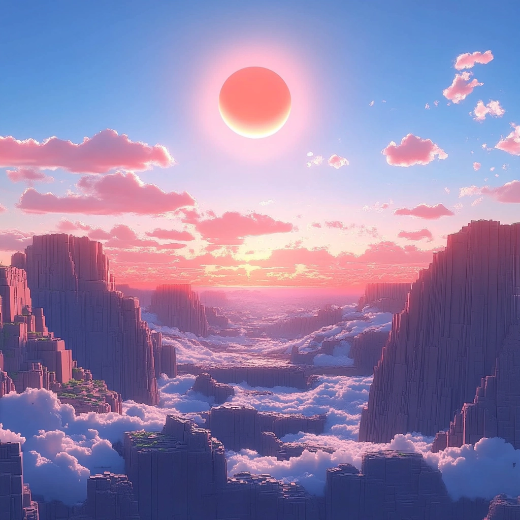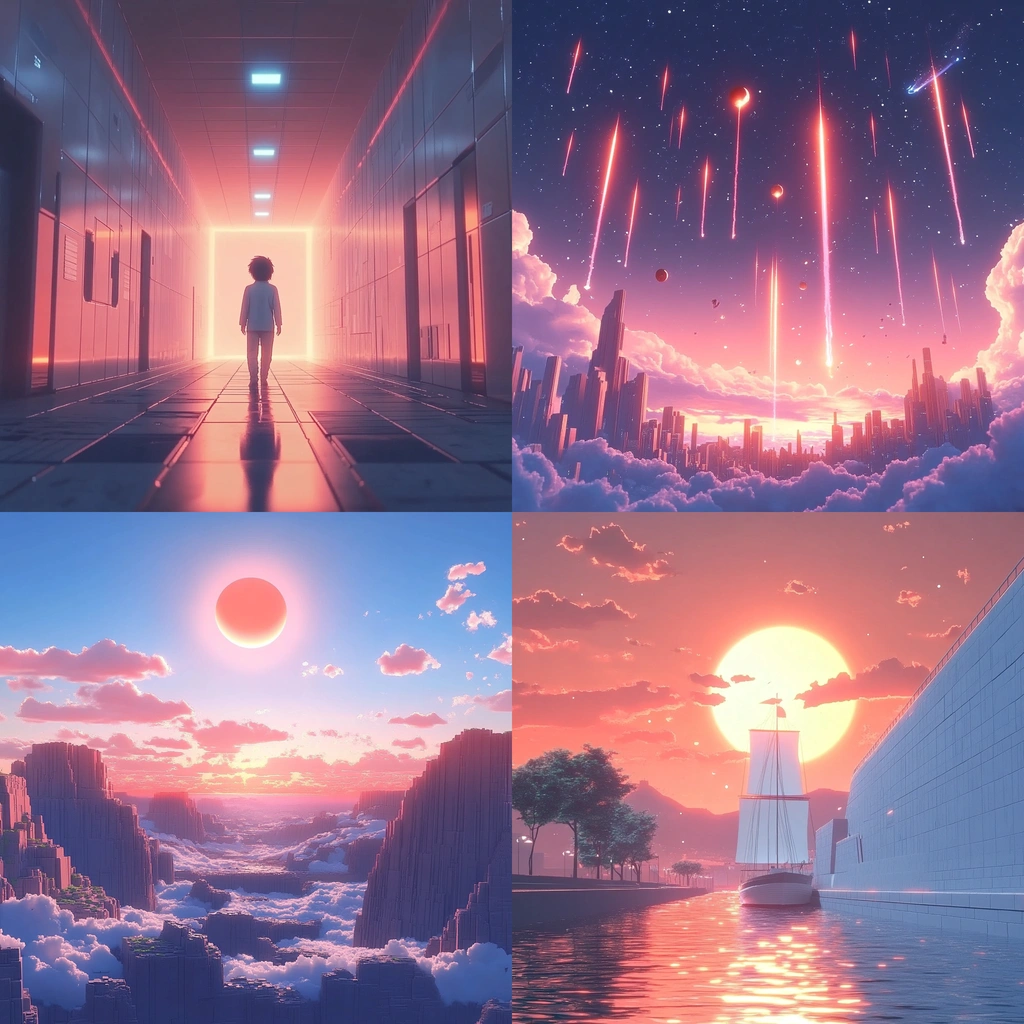 Soft, radiant lighting blends with bold pinks and blues, creating a vivid contrast highlighting intricate texture details and expansive spatial dynamics throughout each scene.
