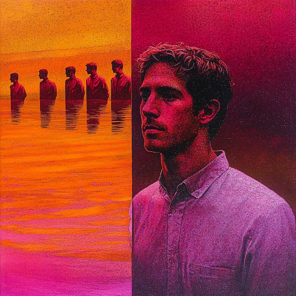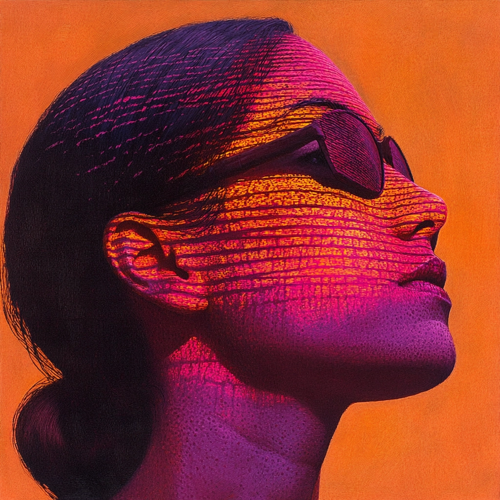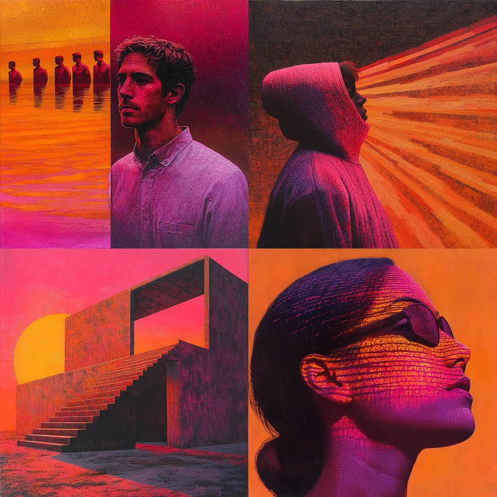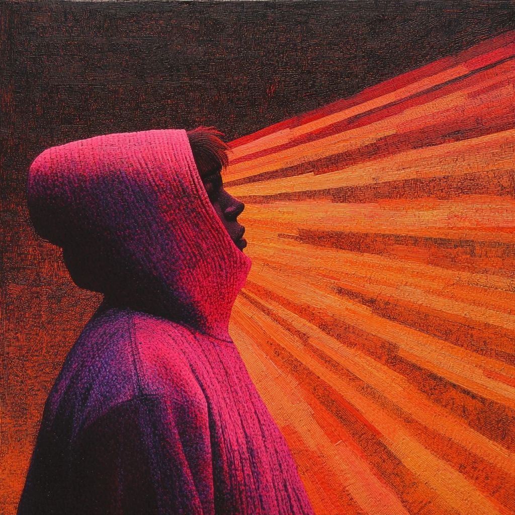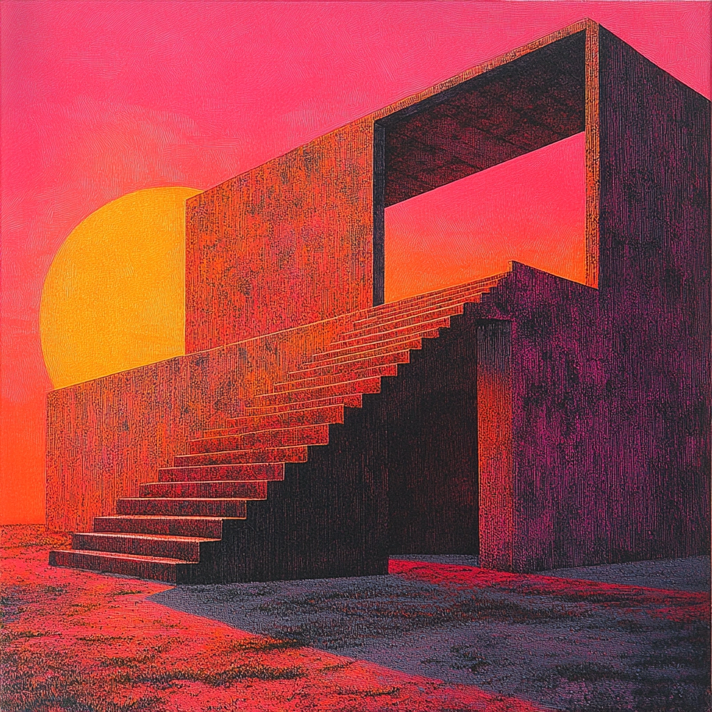 The artwork is dominated by intense gradients of reds and oranges that create a vibrant atmosphere.
