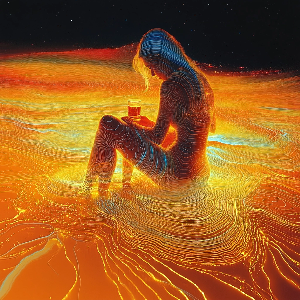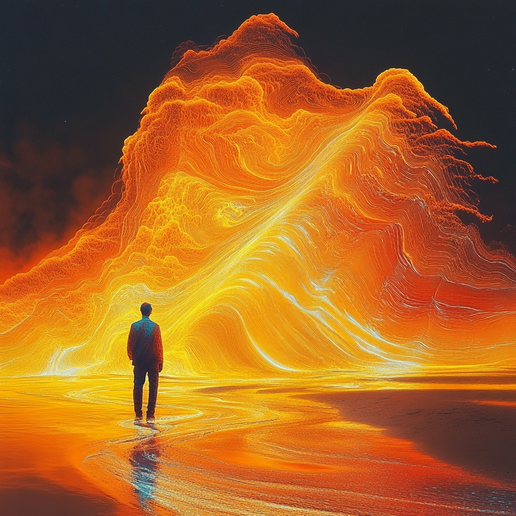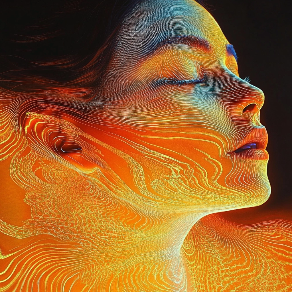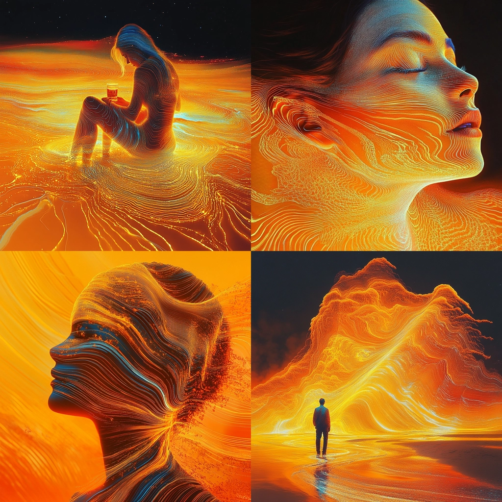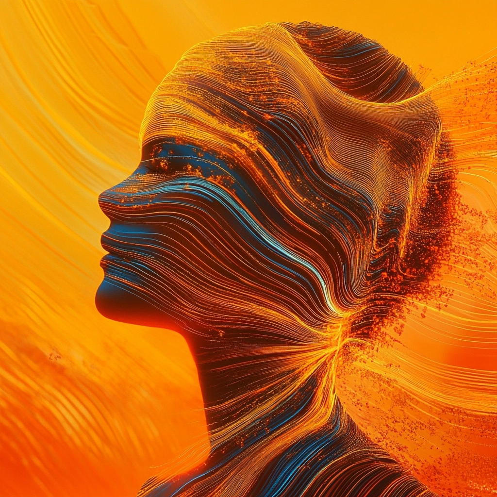 The lighting enhances the vibrancy of orange, creating dynamic swirls and waves across the composition. Blue highlights add contrast, emphasizing form and depth within the spatial complexity. Textures swirl with fluid energy, suggesting intricate motion.