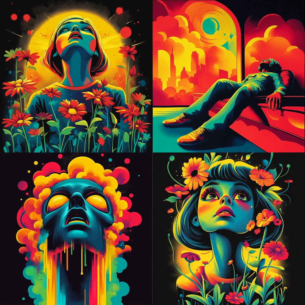 Luminous contrasts and vibrant hues form dynamic compositions.