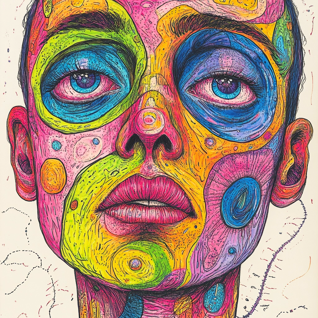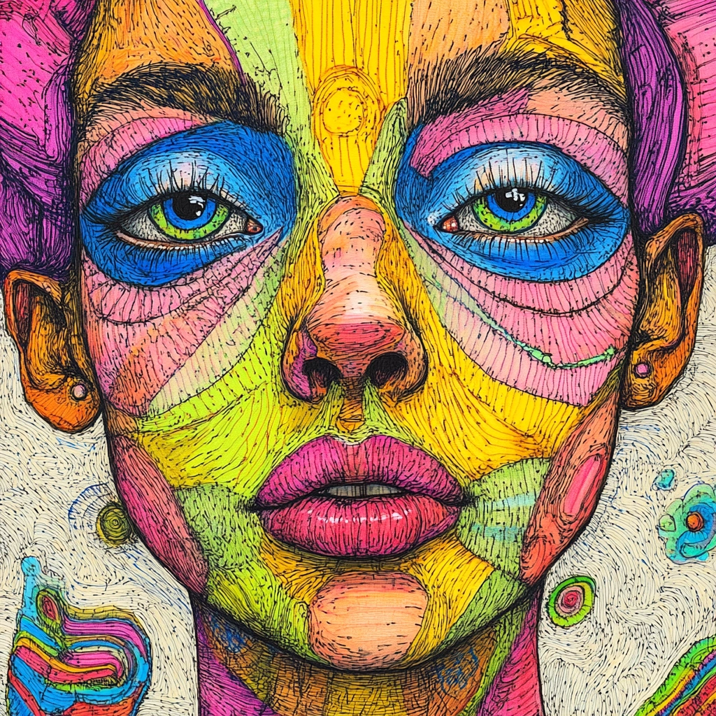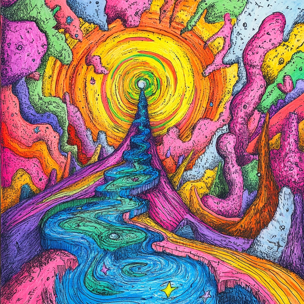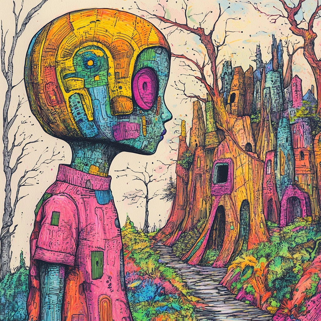 The use of high-contrast lighting emphasizes vibrant colors creating a rich visual narrative. Meticulous line work defines space and texture, while the vivid tones produce a dynamic and fantastical visual effect.