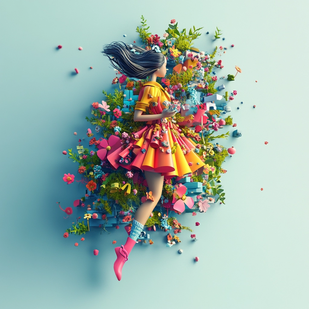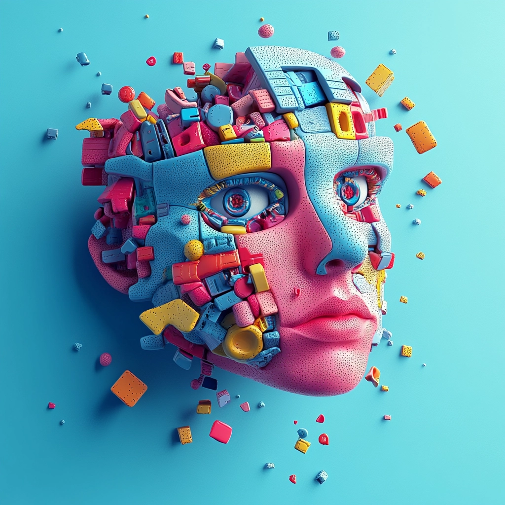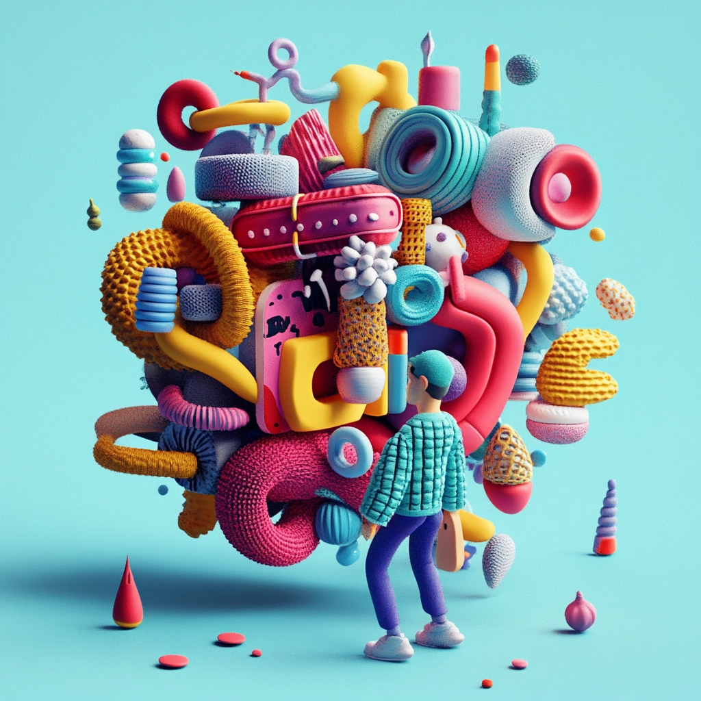 The lighting accentuates strong textures, enhancing the three-dimensional illusion. Bold colors contrast with the blue background, while the forms exhibit intricate textures, suggesting depth and vivid details.