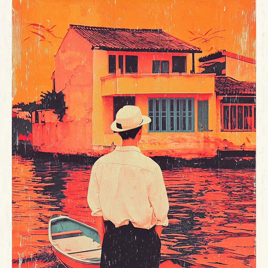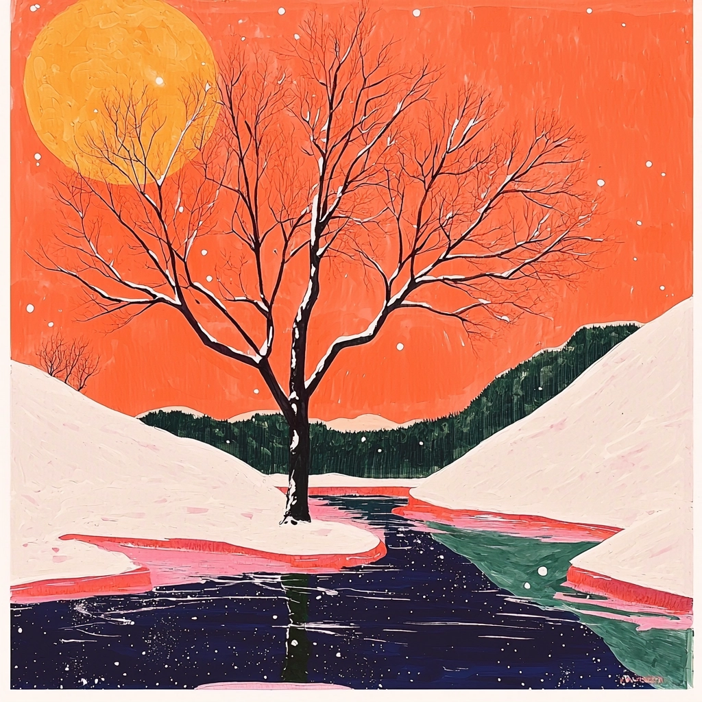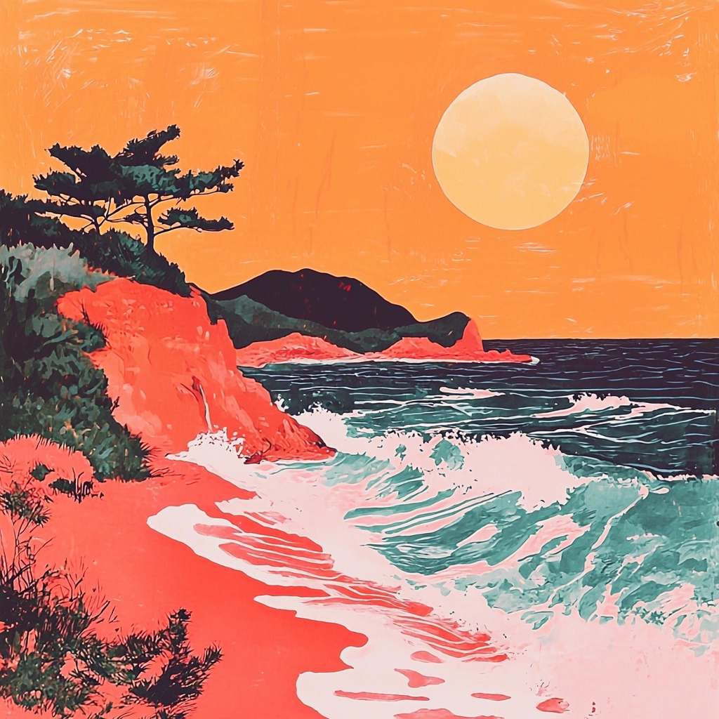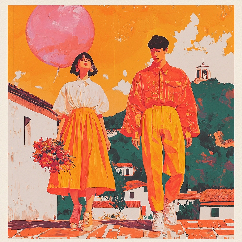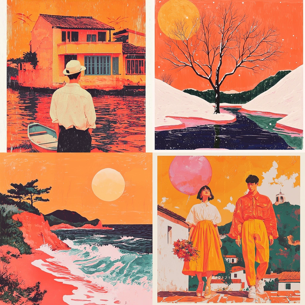 Strong orange tones dominate, balanced with complementary greens and pinks, creating striking color juxtapositions. The textures are flat but rich, with a sense of layered simplicity, and light is diffused evenly across scenes, emphasizing vibrant details and spatial depth.