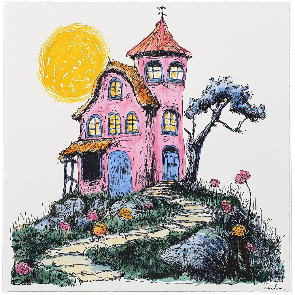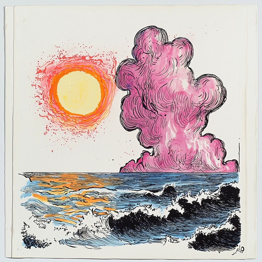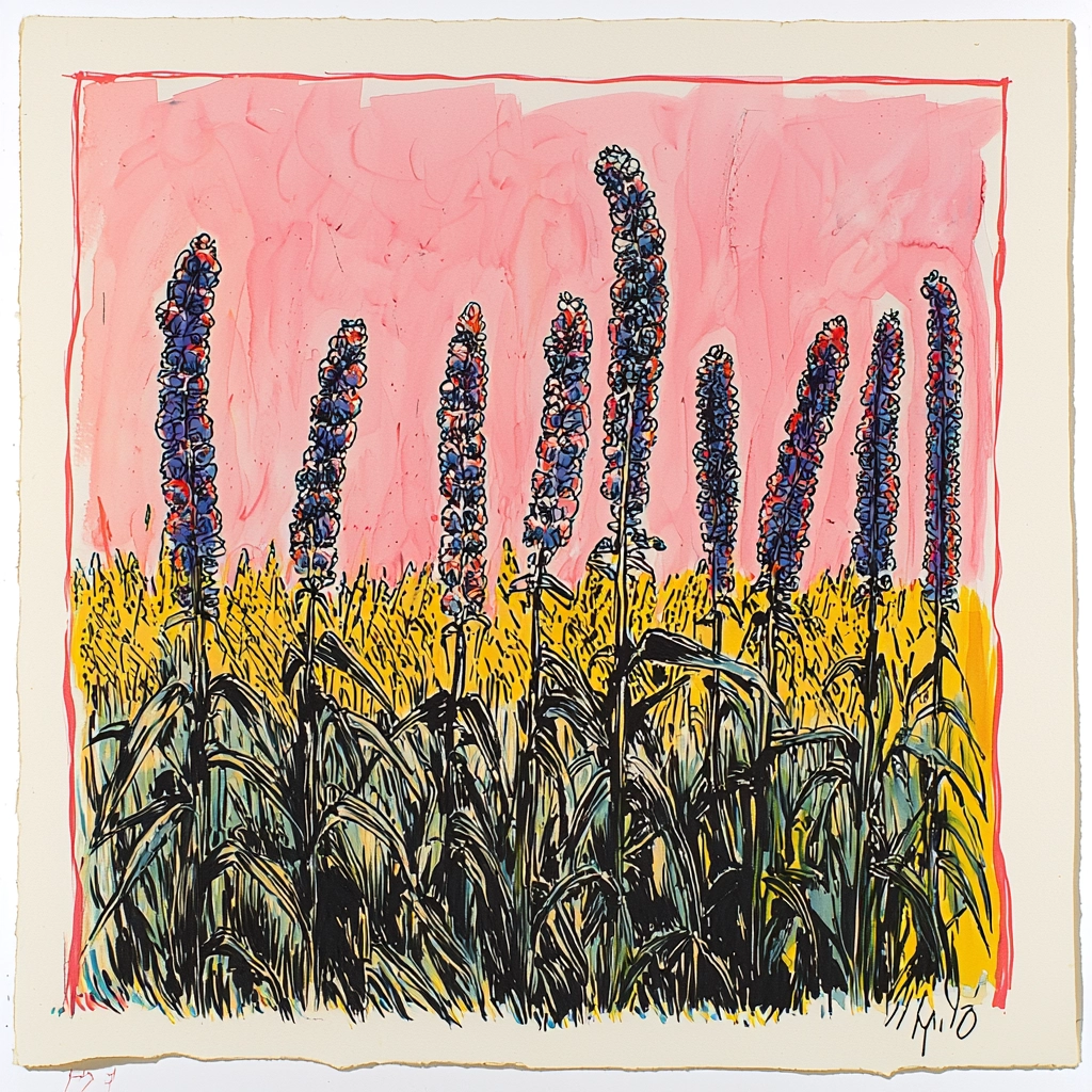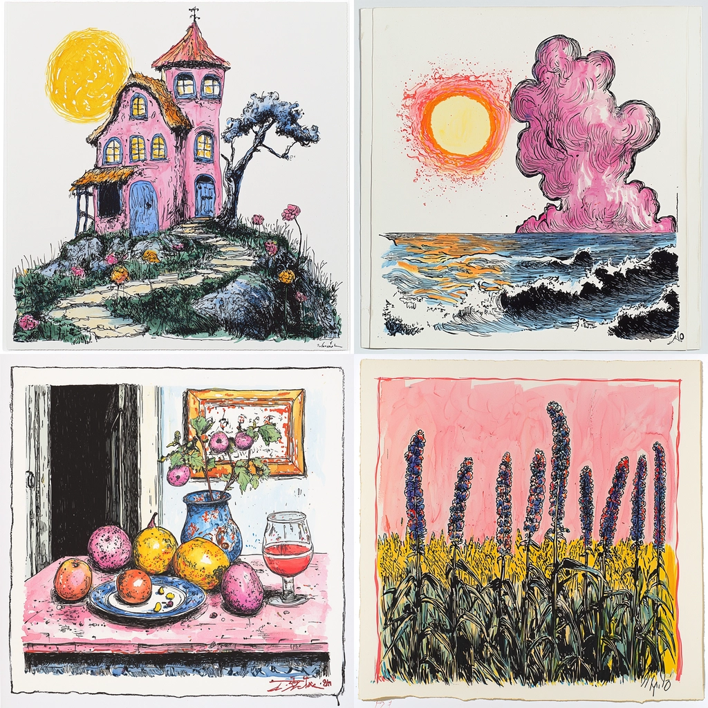 The artwork displays dynamic lighting and vibrant color contrasts, emphasizing expressive use of pink and yellow alongside textural brushwork. Strong outlines delineate colorful, spirited elements, creating a sense of depth and texture.