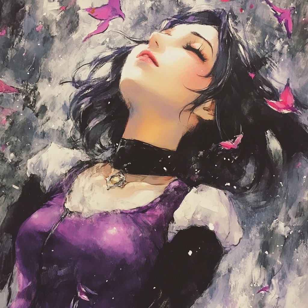 Rich purples and pinks contrast against a textured black background, highlighting dynamic motion through vivid brush strokes.