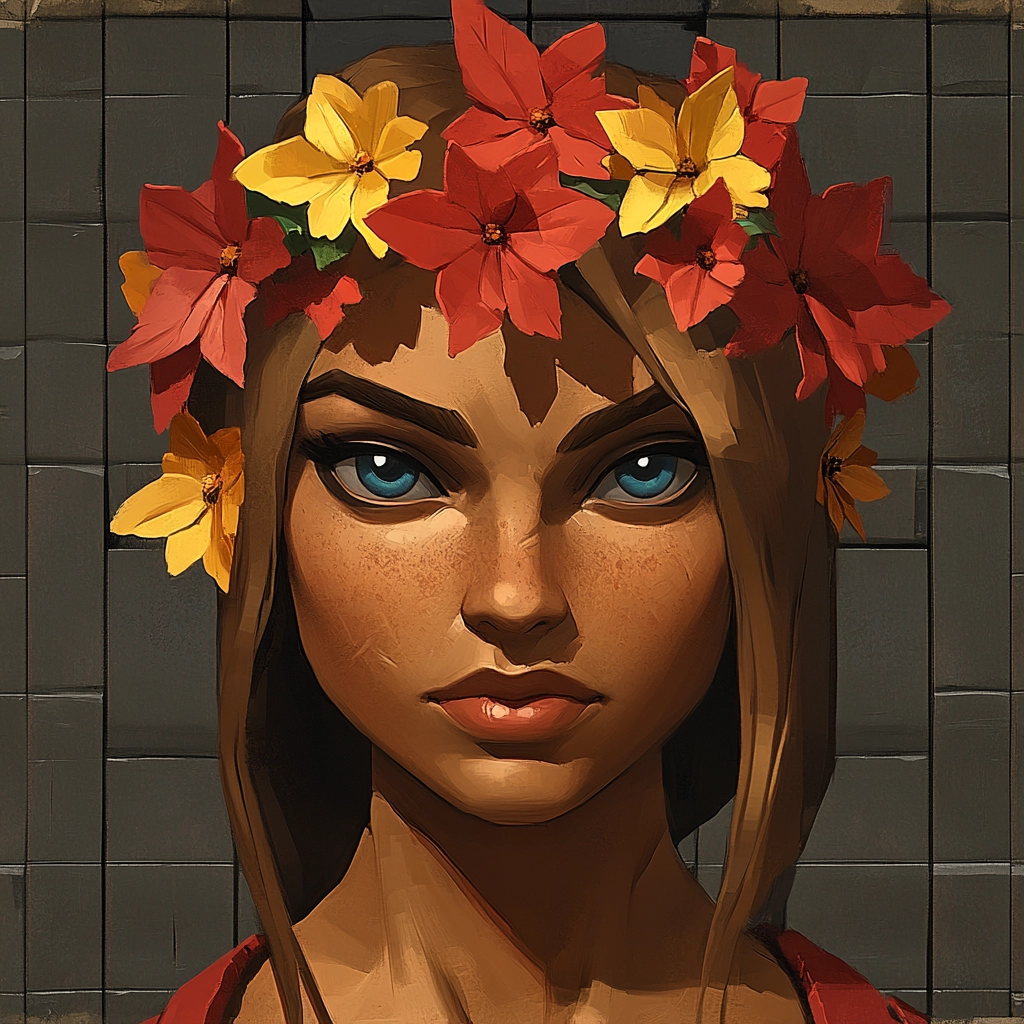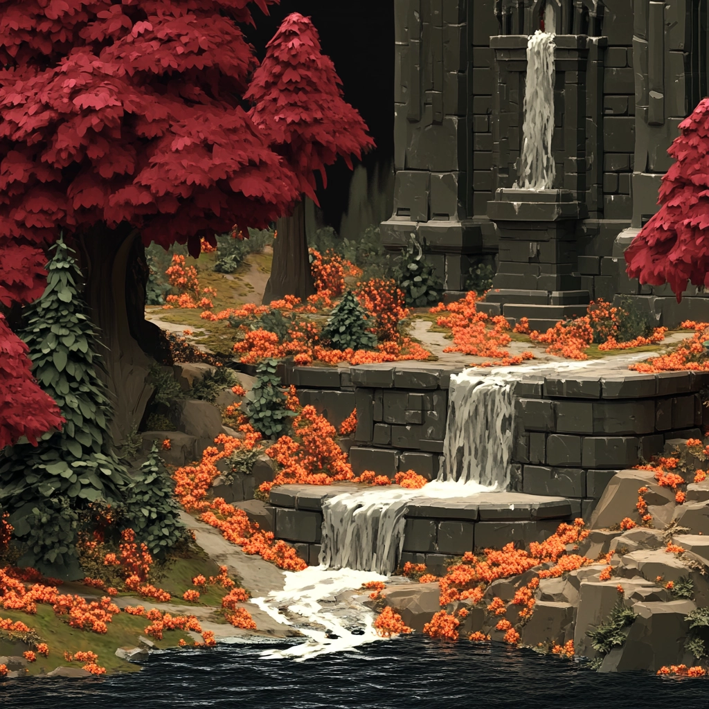 The imagery features strong lighting effects that amplify the vividness of reds, paired with warm golds, enhancing the textural detail and dimensional depth in the composition.