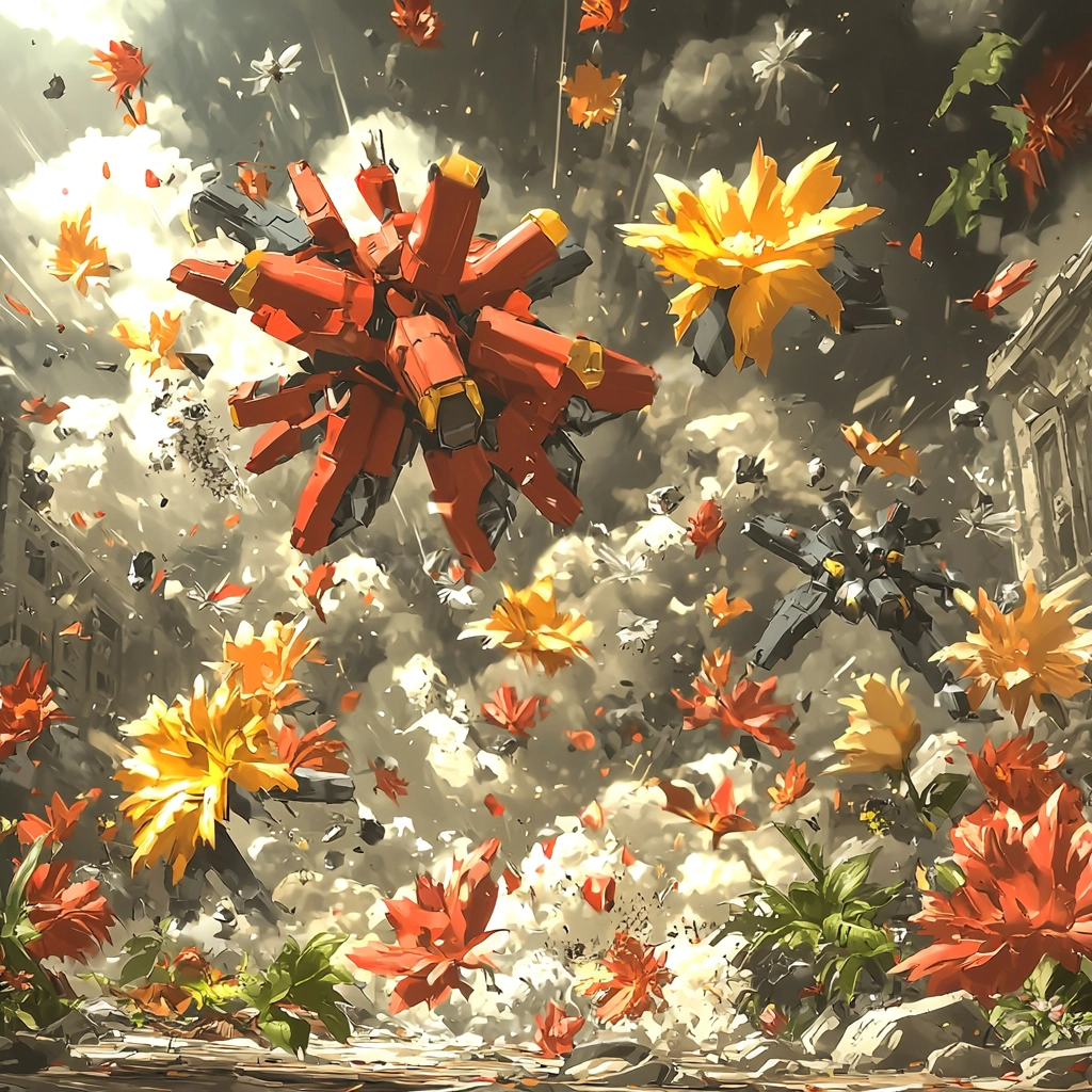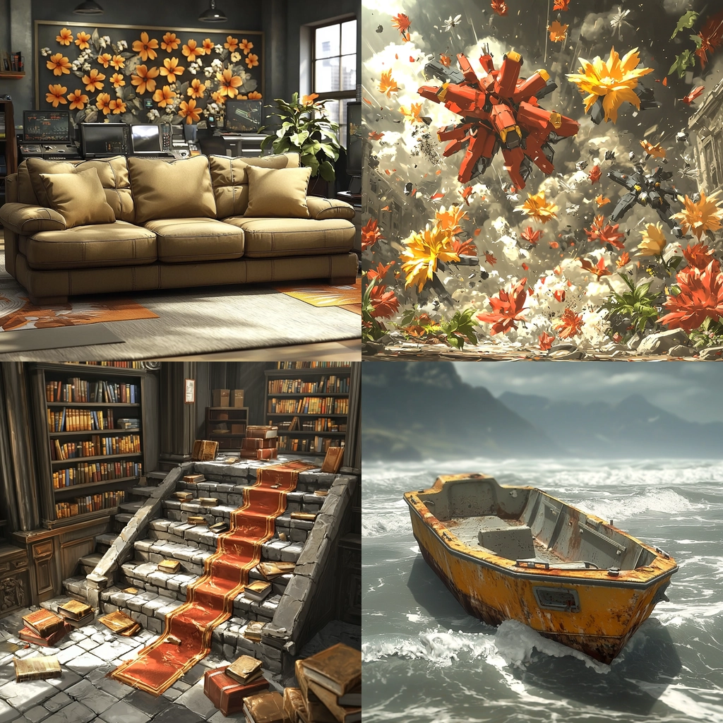 This combination features strategic lighting that highlights texture and spatial separation, with shadows enhancing dimensional effects. The main colors create cohesive harmony against more muted backgrounds, supported by a rich tapestry of occluded textures to form a complex sense of depth and movement.